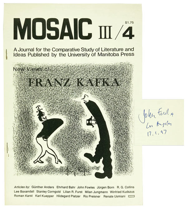 University of Manitoba Press: Winnipeg, 1970. Very Good +. [Winnipeg]: University of Manitoba Press, 1970. Offprint from Mosaic 3, vol. 4. Signed by John Fowles at start of essay, dated 1997. Octavo. [31] - 41. Stapled wraps. Light rubbing to edges of wraps. Binding sound and pages unmarked.