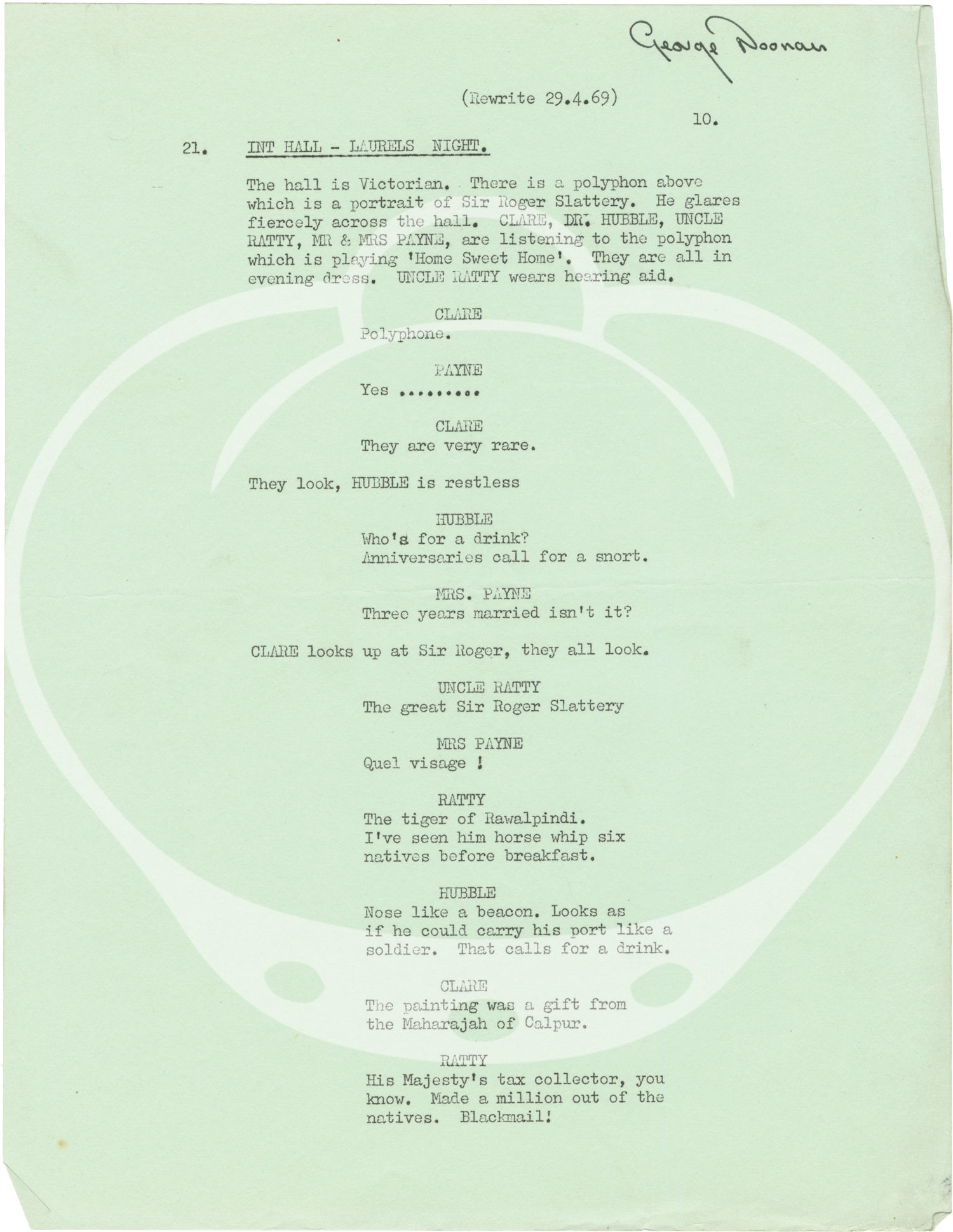 London: Gallu Productions, 1969. Draft script for the 1969 British film. Copy belonging to an unknown crew member, with their name in manuscript ink on the front wrapper and one revision page.