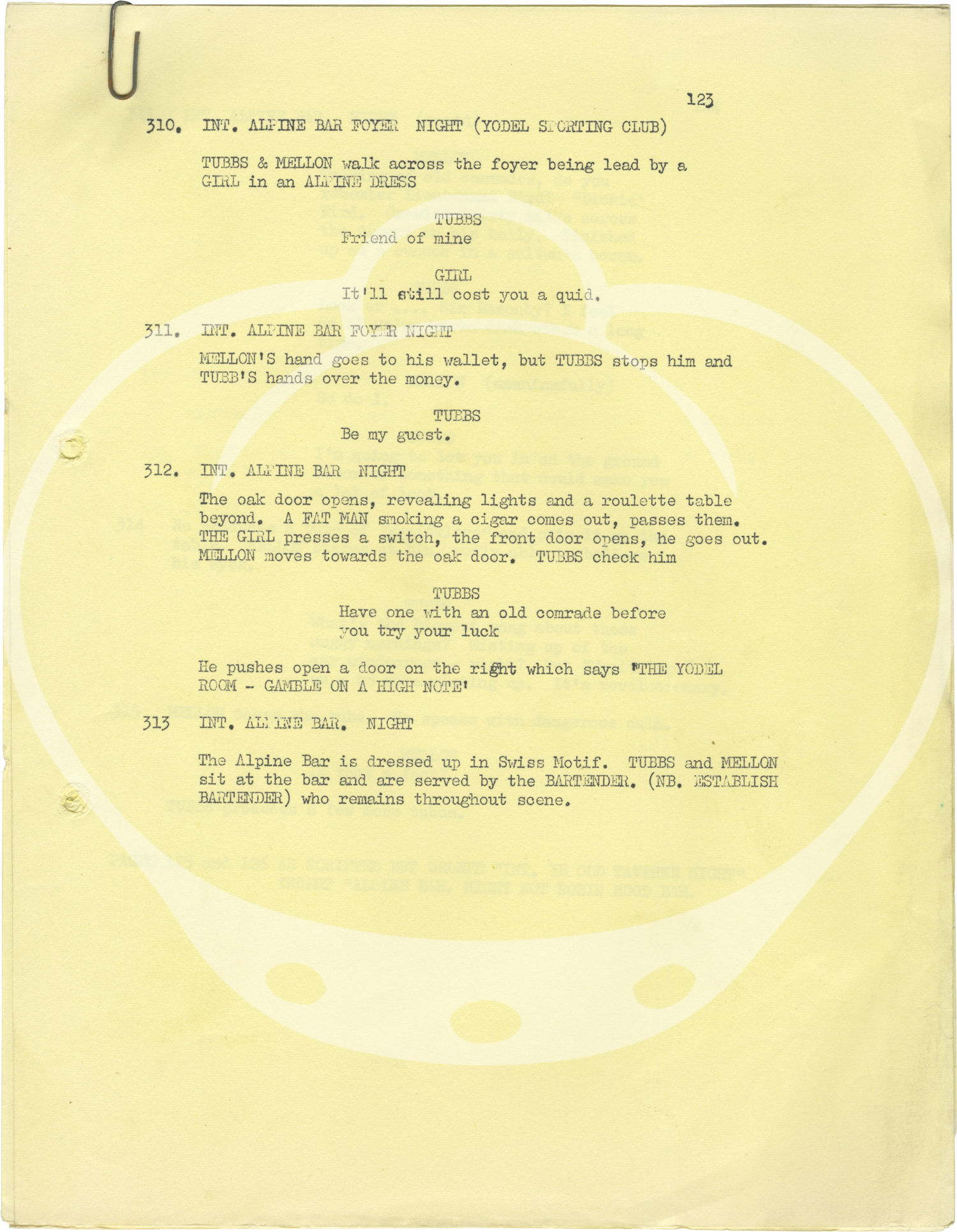 Blue titled wrappers. Title page present, undated, with credits for screenwriters Julian Symons, Beverley Cross, John Esmonde, and Bob Larbey. 152 leaves, with last page of text numbered 142. Xerographic duplication, rectos only, with blue and pink revision pages laid in throughout, dated 29.4.69. Pages and wrapper Very Good plus, with light rust near the binding, bound with a silver prong.