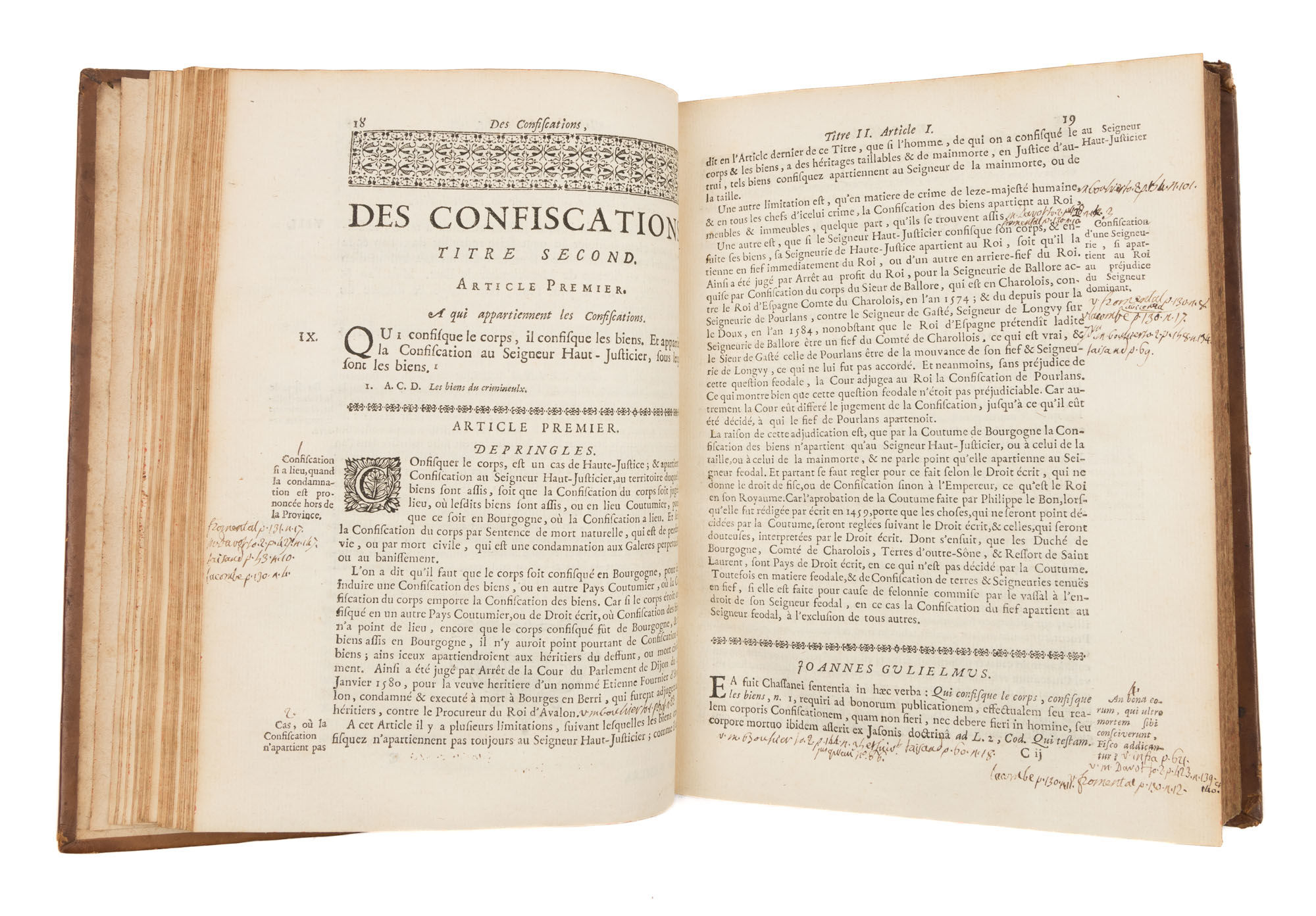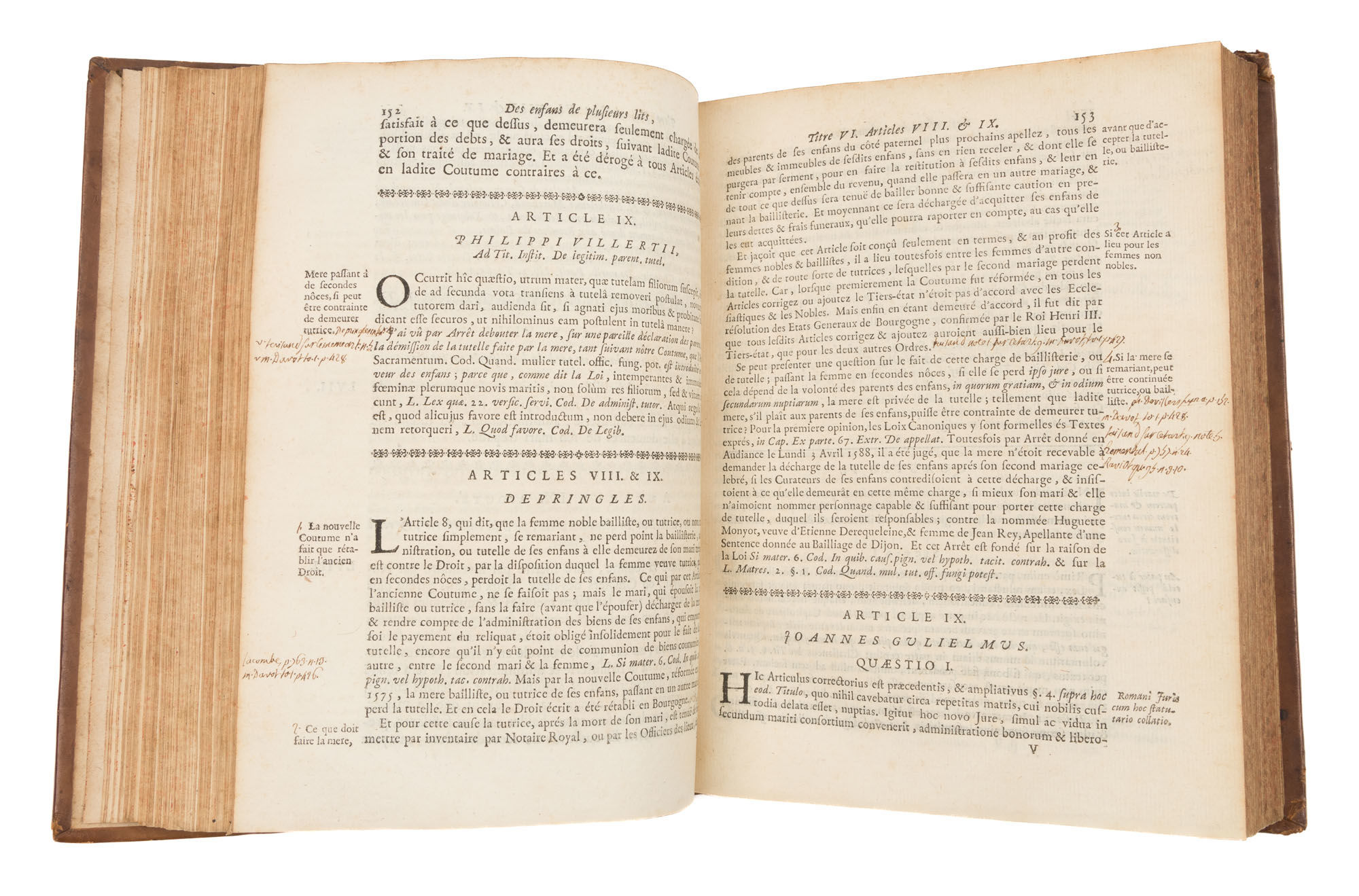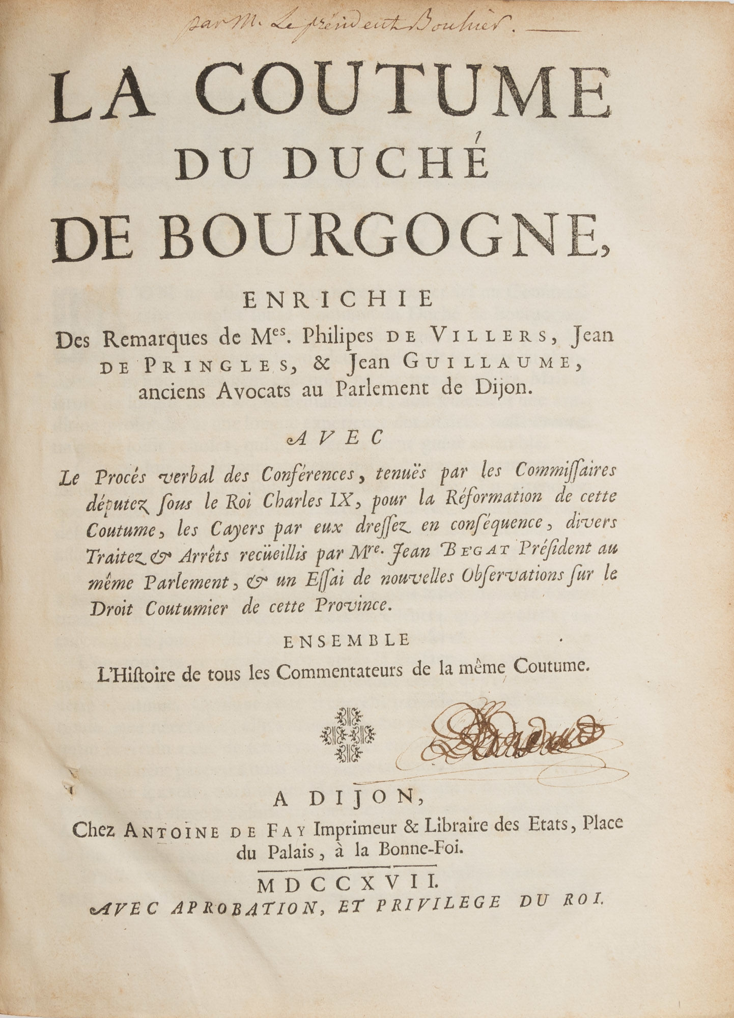 1717. Dijon: Chez Antoine de Fay, 1717.. Dijon: Chez Antoine de Fay, 1717. An Edition of the Coutume of Burgundy with Contemporary Annotations [Bouhier, Jean (1673-1746), Compiler]. Villers, Philippe de [1545-1622], Commentary. Despringles, Jean [1550-1629], Commentary. Guillaume, Jean, Commentary. La Coutume du Duche de Bourgogne, Enrichie des Remarques de Mes. Philipes de Villers, Jean de Pringles, & Jean Guillaume, Anciens Avocats au Parlement de Dijon. Avec le Proces Verbal des Conferences, Tenues par les Commissaires Deputez sous le Roi Charles IX, Pour la Reformation de Cette Coutume, Les Cayers par eux Dressez en Consequence, Divers Traitez & Arrets Recueillis par Mre. Jean Begat President au Meme Parlement, & Un Essai de Nouvelles Observations sur le Droit Coutumier de Cette Province. Ensemble L'Histoire de Tous les Commentateurs de la Meme Coutume. Dijon: Chez Antoine de Fay Imprimeur & Libraire des Etats, 1717. [ii], lxiv, 724, [2] pp. Quarto (9" x 6-3/4"; 22.9 x 17.1 cm). Contemporary calf, blind rules to boards, gilt spine with raised bands and lettering piece, gilt tooling to board edges, edges of text block rouged. Light rubbing and a few minor scuffs, scratches and small stains to boards, moderate rubbing to extremities, joints starting at ends, lettering piece loosening and lightly edgeworn, corners bumped and lightly worn, hinges starting. Light toning to interior, occasional light foxing, light soiling and finger smudges to a few leaves, early annotation ("par M. Le president Bouhier") and struck-through ownership signature to title page, occasional annotations throughout in a single early hand. $1,500. * Only edition. The coutume of the duchy of Burgundy in eastern France, which governed five baillages, was codified in 1459 and reformed in 1575. This edition of the coutume was compiled by Jean Bouhier, an eminent French magistrate and the first president of the parlement of Burgundy from 1704-1729. The annotations to our copy include many references to Bouhier's other works. The annotator also takes an interest in passages discussing the scope of customary law and makes notes on such topics as succession and family law. OCLC locates 5 copies in North American law libraries (Harvard, University of Pennsylvania, George Washington University, Columbia University, Northwestern University). Gouron and Terrin, Bi.