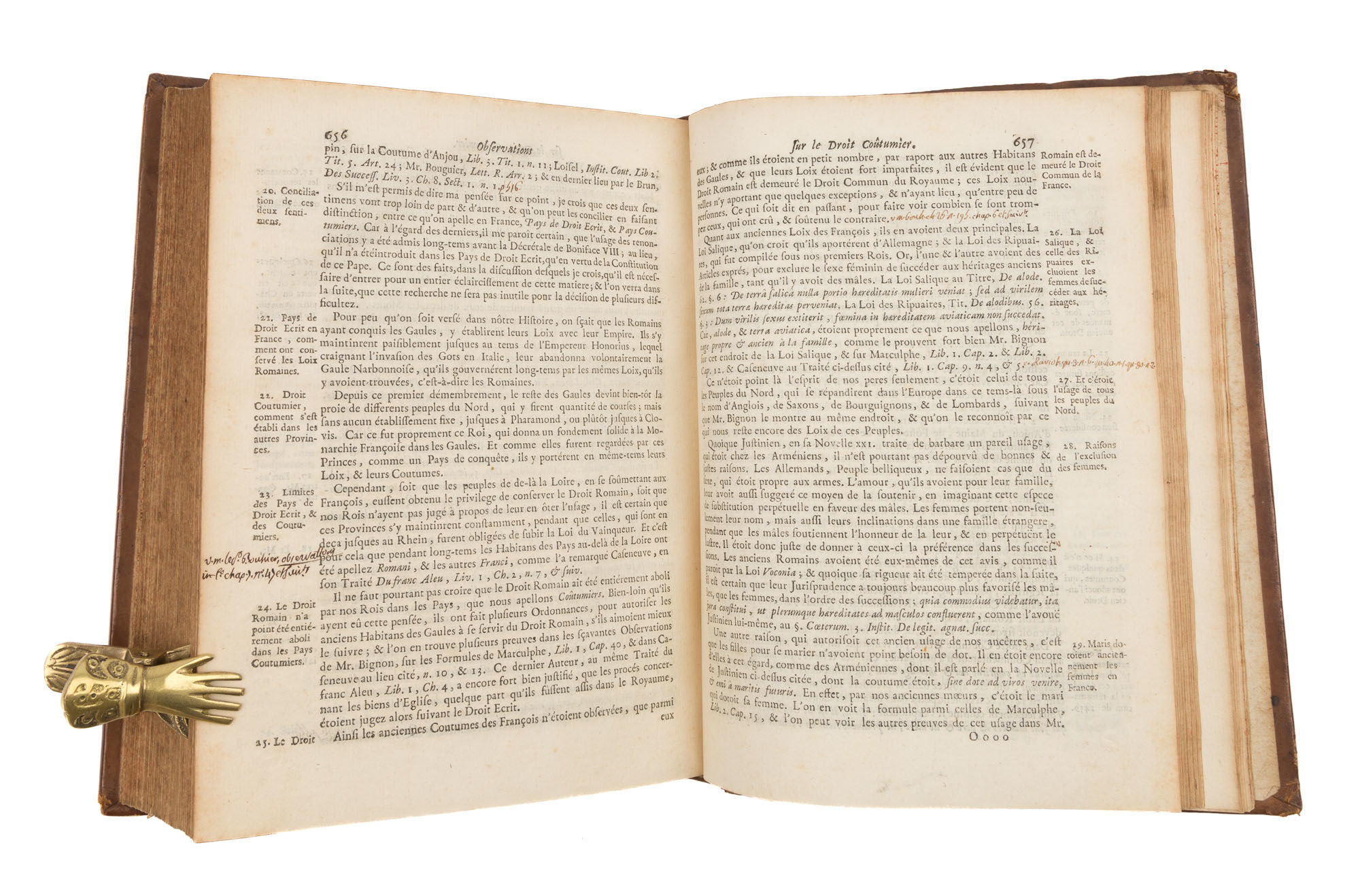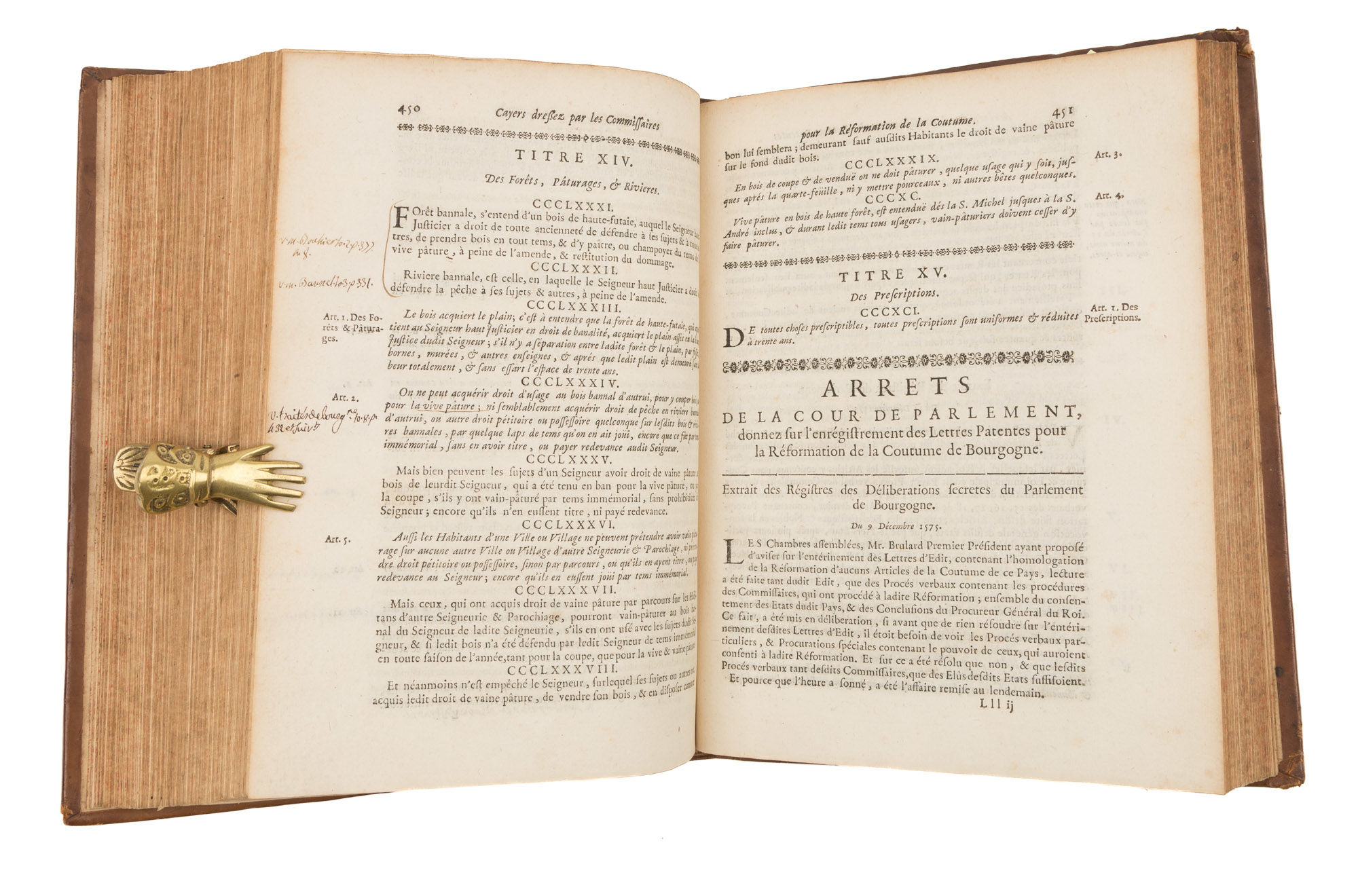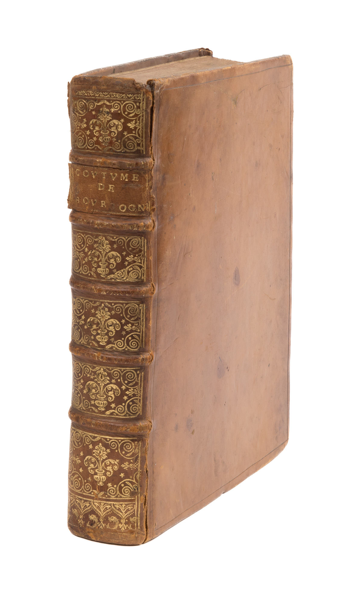 1717. Dijon: Chez Antoine de Fay, 1717.. Dijon: Chez Antoine de Fay, 1717. An Edition of the Coutume of Burgundy with Contemporary Annotations [Bouhier, Jean (1673-1746), Compiler]. Villers, Philippe de [1545-1622], Commentary. Despringles, Jean [1550-1629], Commentary. Guillaume, Jean, Commentary. La Coutume du Duche de Bourgogne, Enrichie des Remarques de Mes. Philipes de Villers, Jean de Pringles, & Jean Guillaume, Anciens Avocats au Parlement de Dijon. Avec le Proces Verbal des Conferences, Tenues par les Commissaires Deputez sous le Roi Charles IX, Pour la Reformation de Cette Coutume, Les Cayers par eux Dressez en Consequence, Divers Traitez & Arrets Recueillis par Mre. Jean Begat President au Meme Parlement, & Un Essai de Nouvelles Observations sur le Droit Coutumier de Cette Province. Ensemble L'Histoire de Tous les Commentateurs de la Meme Coutume. Dijon: Chez Antoine de Fay Imprimeur & Libraire des Etats, 1717. [ii], lxiv, 724, [2] pp. Quarto (9" x 6-3/4"; 22.9 x 17.1 cm). Contemporary calf, blind rules to boards, gilt spine with raised bands and lettering piece, gilt tooling to board edges, edges of text block rouged. Light rubbing and a few minor scuffs, scratches and small stains to boards, moderate rubbing to extremities, joints starting at ends, lettering piece loosening and lightly edgeworn, corners bumped and lightly worn, hinges starting. Light toning to interior, occasional light foxing, light soiling and finger smudges to a few leaves, early annotation ("par M. Le president Bouhier") and struck-through ownership signature to title page, occasional annotations throughout in a single early hand. $1,500. * Only edition. The coutume of the duchy of Burgundy in eastern France, which governed five baillages, was codified in 1459 and reformed in 1575. This edition of the coutume was compiled by Jean Bouhier, an eminent French magistrate and the first president of the parlement of Burgundy from 1704-1729. The annotations to our copy include many references to Bouhier's other works. The annotator also takes an interest in passages discussing the scope of customary law and makes notes on such topics as succession and family law. OCLC locates 5 copies in North American law libraries (Harvard, University of Pennsylvania, George Washington University, Columbia University, Northwestern University). Gouron and Terrin, Bi.