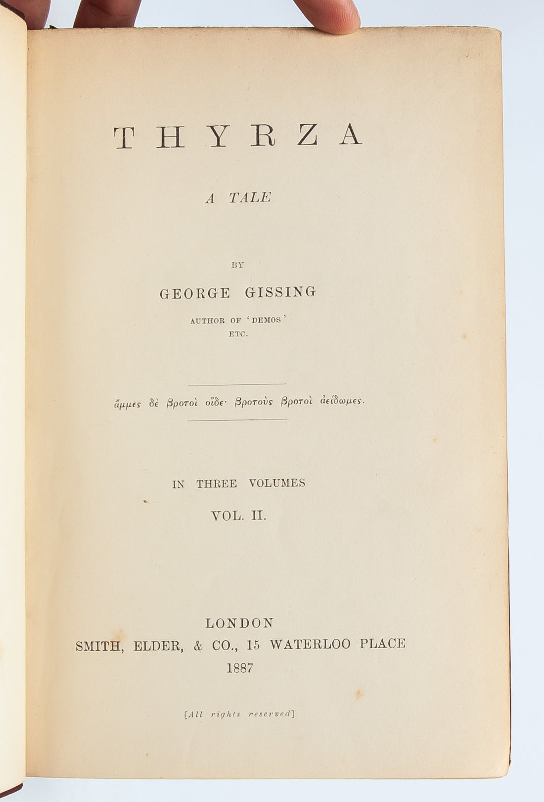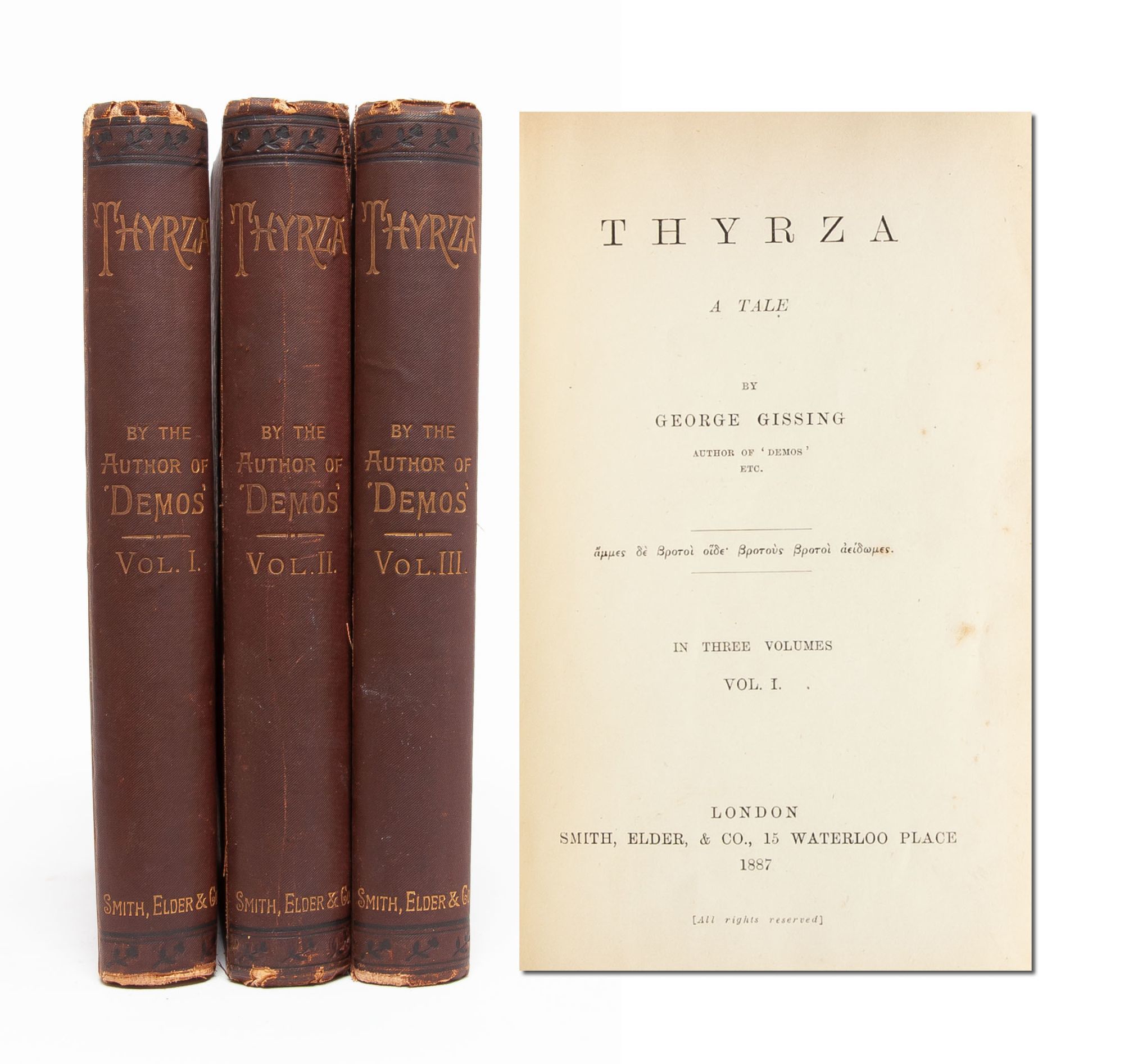 "George Gissing intended Thyrza to contain the very spirit of London working-class life. His story tells of Walter Egremont, an Oxford trained idealist who gives lectures on literature to workers, some of them from his father's Lambeth factory. Thyrza Trent, a young hat trimmer, meets and falls in love with him, forsaking Gilbert Grail, an intelligent working man who Egremont has put in charge of his library. In a tale of ambition, betrayal, and disillusionment, Gissing's heroine aspires to purity and self-improvement. Trapped by birth and circumstance, she is unable to escape her destiny. Thyrza Trent is the embodiment of Gissing's preoccupation with sex, class, and money. Through her, he exposes a society intrinsically opposed to social mobility" (Victorian Secrets). Very Good.