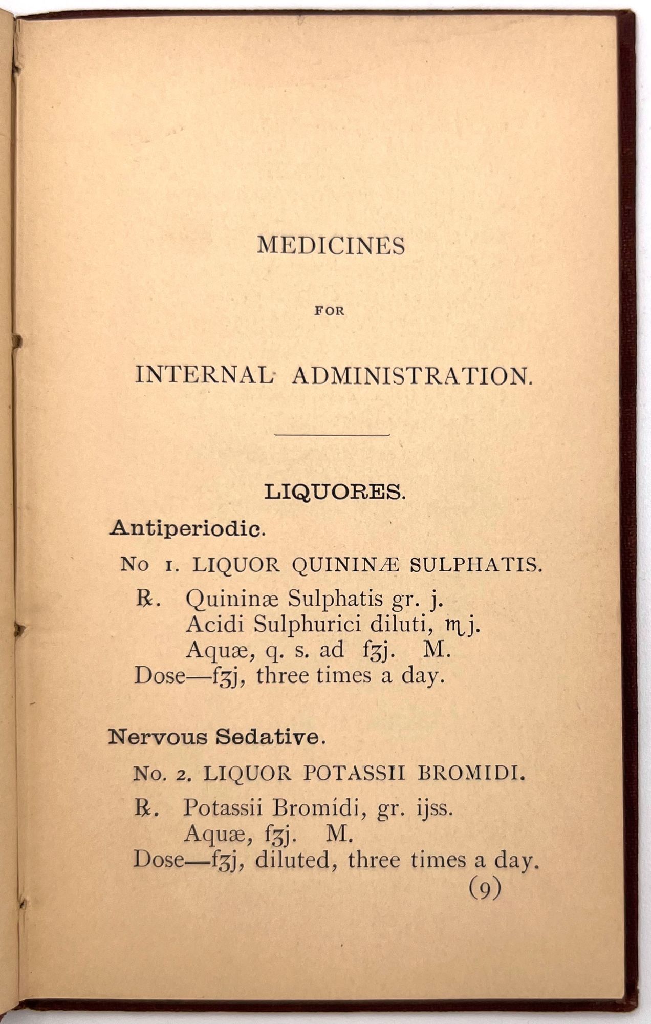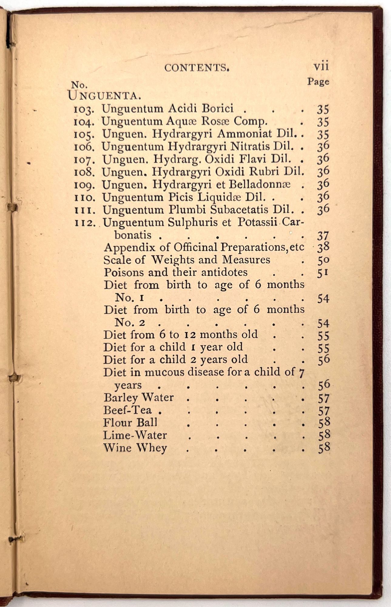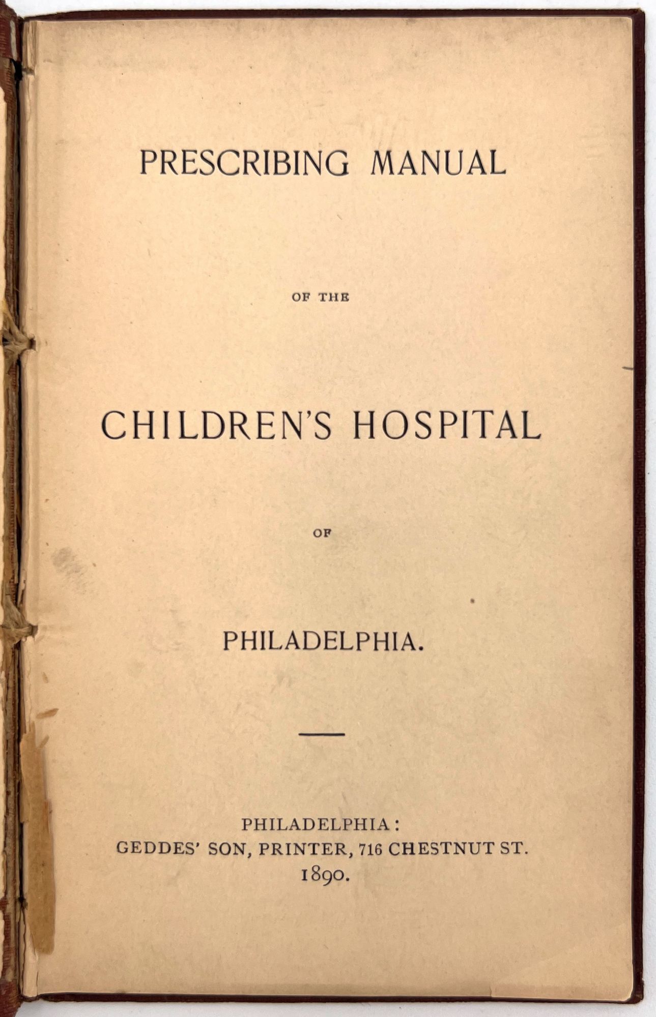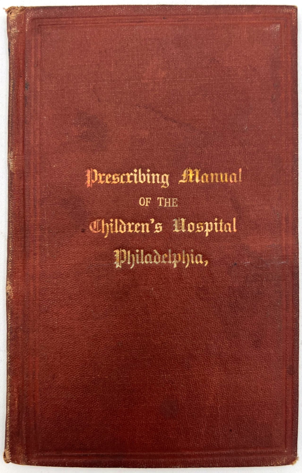 Philadelphia, Pennsylvania: Children's Hospital of Philadelphia, 1890. Good. Toned, hinges cracked with first two leaves loose, paper brittle. Extremities worn. A little dust soiling.. A valuable printed record of medicines prescribed by doctors at the Children's Hospital of Philadelphia from 1890. Also contains diet suggestions for children aged 6 months to 2 years. The Prescribing Manual is divided by medicine type (e.g. "Liquores", "Misturae", "Linimenta") and includes over 100 medicines, both internal and topical. 12mo (5.25" by 3.5"), pp. 58, sewn in original red pebbled cloth stamped in blind and gold. Ink signature of Austin D. Smith dated 1903 to front free endpaper; bookplate and ink stamp of the Mellin's Food Company Library to upper pastedown and front free endpaper, respectively, also dated 1903.