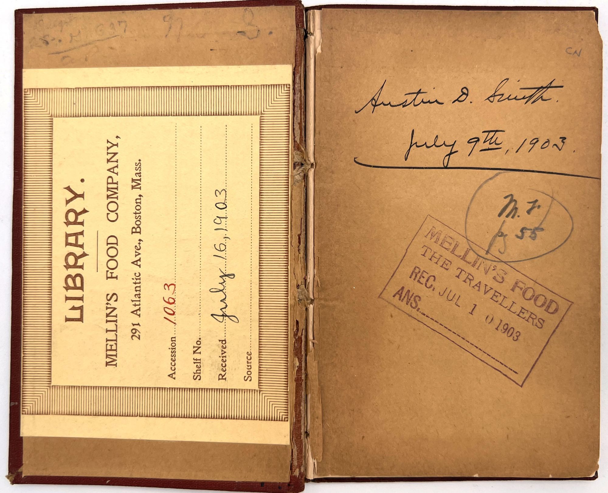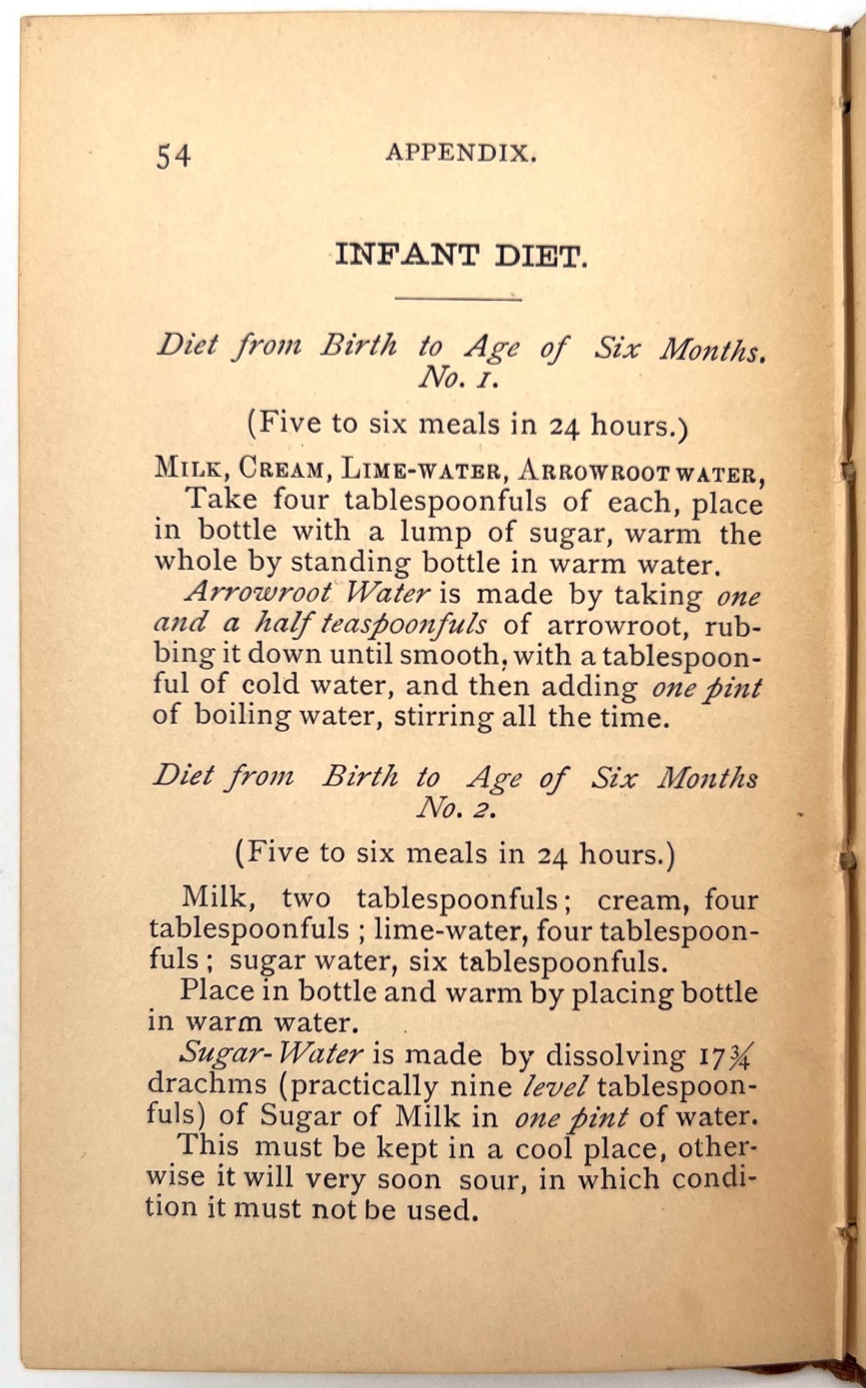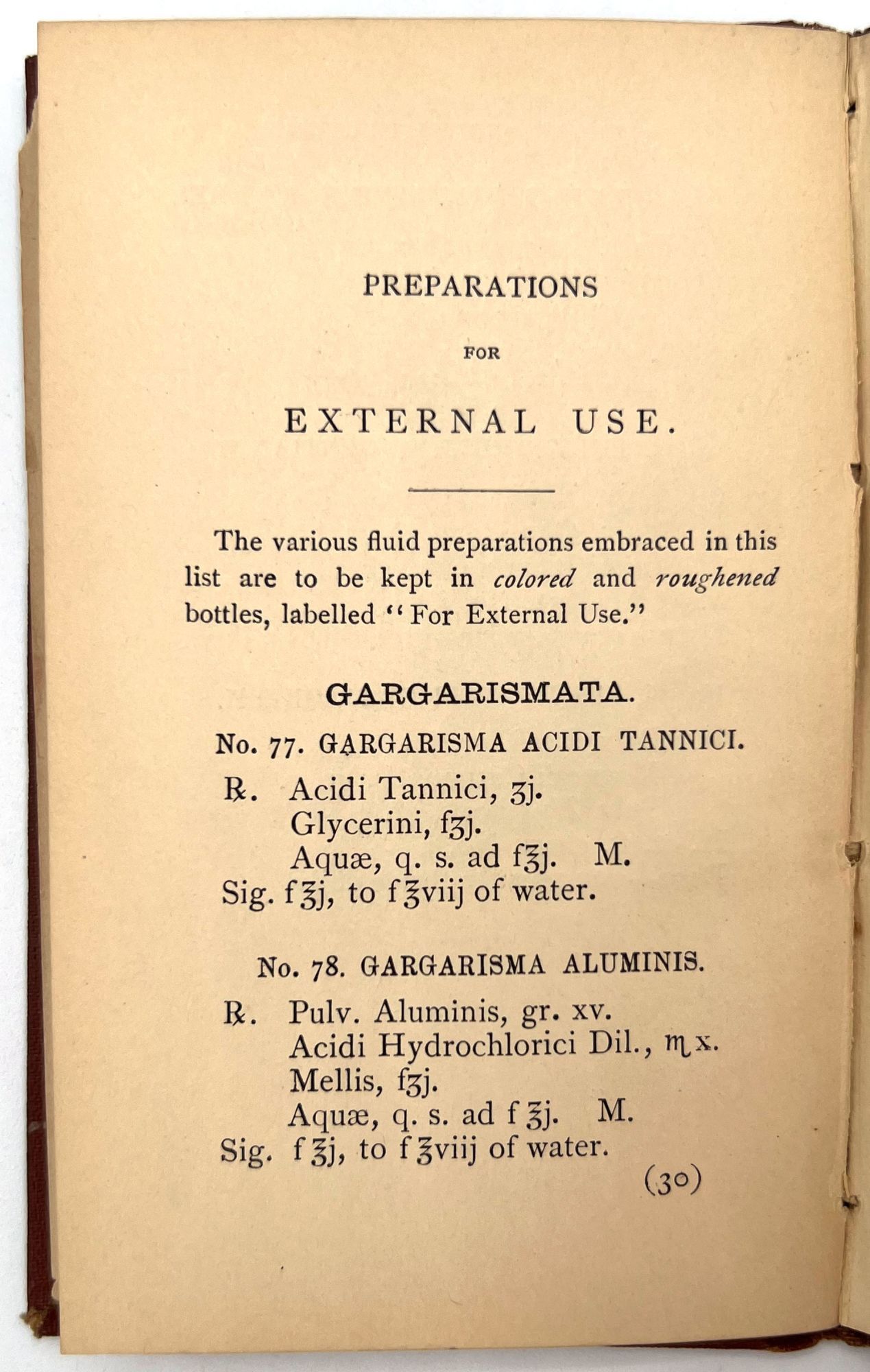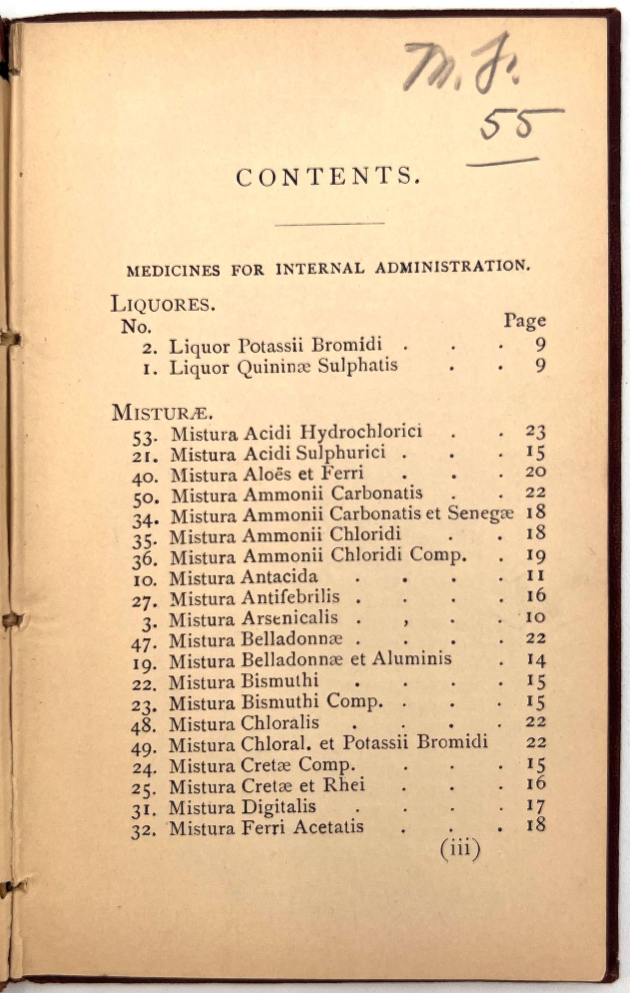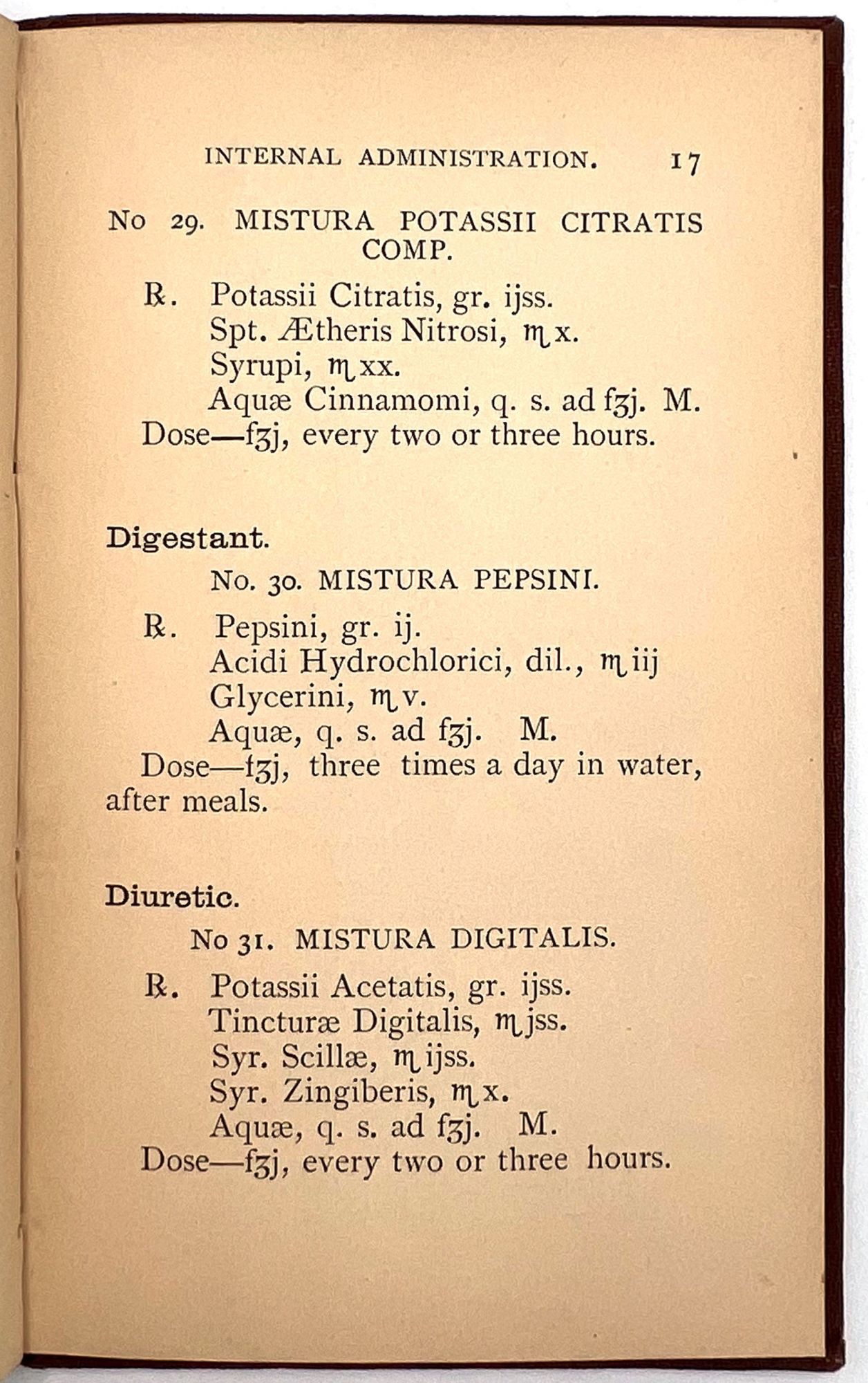 Philadelphia, Pennsylvania: Children's Hospital of Philadelphia, 1890. Good. Toned, hinges cracked with first two leaves loose, paper brittle. Extremities worn. A little dust soiling.. A valuable printed record of medicines prescribed by doctors at the Children's Hospital of Philadelphia from 1890. Also contains diet suggestions for children aged 6 months to 2 years. The Prescribing Manual is divided by medicine type (e.g. "Liquores", "Misturae", "Linimenta") and includes over 100 medicines, both internal and topical. 12mo (5.25" by 3.5"), pp. 58, sewn in original red pebbled cloth stamped in blind and gold. Ink signature of Austin D. Smith dated 1903 to front free endpaper; bookplate and ink stamp of the Mellin's Food Company Library to upper pastedown and front free endpaper, respectively, also dated 1903.