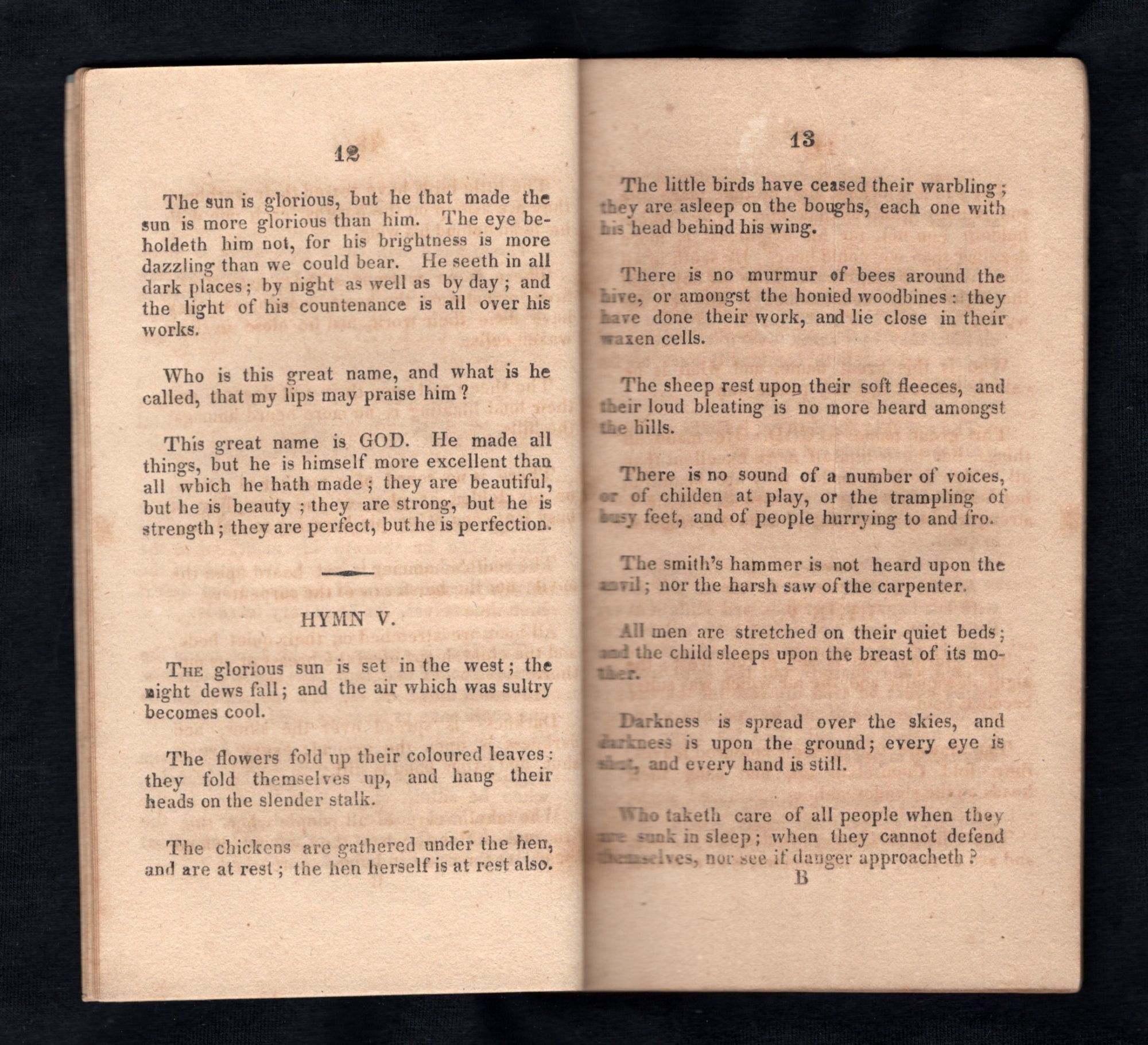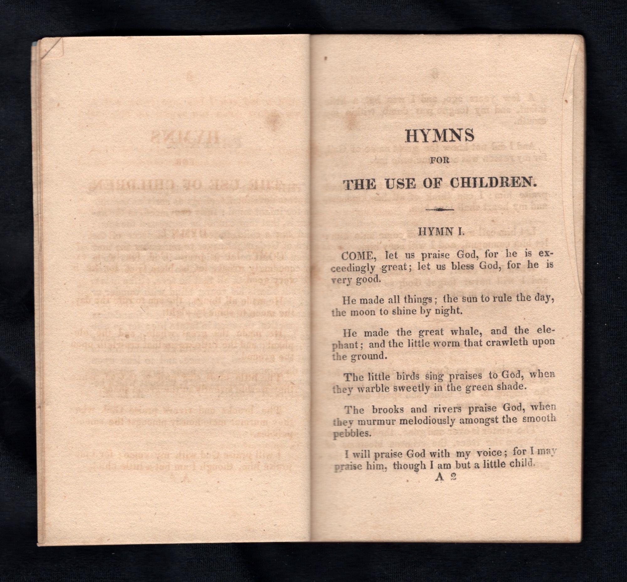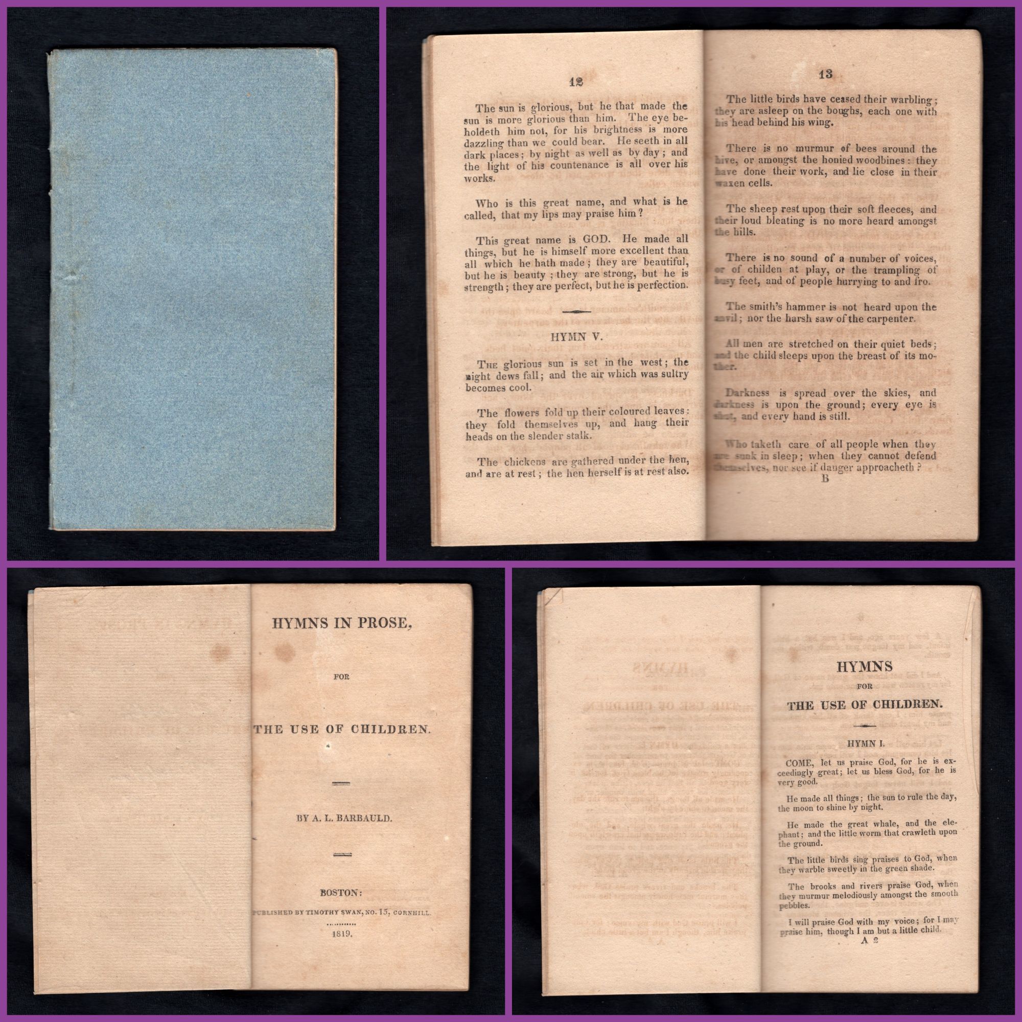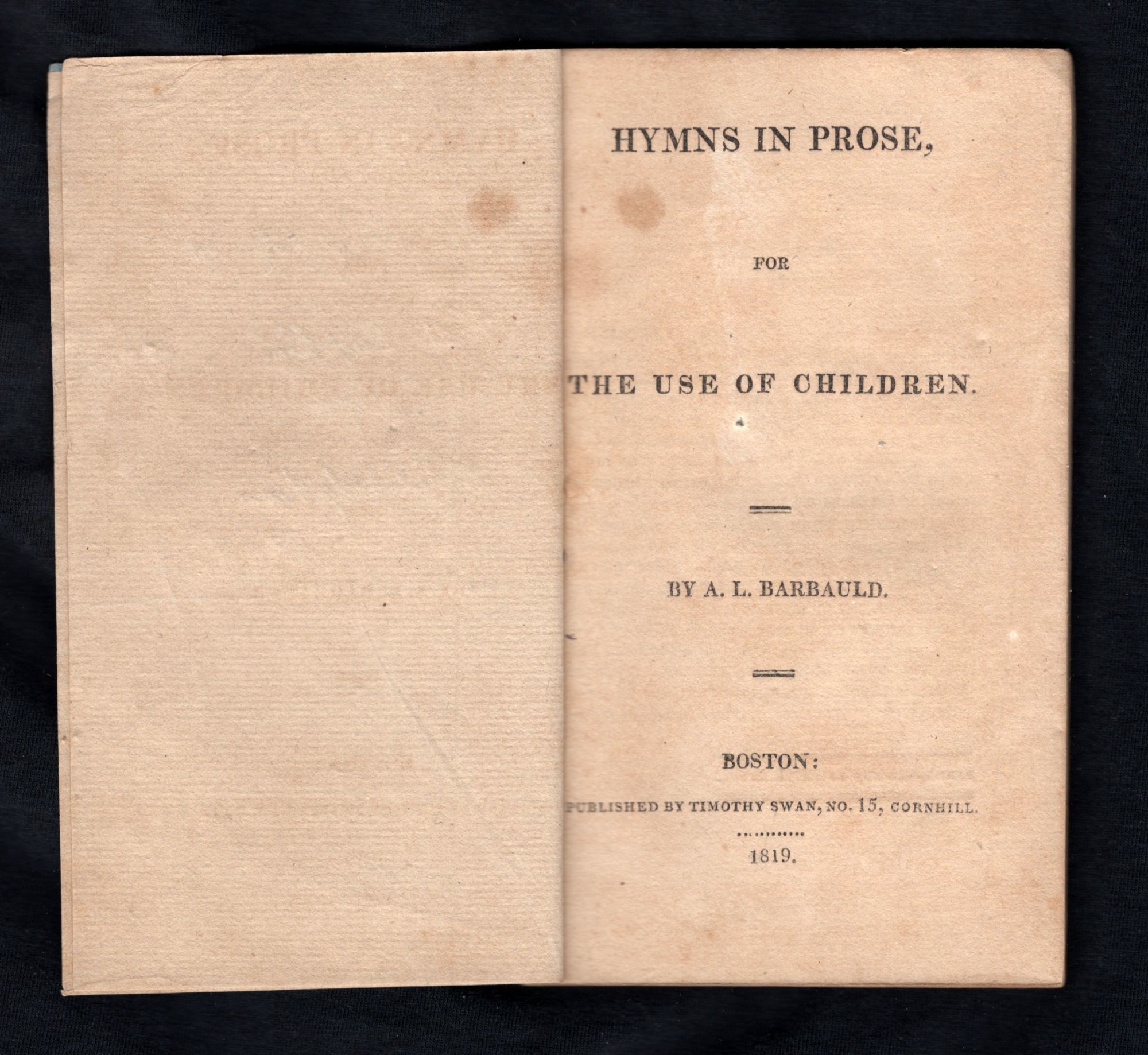 Boston, MA: Timothy Swan, 1819. General wear. Inscribed. Wrappers appear to have been replaced at some point.. The peculiar design of this publication is, to impress devotional feelings as early as possible on the infant mind; fully convinced, as the author is, that they cannot be impressed too soon; and that a child, to fill the full force of the idea of God, ought to never remember the time when he had no such idea..." To facilitate this goal, the booklet has twelve (12) hymns meant for children, mostly praising God in general, though often reflecting on specific parts of nature or people (like one's parents) that children should be thankful for. The author of the book, A. L. Barbauld, was a woman, who is sometimes referred to as Mrs. Barbauld, with her full name being Anna Letitia Barbauld. Inscribed: "The Property of Miss Sophia Green, Philadelphia, PA." 32 pgs. Plain blue wrappers. Thread binding. OCLC 130 (March 2021). Printer: Parmenter and Balch. Measures 5 3/4" x 3 1/2