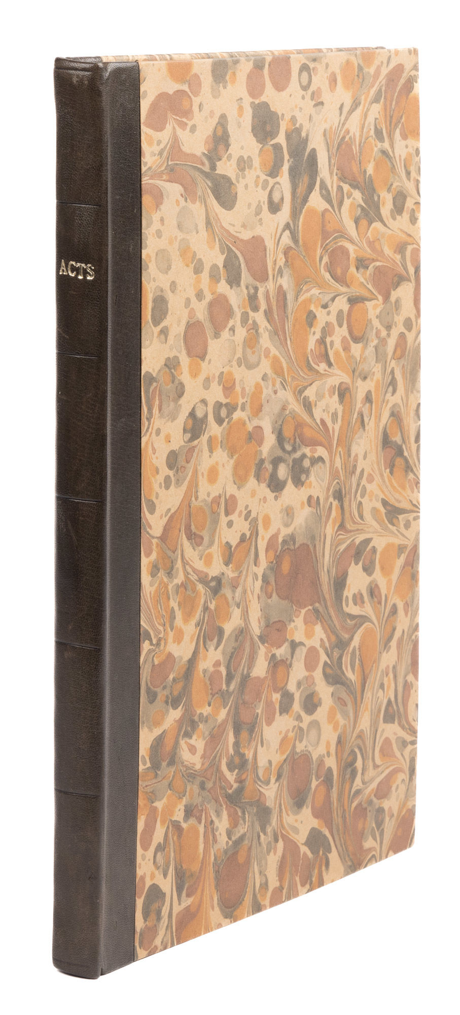 1552. Edward VI's Protestant Reforms [Great Britain]. [Statutes]. Edward VI [1537-1553], King of England. Anno Secundo, & Tertio, Edouardi Sexti. Actes Made in the Session of this Present Parliament, Holden Upon Prorogation at Westminster, The Fourth Day of November, In the Second Yeare of Our Most Dread Soveraign Lord Edward the VI. By the Grace of God, King of England, Fraunce and Ireland, Defendor of the Fayth, And of the Church of England, And Also of Irelande, In Earth the Supreme Heade: And There Continued and Kept to the XIIIJ Day of Marche, in the III. Yeare of Our Sayde SoVeraygne Lorde, As Foloweth. [London]: Richardus Graftonus [i.e. Richard Tottell?] Typographus Regius Excudebat, 1552 [i.e. 1557?]]. lxviij ff. Folio (10-3/4" x 7-1/4"). Recent quarter calf over marbled boards, blind fillets and gilt title to spine, endpapers renewed. Light toning to interior, minor worming to text block and lower gutter, no loss to legibility, occasional faint dampstaining, light soiling in a few places, a few folded corners, cracks in text block after first and before final leaves, clean tear to fore-edge of leaf B1 (fol. vij) not affecting text, early annotations to a few pages. $1,500. * Later edition. 39 public acts passed under Edward VI in 1548-1549. Some of the more interesting acts involve significant Protestant reforms to the English Church, including the Act of Uniformity, which established the Book of Common Prayer as the sole form of legal worship in England. Also included is the Clergy Marriage Act, which abolished the prohibition on marriage for priests in the Church of England. Beale, A Bibliography of Early English Law Books S224a. English Short-Title Catalogue S121643.