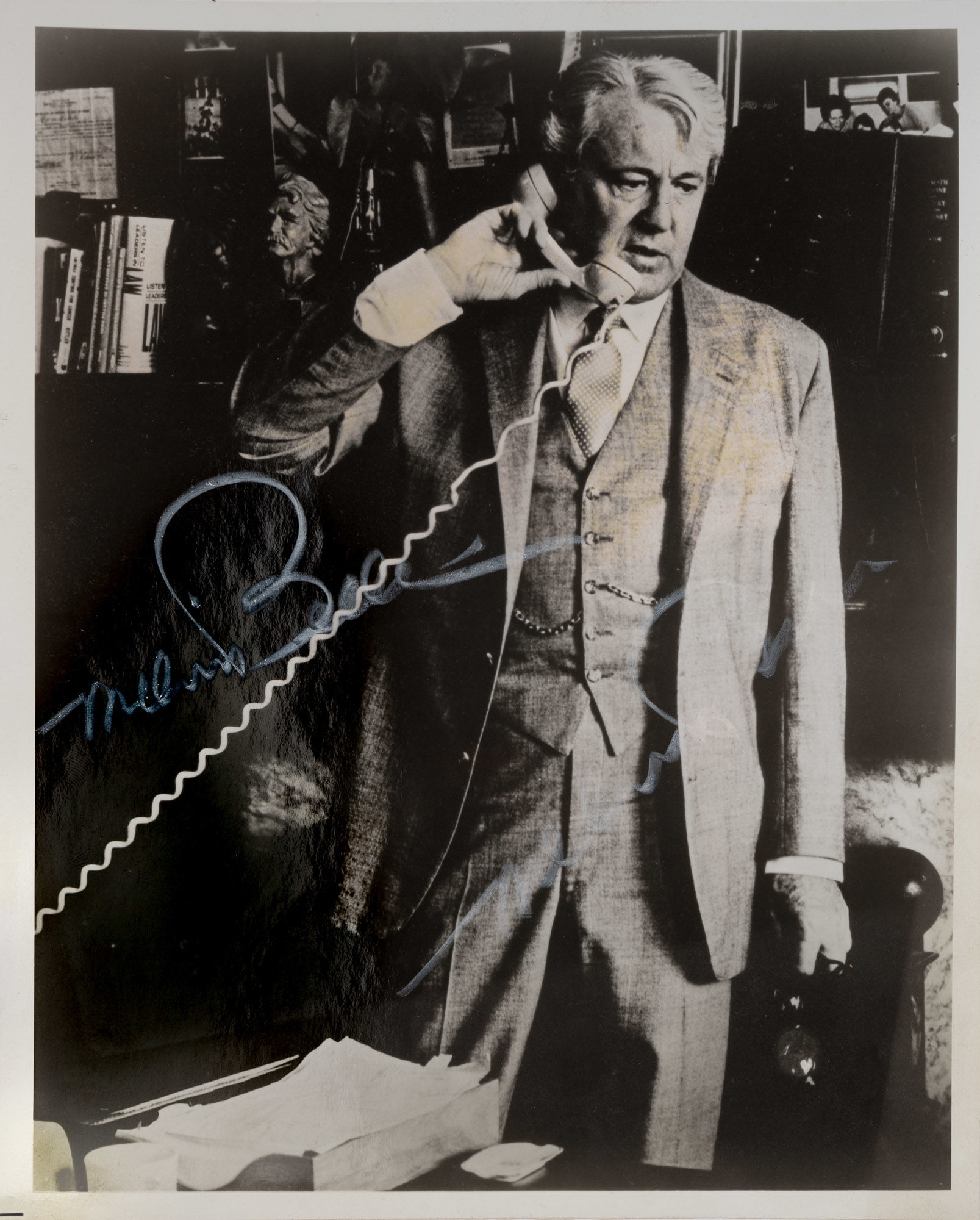 1970. The "King of Torts" Belli, Melvin M. [1907-1996]. [9-3/4" x 8" Signed Black-and-White Portrait Photograph of Melvin Belli]. N.p., c.1970. Light fading to image, small ink mark to verso, two autograph signatures of Melvin Belli in white pencil. $50. * Belli, a San Francisco attorney, was famous for his colorful personality, innovative use of graphic evidence and expert witnesses, important class-action cases on behalf of consumers and celebrity clients, such as the Rolling Stones, Muhammad Ali, Jim and Tammy Faye Bakker and Zsa Zsa Gabor. Known as the "King of Torts" and "Melvin Bellicose," he won over $600 million in damages for his clients over the course of his legal career.