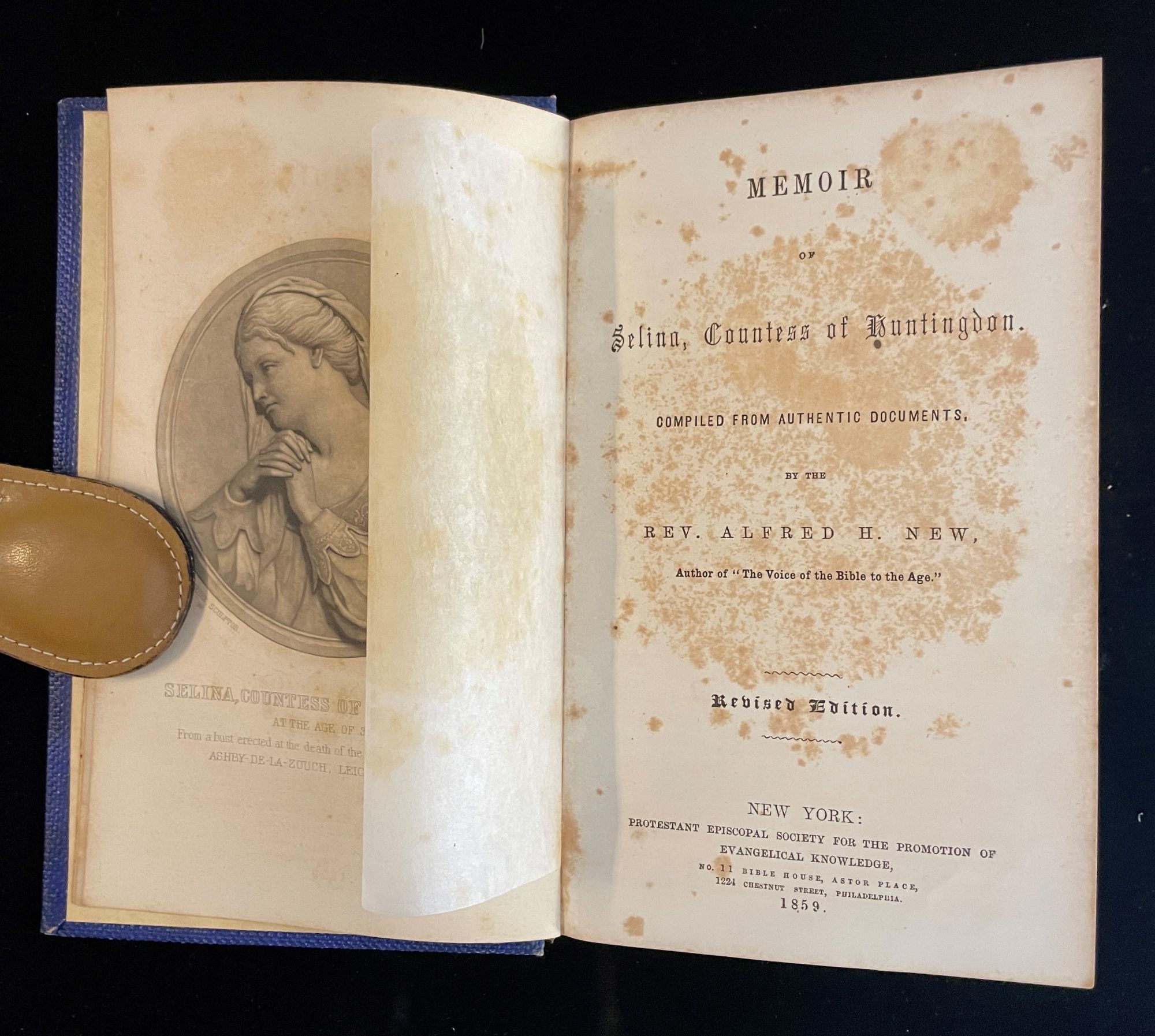 Philadelphia: Protestant Episcopal Society for the Promotion of Evangelical Knowlledge, 1859. 1st US Edition Thus. Hardcover. Very Good. Revised edition, stated on title page. 8vo, publisher's royal blue, pebbled cloth, blind-stamped and ruled front and rear, gilt to spine. xx, 21- 455, indexed. Slight lean to spine, two small spots front cover, moderately foxed, mostly at front and back. Selina Hastings, Countess of Huntingdon (1707 1791) was an English religious leader who played a prominent part in the religious revival of the 18th century and the Methodist movement in England and Wales. OCLC identifies 4 editions of this title in 44 libraries worldwide. Solid copy, particularly attractive for its period cloth binding.