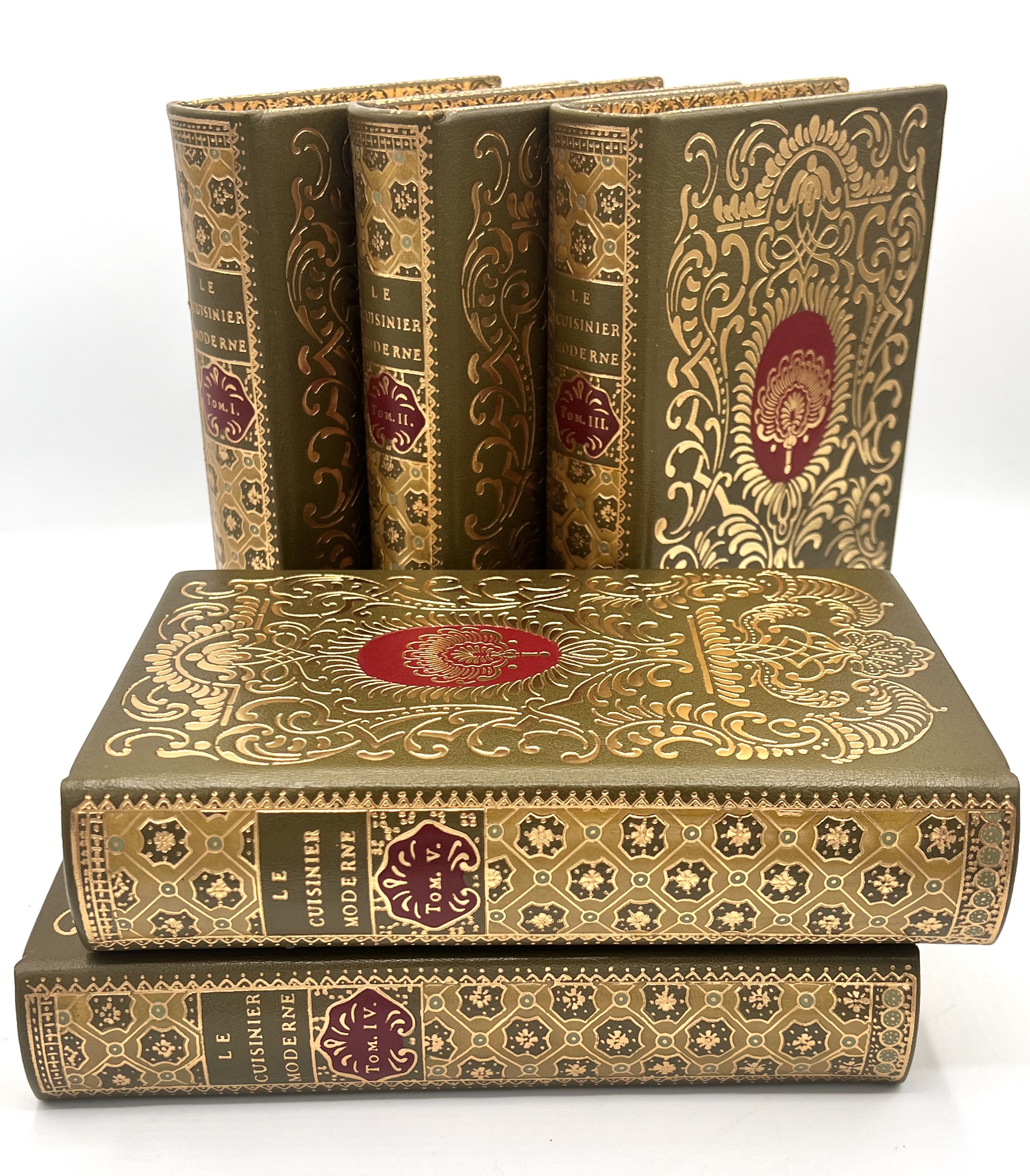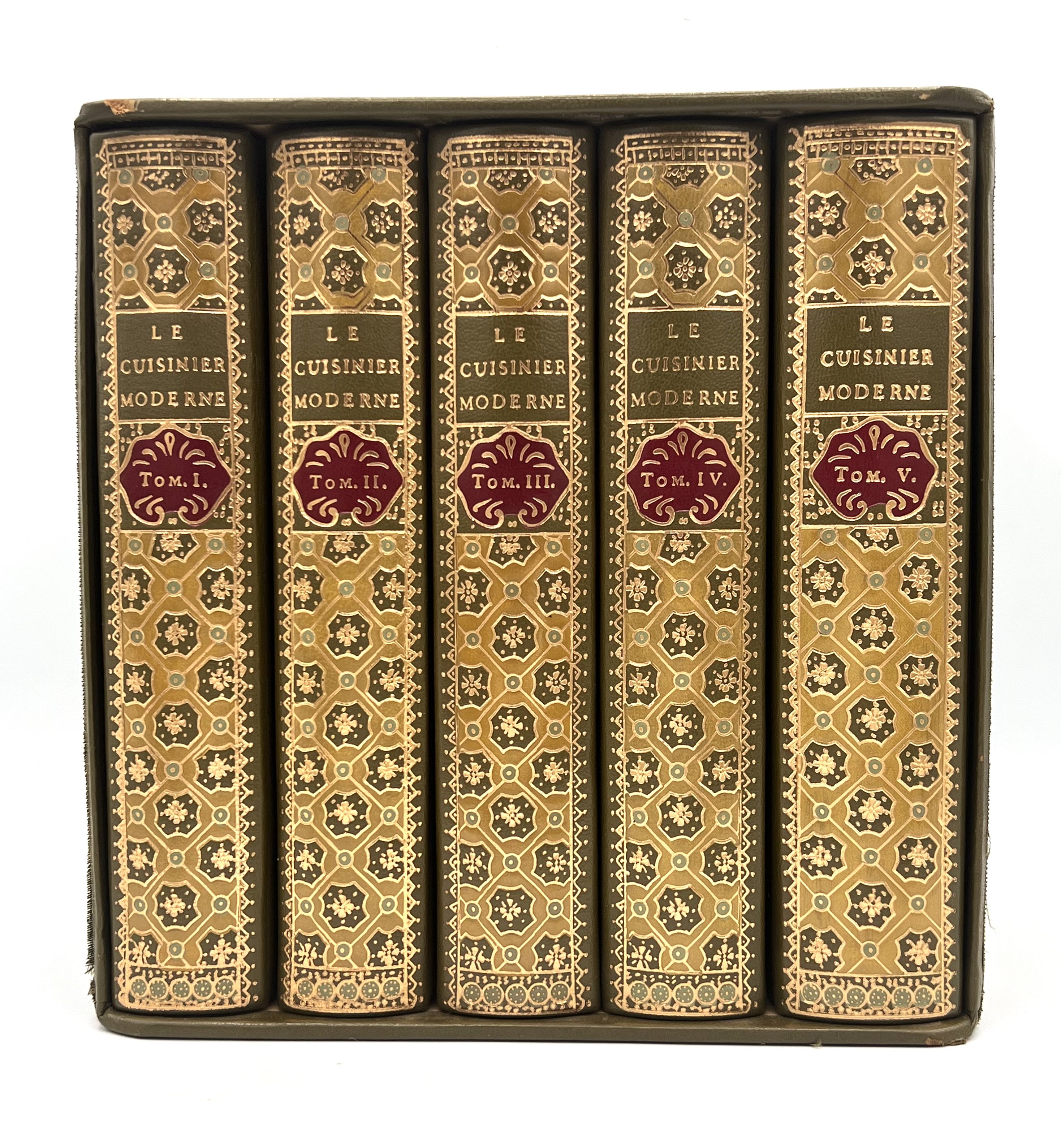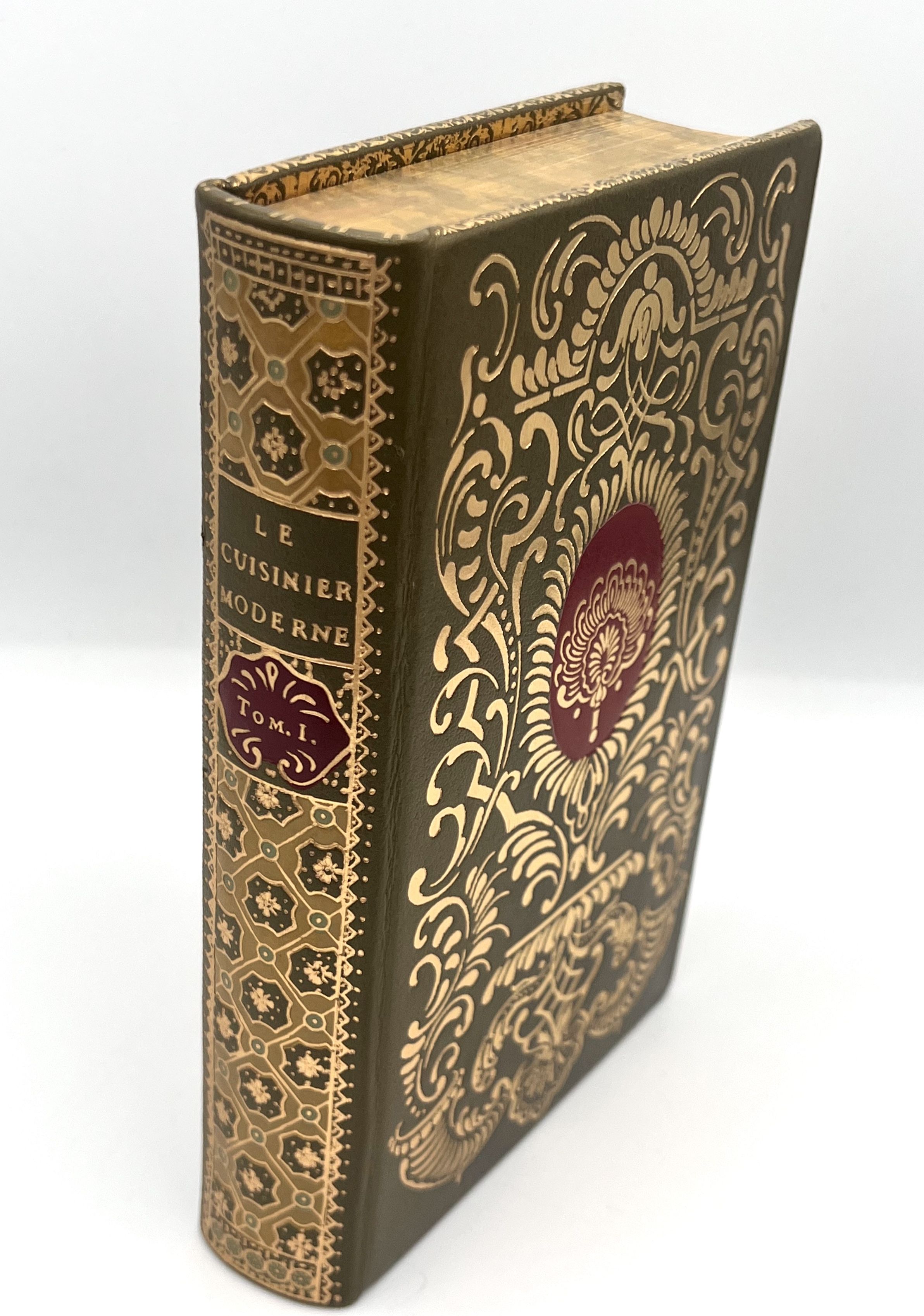 Luzarches, France: Daniel MORCRETTE, 1984 (1762). Hardcover. Green sheepskin, embossed and decorated in gilt. Fine, in very good dust wrapper. An exceptional facsimile of the first edition in French (1762 ). Limited edition #73 or 200, signed on colophon. One of the most important French culinary treatises of the 18th century - with over 2000 recipes, 13 plates and 5 tables. Considered by Carême, Escoffier and Nignon as most important work of its time. Daniel Morcrette, the publisher, was a leading collector of rare cookbooks who decided the rest of the world needed to be able to posses these near extinct cookbooks - so he decided to produce exquisite copies. Full green sheepskin binding with inlays and all edges gilt. Housed in a cloth covered slipcase. Interior and boards pristine, slipcase rubbed at edges.