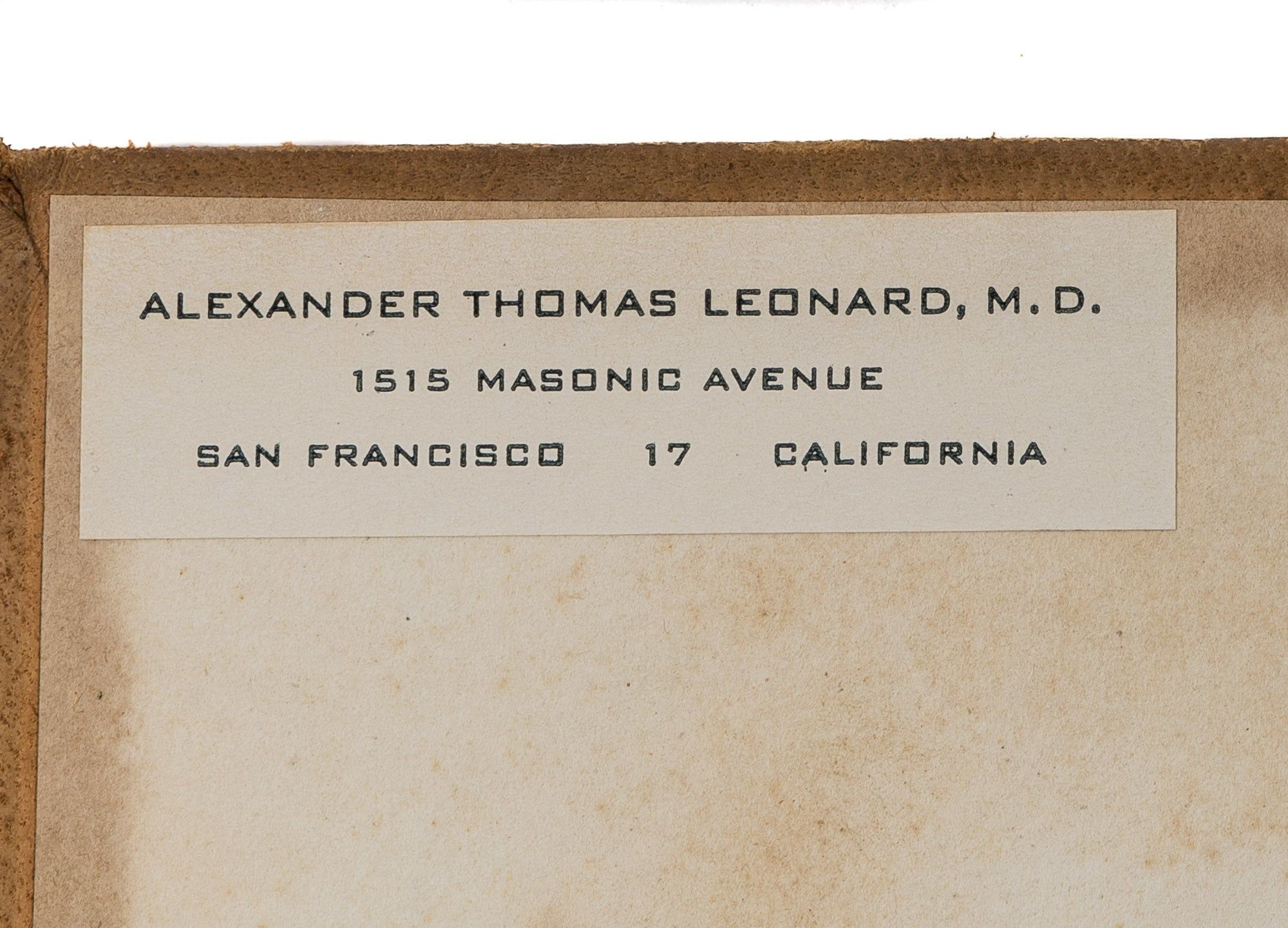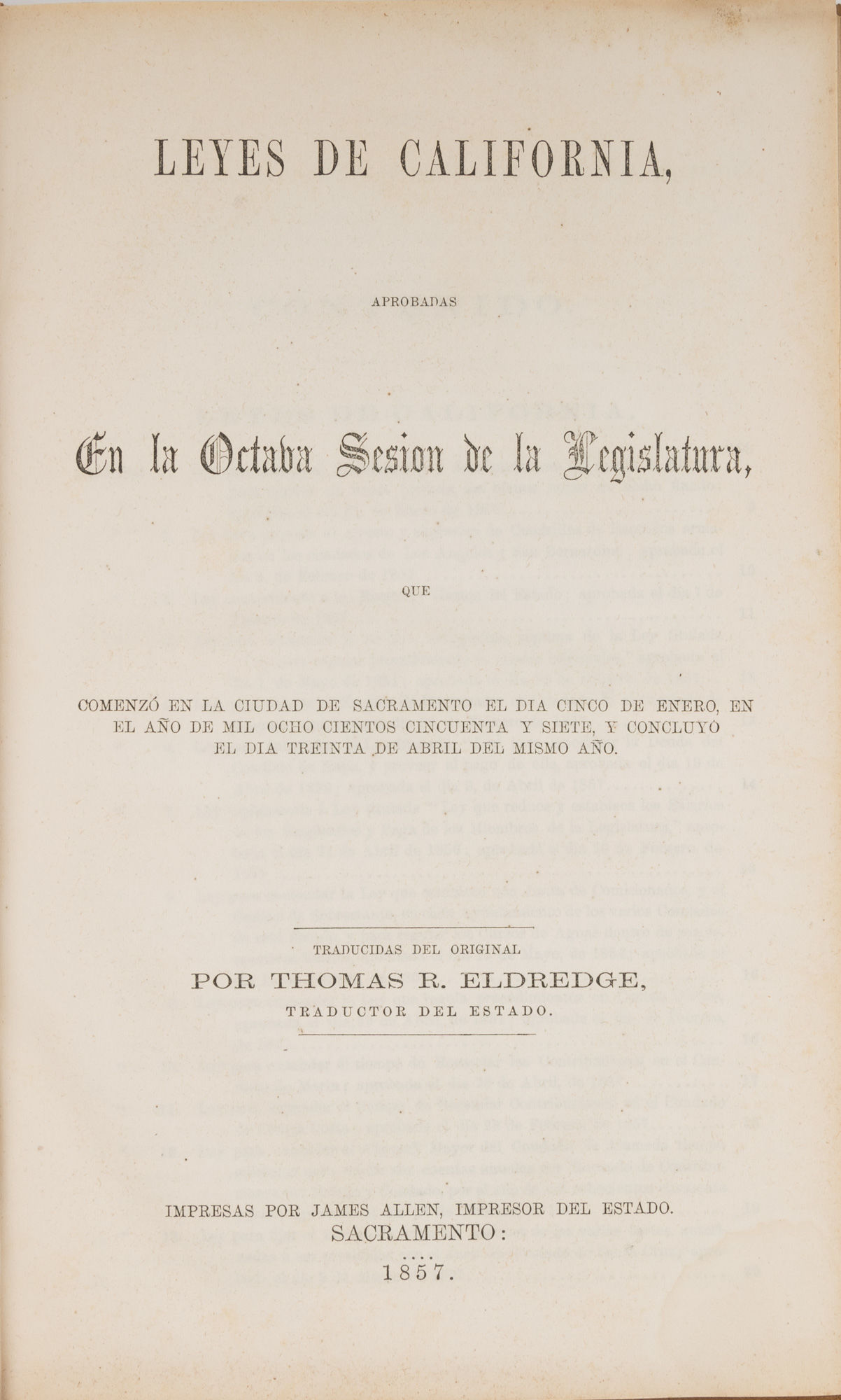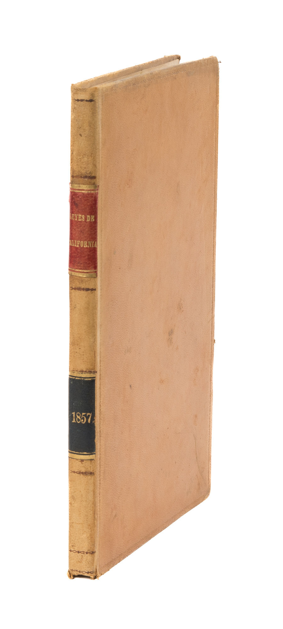 1857. Sacramento: James Allen, 1857. Sacramento: James Allen, 1857. 1857 California Session Laws in Spanish From The Library of a San Francisco Book Collector [California]. Eldredge, Thomas R., Translator. Leyes de California, Aprobadas en la Octava Sesion de la Legislatura, Que Comenzo en la Ciudad de Sacramento el dia Cinco de enero, En el Ano de Mil Ocho Cientos Cincuenta y Siete, Y Concluyo el Dia Treinta de Abril del Mismo Ano. Traducidas del Original por Thomas R. Eldredge, Traductor del Estado. Sacramento: Impresas por James Allen, Impresor del Estado, 1857. 156 pp. Two folding tables. Octavo (8-3/4" x 5-1/2"). Contemporary sheep, blind fillets to boards, black-stamped fillets and red and black lettering pieces to spine. Light rubbing and a few minor scuffs, chip to foot of spine, corners bumped and lightly worn, small later bookplate, "Alexander Thomas Leonard, M.D./ 1515 Masonic Avenue/ San Francisco 17 California" to front pastedown, tiny later price label to rear pastedown. Moderate toning to interior, light foxing in places, a few minor chips to edges of tables, one table detached, offsetting to margins of endleaves. An attractive copy. $650. * First issue. Early California statutes were issued in English and Spanish, as required by a provision in the state constitution. In 1849, when it was drafted, Spanish was the native language of around 13,000 of California's nearly 100,000 residents, many of them recent arrivals due to the gold rush. Alexander Thomas Leonard [1889-1970] was a prominent San Francisco physician, historian and collector of Californiana. OCLC locates 6 copies in law libraries (Georgetown, Indiana University, University of Michigan, University of Minnesota, University of Southern California, Yale). Babbitt, Hand-List of Legislative Sessions and Session Laws 22.