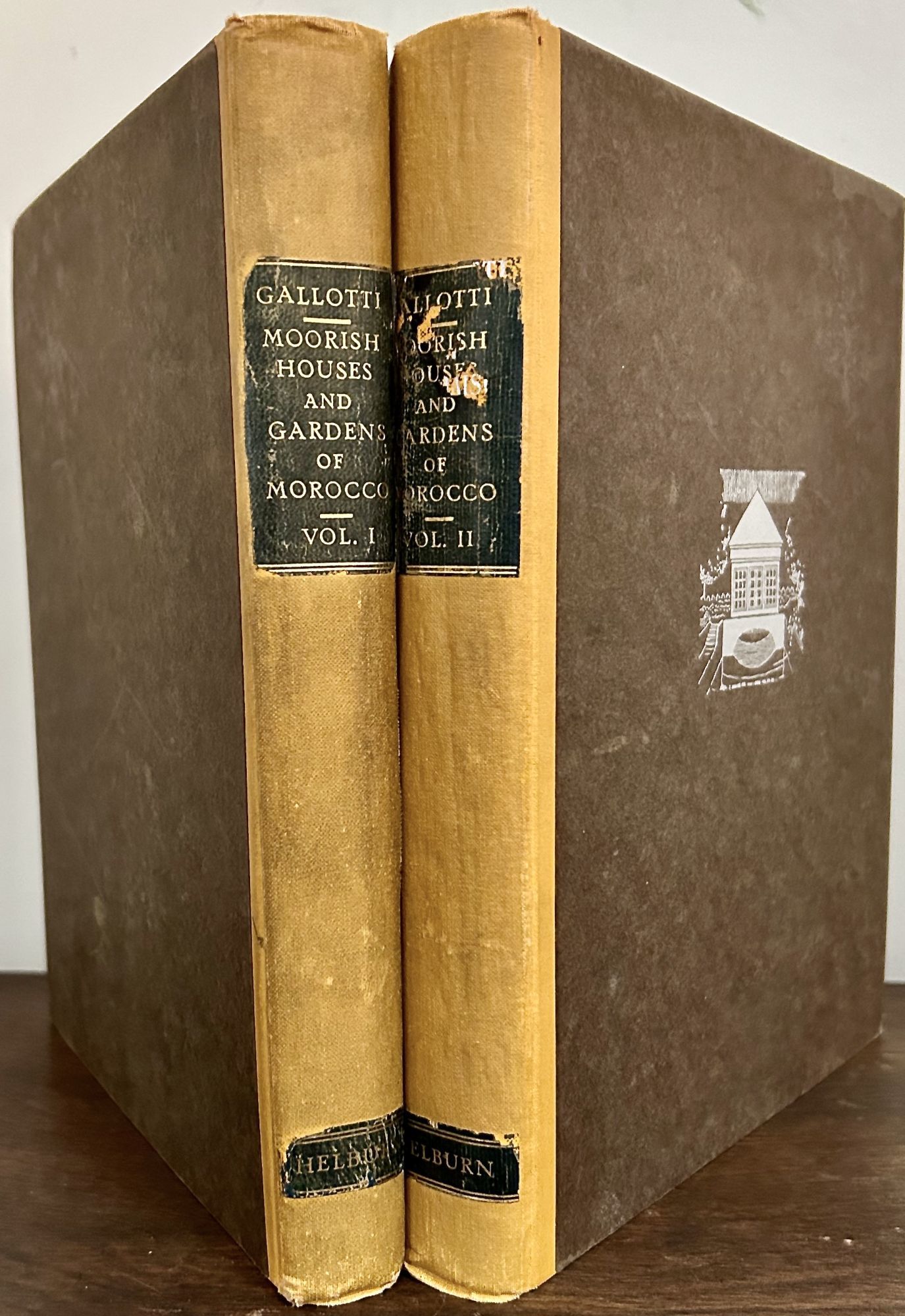 New York: William Helburn, 1926. First edition. Hardcover. Publisher's saffron yellow spine and brown boards with architectural vignette in silver gilt and spine labels lettered in silver. Very good. 2 vols.. VIII, 120, 5 & 91 (2) pages in text. 25 x 19.5 cm. 57 and 136 plates in heliogravure from photographs printed recto only by Lucien Vogel. Plus 157 line drawings by Albert Laprade. Text in French. Elegantly illustrated with fine examples of interior gardens and their layouts. Some of Laprade's drawings are to scale. Laprade collaborated with the author on this monograph with photos depicting an array of traditional Moroccan residences. This work was also published in France by Albert Levy. A small number of copies were published by Helborn. A tight set well printed with wide text margins. Book seller label of M. Sterling Carter, 414 Post Street, San Francisco. One spine label nicked.