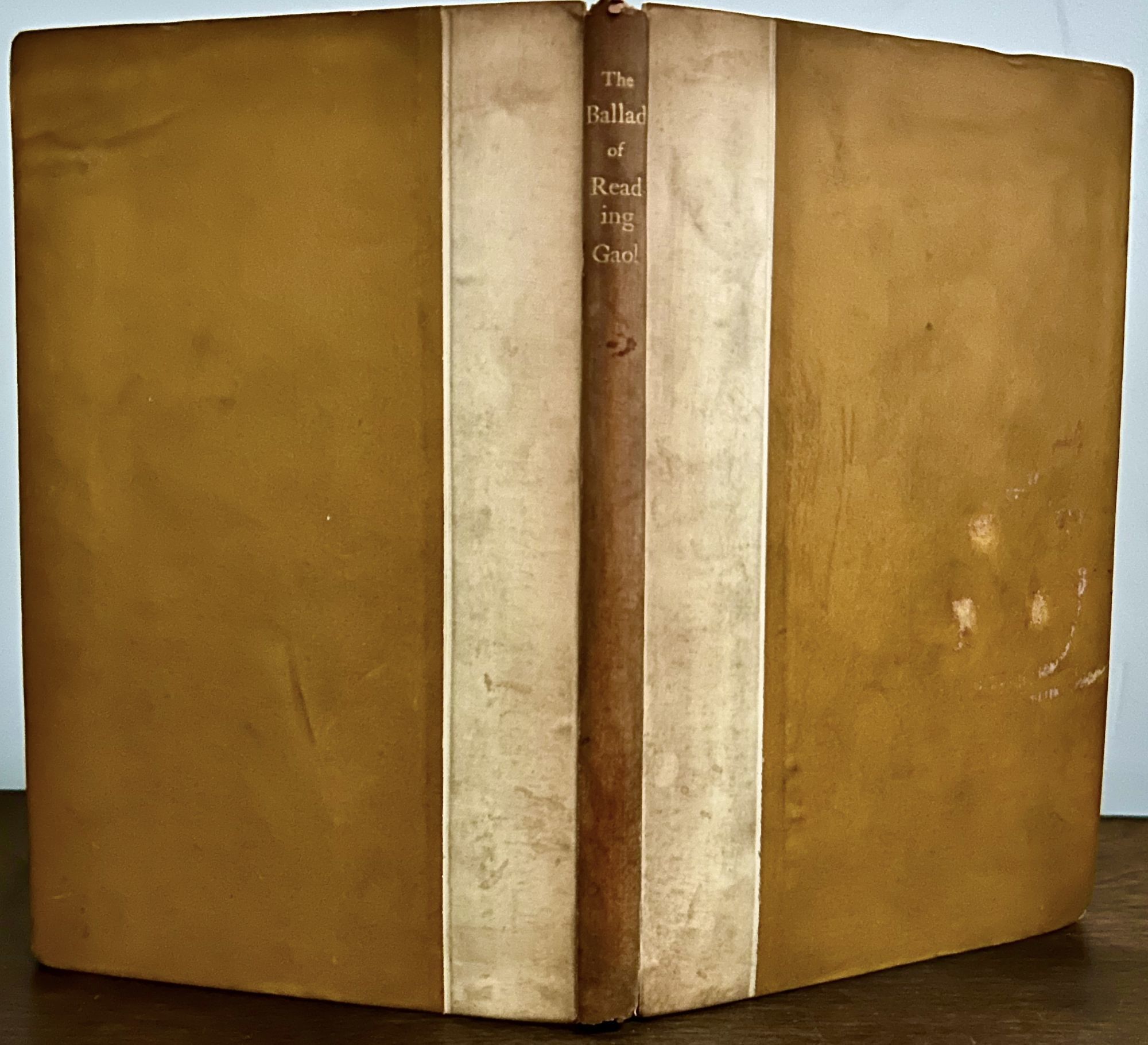 London: Leonard Smithers, 1898. First edition. Hardcover. Orig. quarter cream and light brown cloth, spine darkened. Very good. 31 pages. 23 x 14 cm. "Of this Edition eight hundred copies have been printed on hand-made paper, and thirty copies on Japanese vellum." The last edition to identify the author as "C.3.,3." -- Wilde was imprisoned in cell block C, landing C, Cell 3. This narrative, a tale of Charles Thomas Woodbridge's 1896 execution at Reading for the murder of his wife. Three small fade spots front cover, and slight crinkling at back cover toward head at fore-edge. Nicks to spine head and foot.