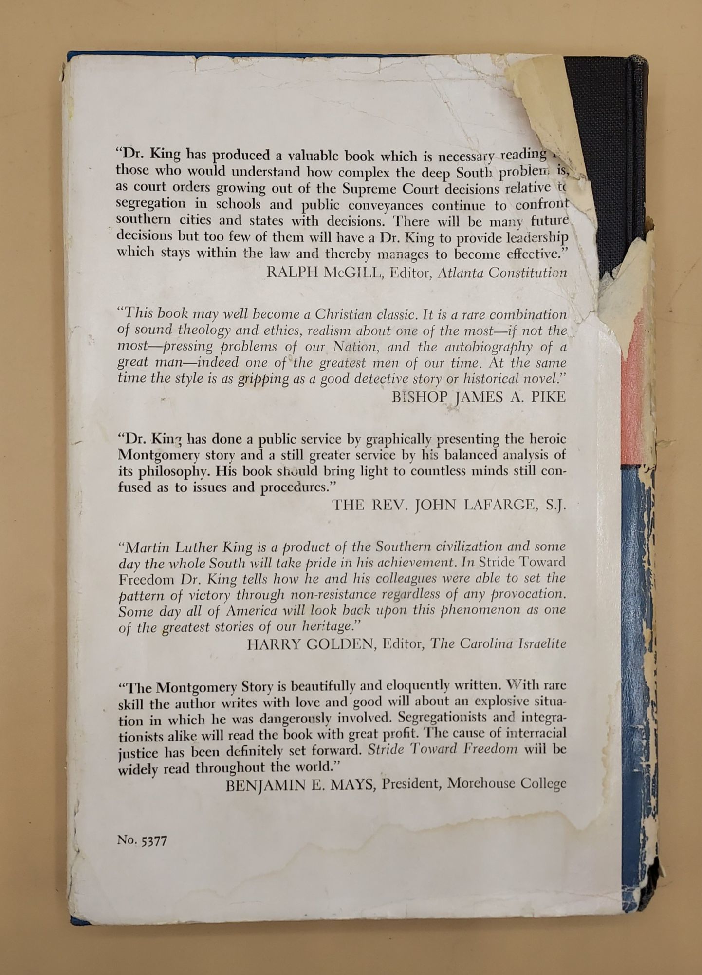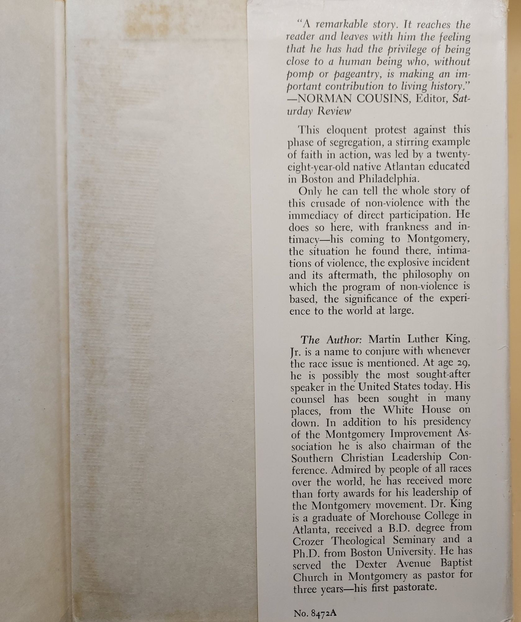 New York: Harper & Brothers, Publishers, 1958. First edition. Hardcover. Very Good/Good. 230pp. Octavo [21 cm] 1/4 black cloth with blue paper over boards. Subtle damp staining to the lower extremities of the spine. Endpapers darkened in areas. Present, albeit worn, is the price-clipped dust jacket. The jacket's spine is torn, with the most prominent tear being a loss from the top 1/4 of the jacket's spine at the head and the surrounding area of the front panel. The front panel has an abraded patch, obscuring a portion of the author's name. The lower extremities of the spine and rear panel are lightly moisture stained. A first edition of Martin Luther King's first book. "H-H" code on copyright page.
