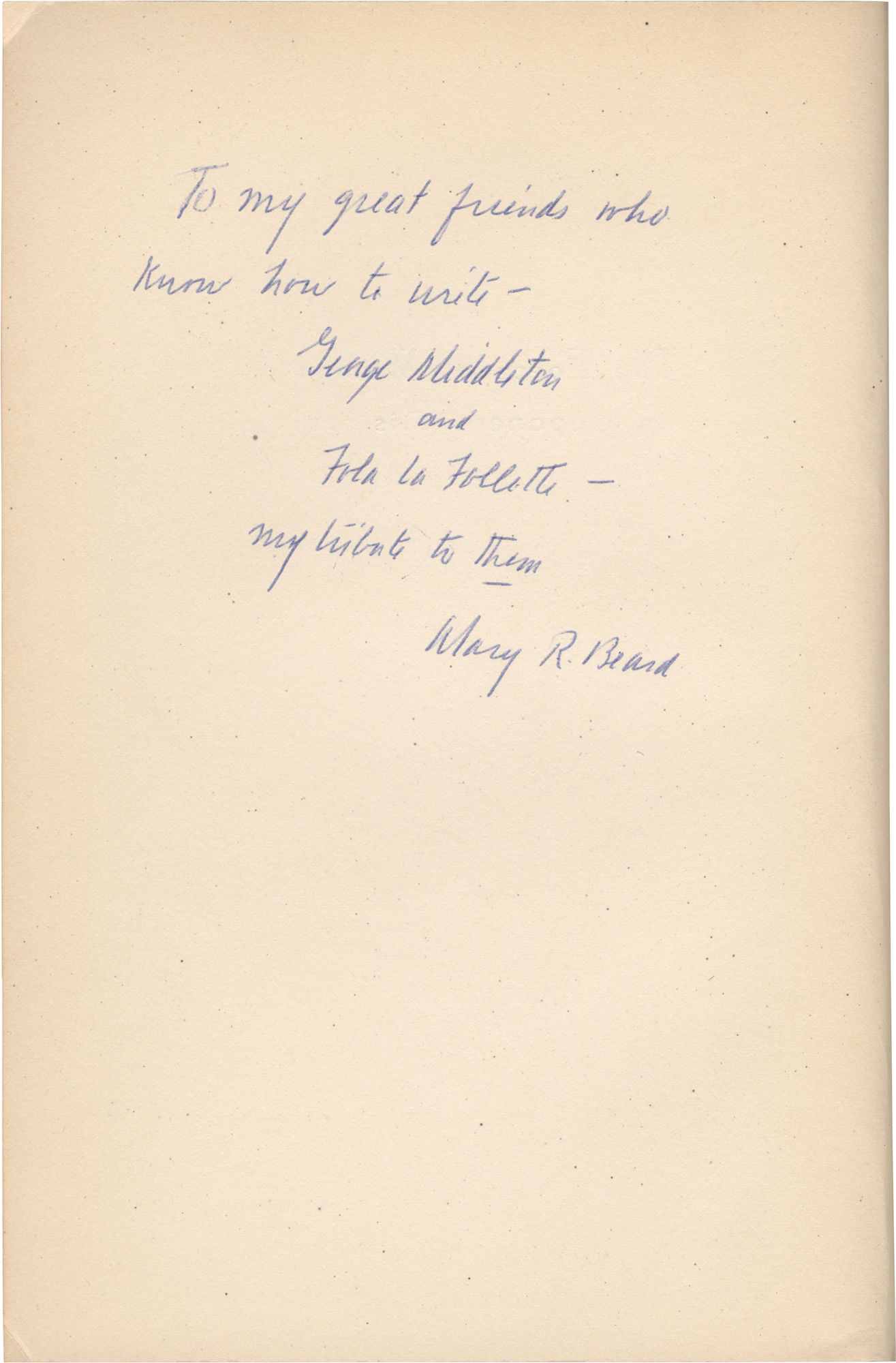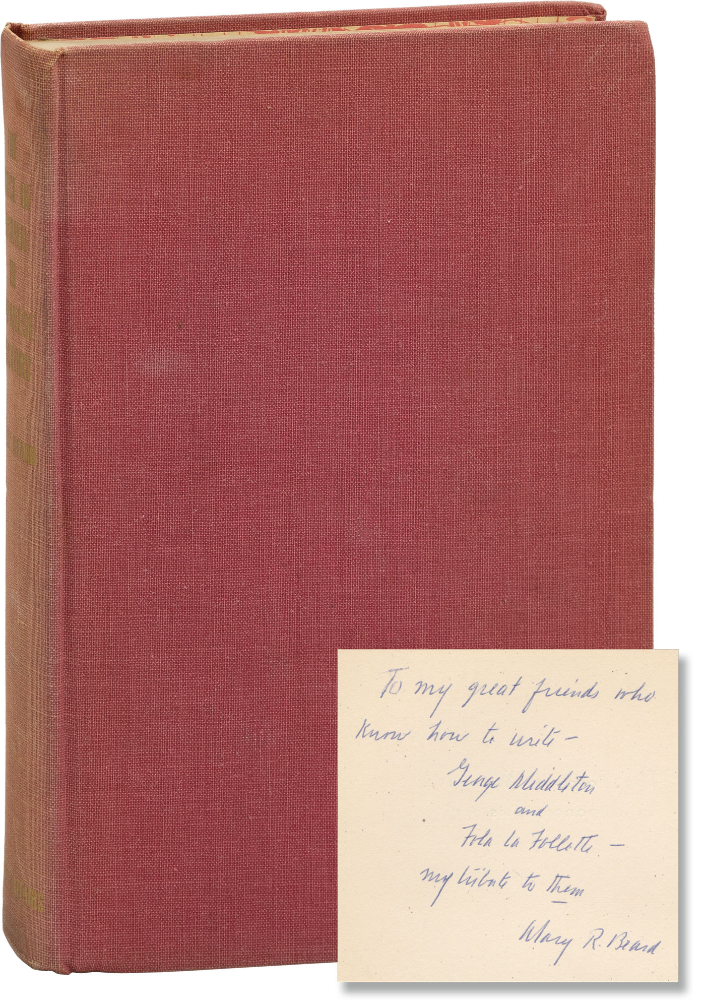 Washington, DC: Public Affairs Press, 1953. First Edition. First Edition. Association Copy, INSCRIBED by the author on the verso of the half-title page: "To my great friends who know how to write / George Middleton and Fola La Follette / my tribute to them / Mary R. Beard."
