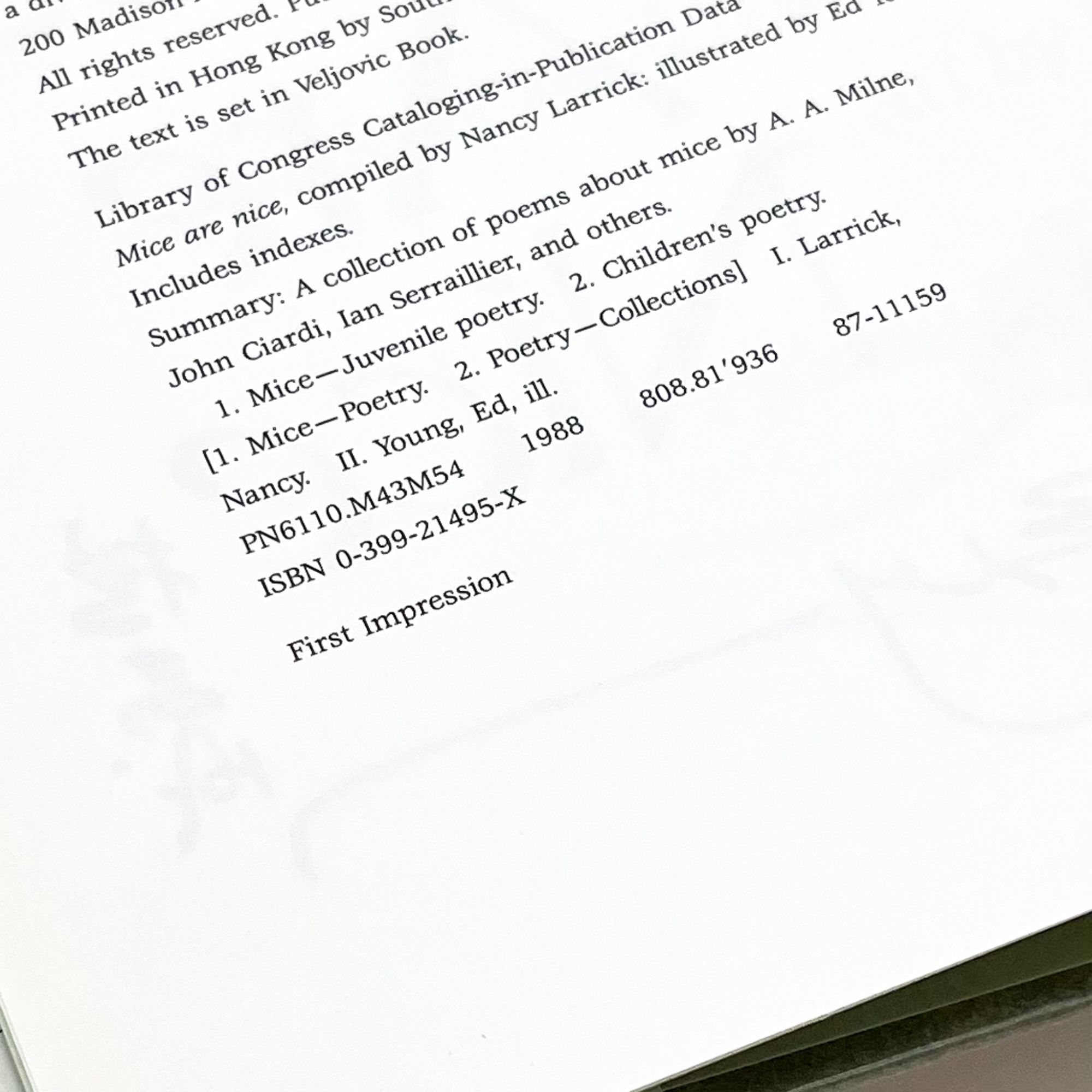 New York: Philomel Books, 1990. First edition. Fine in very good plus dust jacket.. Signed first printing of this collection of mouse poetry selected from the works of A. A. Milne, Edward Lear, Elizabeth Coatsworth, and more — with charming illustrations by Ed Young. Ed Young entered the world of illustration as a commercial artist, and this background in compelling visual storytelling is evident in all his books. Over his long career, he has earned two Caldecott Honors and two nominations for the prestigious Hans Christian Andersen Award. 10'' x 8''. Original color pictorial boards. Original unclipped (sticker over price) color pictorial dust jacket. Illustrated in color. [32] pages. Signed by Young in Chinese and Latin characters to title page. Jacket with mild toning to spine, 1.75" closed tear near rear joint. Binding with a touch of bumping to corners and spine ends. Clean and bright.