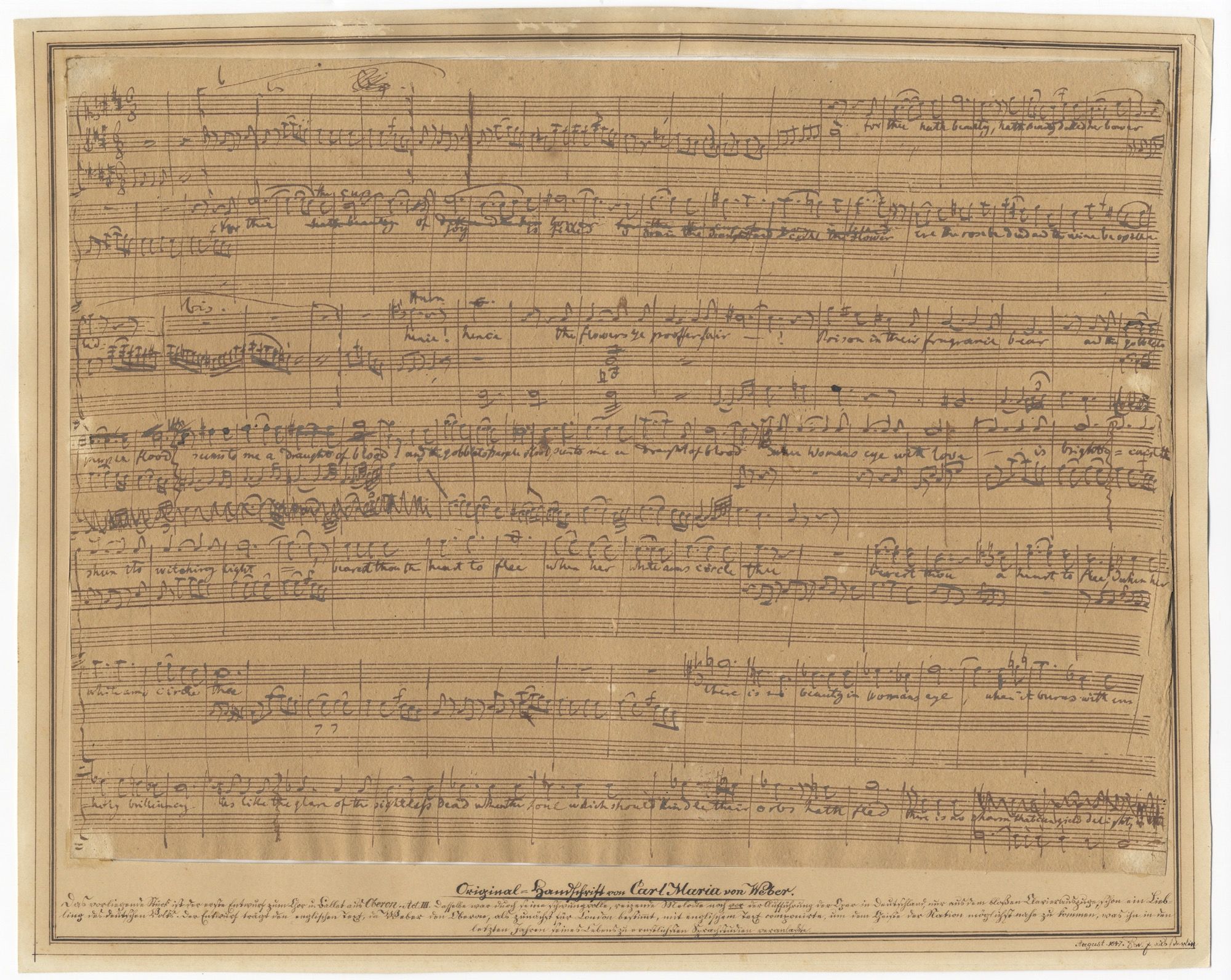 Attached at corners to thin window mat, at the foot of which is an inscription in an unknown 19th century hand in German identifying the manuscript as follows (in translation): "Original manuscript by Carl Maria von Weber. The present piece is the first draft of the chorus and ballet from the third act of Oberon. Thanks to its bouncy, exquisite melody, it became a favorite of the German people even before the opera's first performance, based solely on the piano-vocal score. The draft has English text because Weber composed Oberon, which was destined for London, with English text to get as close as possible to the spirit of the nation. This prompted him to a most serious study of the language in his final years. August 1847 [Signed with Initials] [? Etw] ... Berlin." For an account of various manuscript sources of Oberon, see Jähns 306, p. 391.