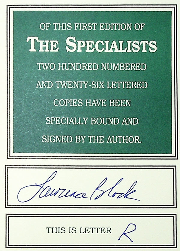 "The Specialists are five ex-soldiers, all trained in jungle warfare, each with a deadly specialty. As civilians they lead inconspicuous lives--until the Colonel sends for them. Then their job is to find and eliminate the worst kind of criminal: those who hurt the innocent . . . those the law cannot touch." (from the dustjacket).