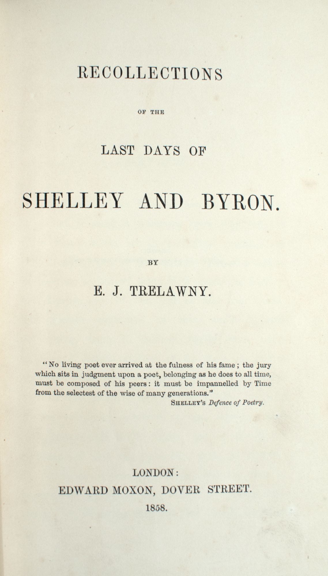 Records of Shelley, Byron, and the Author is actually the revised and expanded version of Trelawney's Recollections of the Last Days of Shelley and Byron. In the later edition, at the age of 86, still hale and hearty Trelawney writes in his Preface: "No two men [Shelley and Byron] could be more dissimilar in all ways, yet I have seldom known two men more unhappy."