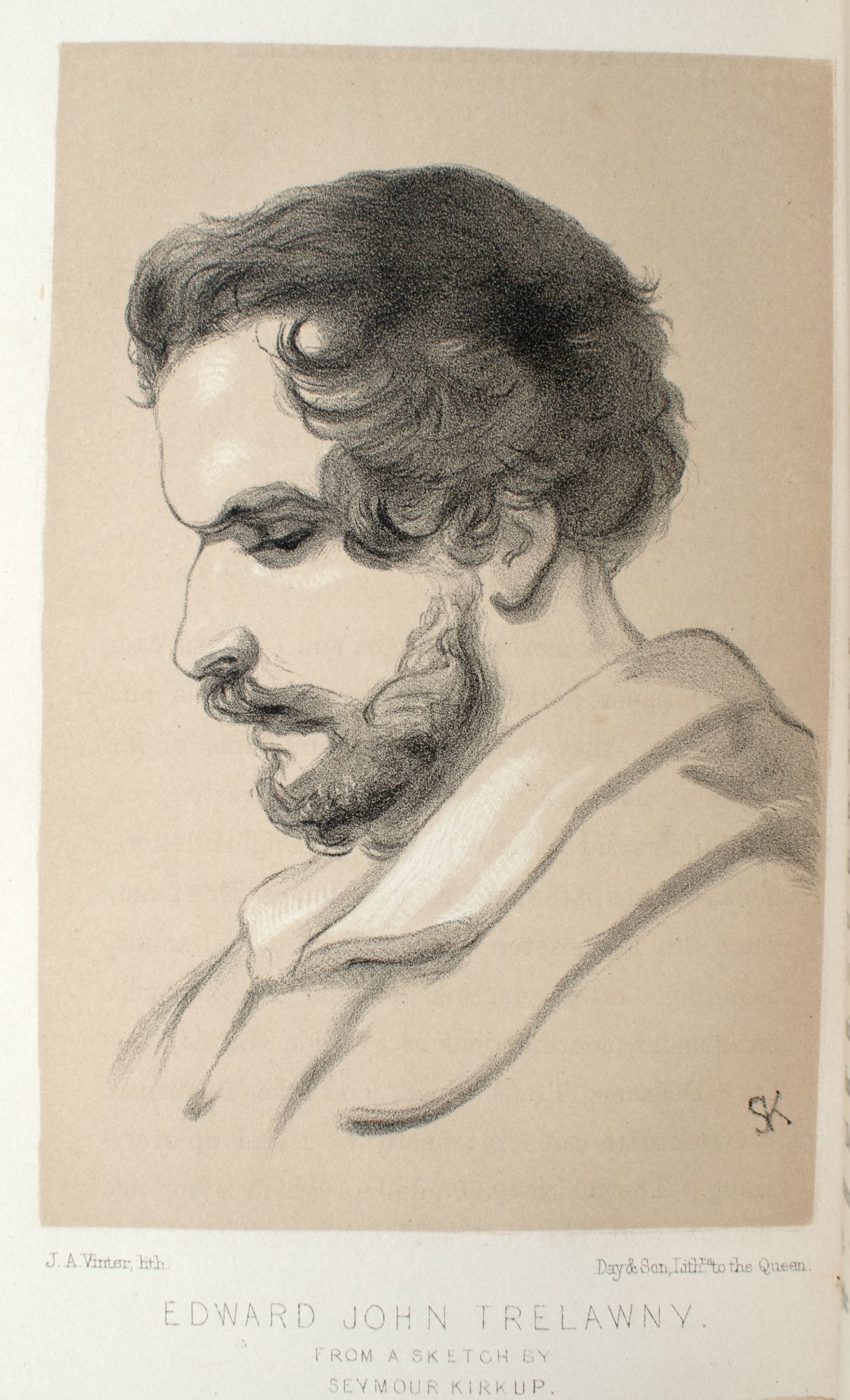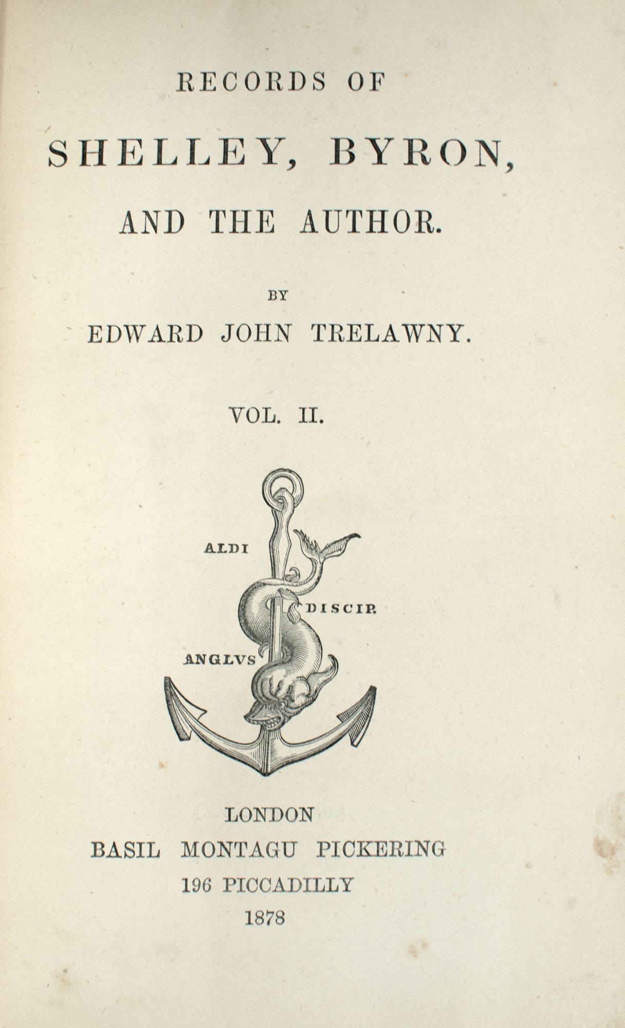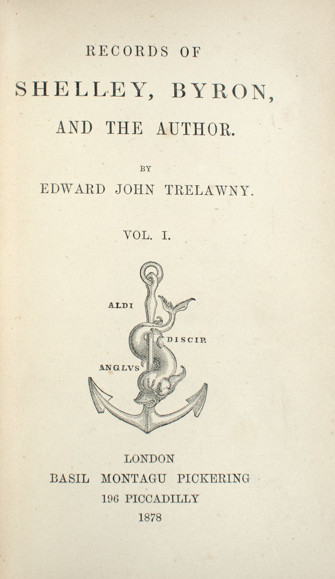 London: Edward Moxon, Basil Montagu Pickering, 1878. First edition of the Recollections, first edition thus of the Records ("with additions" CBEL). 2 plates: nature view, portrait of the author, 304 pp.; frontispiece portrait of Shelley and 2 plates, 214 pp.; frontispiece portrait of Byron and 1 plates, 245pp. 3 vols. 8vo. Bound in modern burgundy cloth with gold printed spine titles, fine. First edition of the Recollections, first edition thus of the Records ("with additions" CBEL). 2 plates: nature view, portrait of the author, 304 pp.; frontispiece portrait of Shelley and 2 plates, 214 pp.; frontispiece portrait of Byron and 1 plates, 245pp. 3 vols. 8vo. Trelawney was Shelley's closest friend in the poet's final year (it was Trelawney who snatched Shelley's heart out of the flames on the shore of Viareggio); and he was closely associated with Byron in the latter's final three years