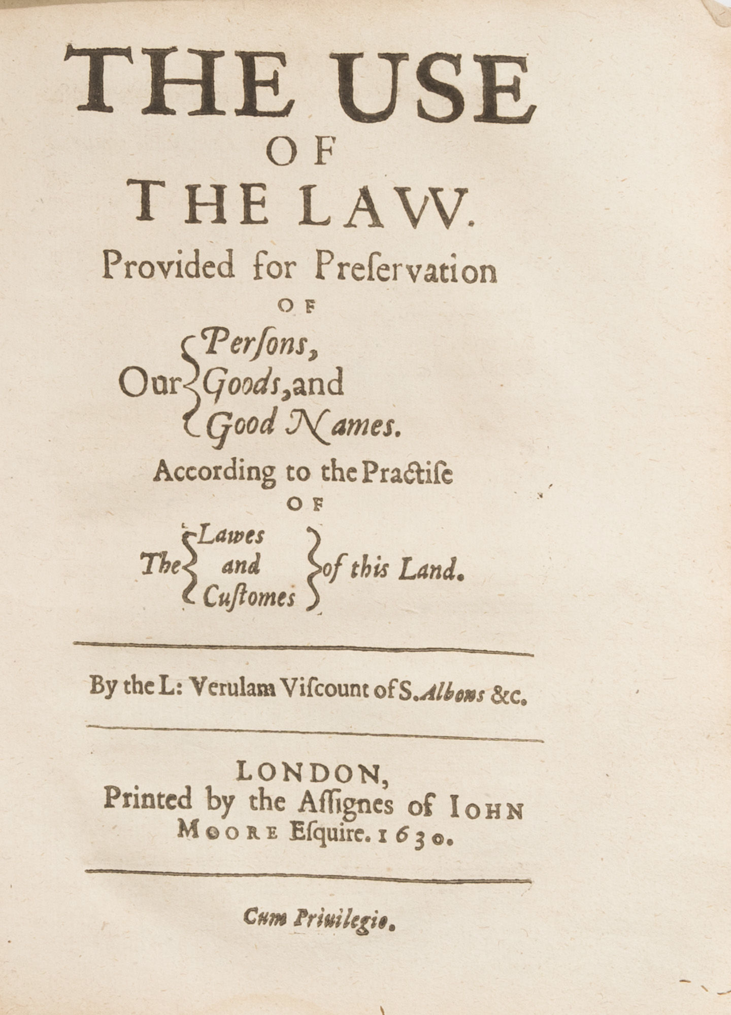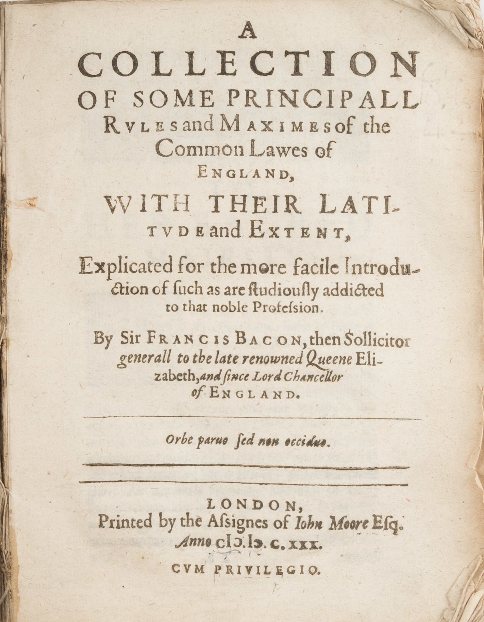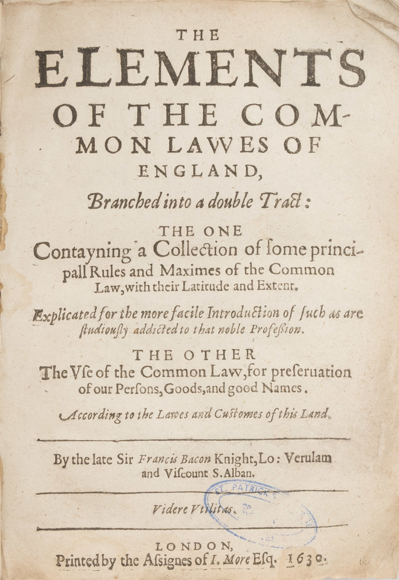 1630. London, 1630. First edition. London, 1630. First edition. First Edition of Bacon's Elements of the Common Laws of England Bacon, Sir Francis [1561-1626]. The Elements of the Common Lawes of England, Branched Into a Double Tract: The One Contayning a Collection of Some Principall Rules and Maximes of the Common Law, With Their Latitude and Extent. Explicated for the More Facile Introduction of Such as are Studiously Addicted to that Noble Profession. The Other the Use of the Common Law, For Preservation of Our Persons, Goods, And Good Names. According to the Lawes and Customes of this Land. London: Printed by [Robert Young for] the Assignes of I. More Esq., 1630. [xxiv], 104; [8], 84 pp. Two parts, each with separate title page and pagination, second part titled The Use of the Law. Quarto (7" x 5-1/2"). Contemporary limp vellum with yapp-style fore-edges, text block detached. Soiling and edgewear to binding, curling, chipping and tears to fore-edges, brief early annotations, mostly illegible, to inside of rear cover, early owner inscriptions (George Butler) to front free endpaper. Moderate toning to interior, light wear to edges of text block, fold lines to corners of several leaves, notable edgewear and a few tears to preliminaries and final leaves, small faint library stamps to title page and rear endleaf, part-erased library markings in pencil to title page of first part and following leaf. $950. * First edition. Bacon, one of the great intellectuals of his era, held the posts of Solicitor General, Attorney General and Lord Chancellor during the reign of James I. The Elements of the Common Laws of England is the general title for a work that is comprised of two different treatises: A Collection of Some Principall Rules and Maximes of the Common Lawes of England and The Use of the Law, Provided for the Preservation of Our Persons, Goods and Good Names. The first contains a set of twenty-five maxims, or regulae, one of the earliest, if not the first, collections of maxims on English law. These maxims are remarkable for their stylistic vigor, intellectual rigor, meticulousness and clarity. The Regulae was intended to be the first part of De Regulis Juris, a codification of English law that Bacon never completed. This is quite unfortunate, observes Holdsworth, because "he alone had the philosophical capacity, the historical knowle.