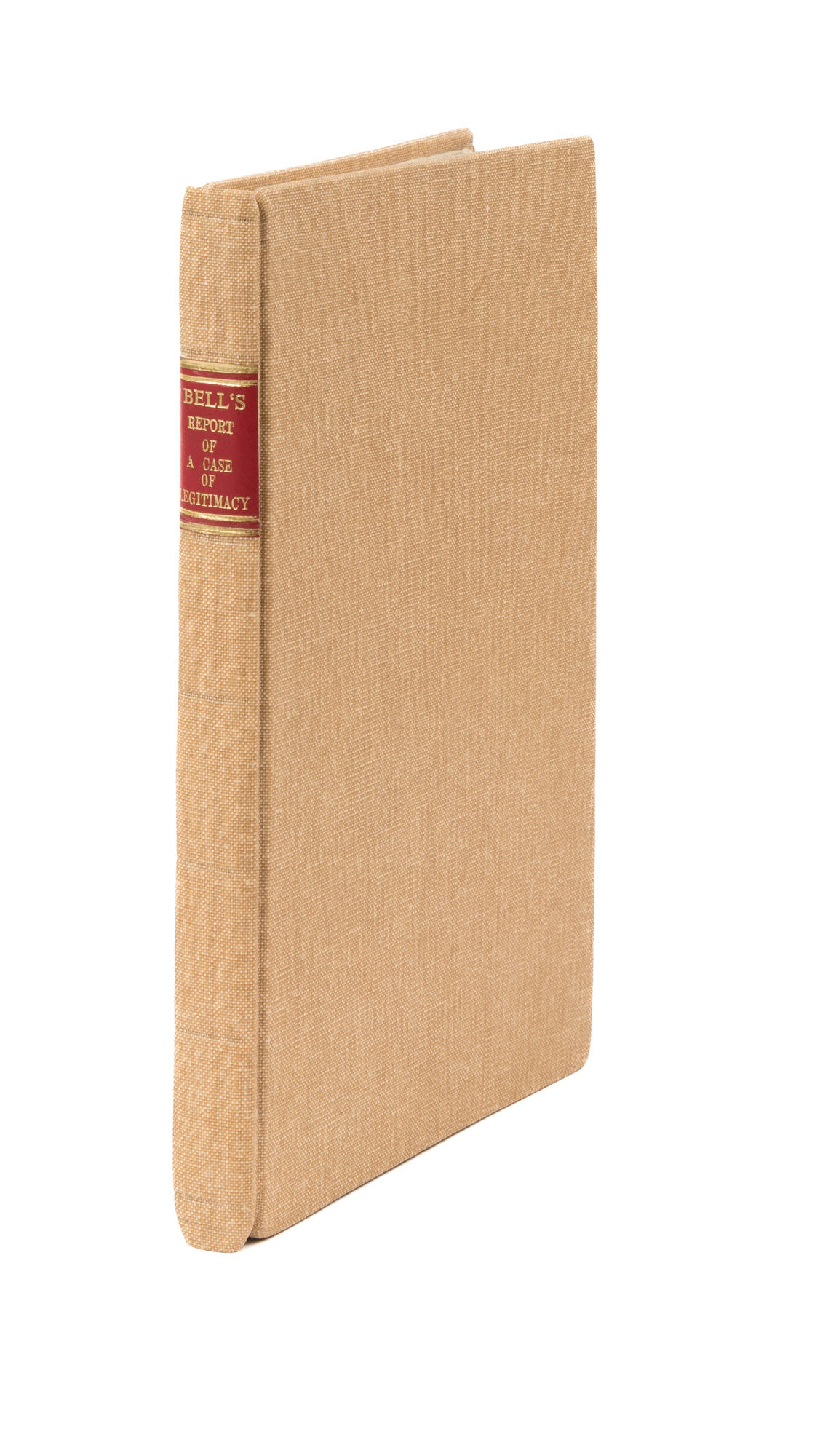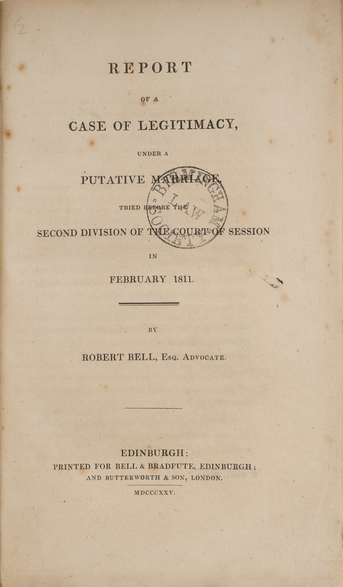 1825. Edinburgh and London, 1825. Only edition.. Edinburgh and London, 1825. Only edition. An Unusual Scottish Case Involving Clandestine Marriage and Legitimacy Bell, Robert [c.1760-1816]. Report of a Case of Legitimacy, Under a Putative Marriage, Tried Before the Second Division of the Court of Session in February 1811. Edinburgh: Printed for Bell & Bradfute; London: Butterworth & Son, 1825. vii, 228 pp. Octavo (8-3/4" x 5-1/2"). Later cloth, lettering piece and blind fillets to spine, endpapers renewed, deckle fore and bottom-edges. Moderate toning to interior, light foxing and dampspotting in places, library stamp to title page and a few other leaves. $450. * Only edition. A study of Brymar vs. Riddell, an unusual Scottish case. While underage, an heiress entered a clandestine marriage. Years later, she married again to an unknowing second husband. After the discovery of the first marriage the sole child from the second faced charges of illegitimacy. Bell's account provides lengthy excerpts from the arguments of counsel, including that of Francis Jeffrey. Sweet & Maxwell, A Legal Bibliography of the British Commonwealth 5:23.