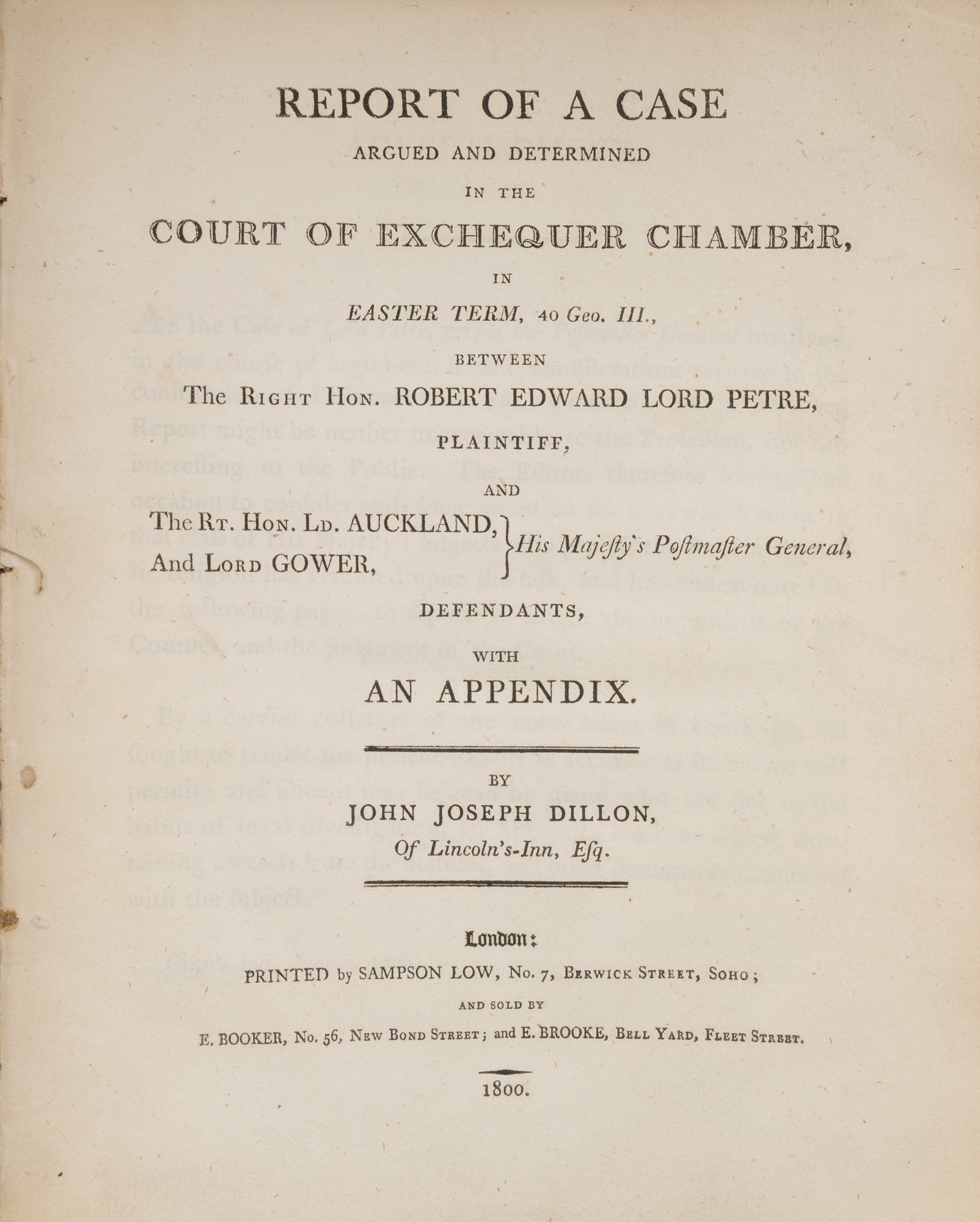 1800. A Privilege Witheld from a Catholic Peer [Trial]. Petre, Robert Edward, 9th Baron Petre [1742-1801], Complainant Dillon, John Joseph, Reporter. Report of a Case Argued and Determined in the Court of Exchequer, In Easter Term, 40 Geo. III., Between the Right Hon. Robert Edward Lord Petre, Plaintiff, And the Rt. Hon. Ld. Auckland, And Lord Gower, His Majesty's Postmaster General, Defendants, With an Appendix. London: Printed by Sampson Low, No. 7, Berwick Street, Soho; And Sold by E. Booker, No. 56, New Bond Street; And E. Brooke, Bell Yard, Fleet Street, 1800. [iv], 42, xlii pp. Quarto (10-1/2" x 8-1/2"). Stab-stitched pamphlet in recent limp marbled wrappers. Light rubbing to extremities, lower-outside corner of front wrapper mended. Moderate toning to interior, light soiling to title page, a few smudges to inside of rear wrapper. $350. * Only edition. Dillon, a Lincoln's Inn barrister, published several works bearing on Catholic persecution. This one reports litigation preventing a Catholic peer from the right to free postage (franking), a privilege granted to peers in Parliament, who were then required to be members of the Church of England. This small matter is used to illuminate a larger issue: the exclusion of Catholics from Parliament. English Short-Title Catalogue T104083.