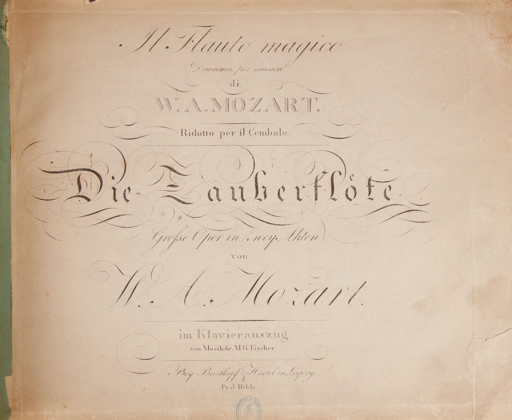 Slightly worn and browned; occasional light foxing; title slightly worn, soiled, creased and frayed at edges with several small chips, minor archival tape repair to verso. Small oval publisher's handstamp to blank lower margin of title, slightly cropped. A Singspiel in two acts to a libretto by Emanuel Schikaneder, Die Zauberflöte was first performed in Vienna at the Theater auf der Wieden on 30 September 1791. It proved to be one of Mozart's most popular and enduring works.