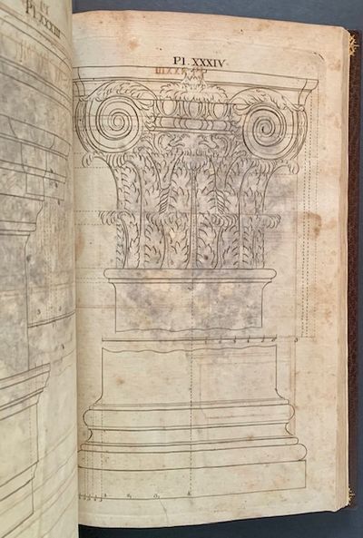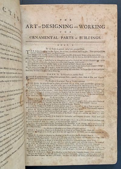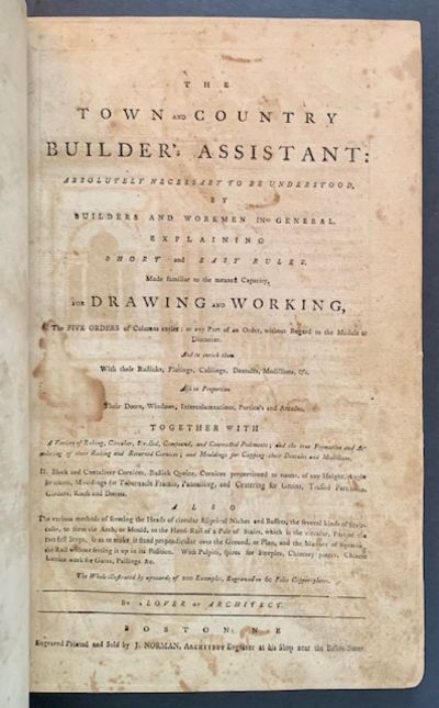 Boston: John Norman, 1786. Full leather. Very Good +. The 1786 1st edition of "the first contribution to the field of architecture compiled in America". After issuing the 1st American edition of Swan’s The British Architect, the publisher, John Norman, came to Boston and published this work, compiled from various English sources, containing 60 plates depicting interior and exterior designs from homes and public buildings. 'In its house plans and details this collection more nearly approaches the needs of the average well-to-do man than the more ambitious reprint of The British Architect' (AAS). The frontispiece is from Isaac Ware’s 1756 'The Complete Body of Architecture' and other content is drawn from the works of Batty Langley and other pattern book authors. Born in England, Norman describes himself in the subtitle of this work as a 'lover of architecture' but he never seems to have practiced as one, working primarily as an engraver and publisher" (Christie's, 2022). Only 3 complete copies are recorded at auction in the last 50 years, including the copy from the William Reese Collection, sold at Christie's (New York) in June of 2022. (Evans 20027; Hitchcock 856; see "The Colonial Scene—1602-1800,” in Proceedings of the American Antiquarian Society [April 1950], p. 74). Folio, engraved allegorical frontispiece and 60 engraved plates. Beautifully rebound in a full plum morocco --and signed in gilt at the front pastedown-- by Rene Kieffer of Paris within the last 50 to 75 years. Matching marbled endpapers and pastedowns as well, with lovely decorative gilt-bordering. Also includes a lime-green, custom printed slipcase, with bright gilt-titling and bordering --and decorative flouishes-- along the spine. Some wear at the bottom-edge but still sturdy and very presentable.