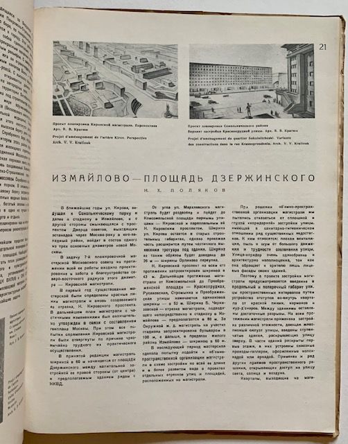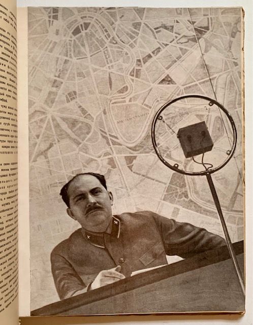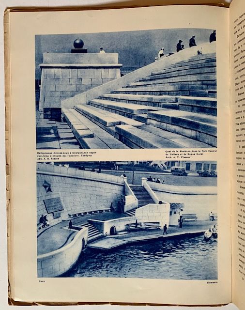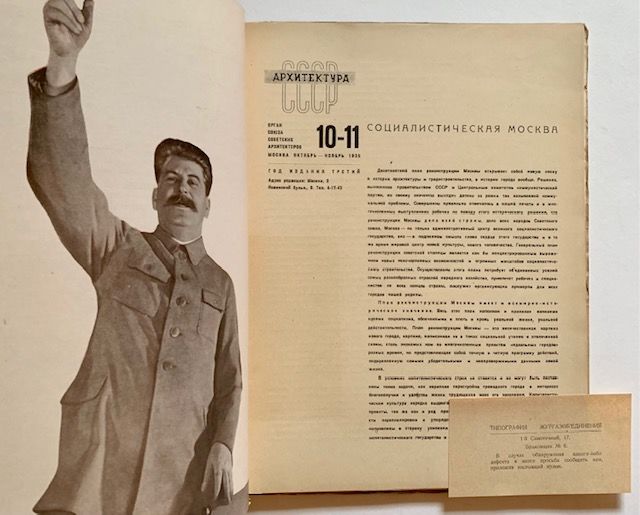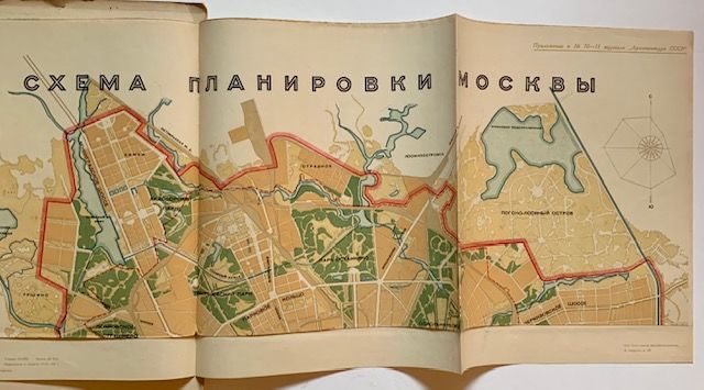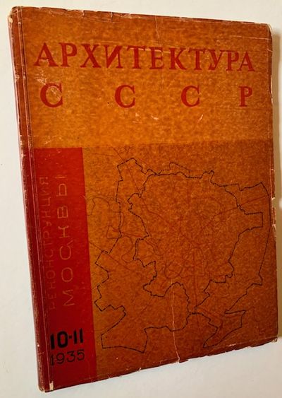 Moscow, 1935. Original wraps. Very Good +. The 1935 1st edition of this scarce history of urban planning and architecture in Moscow. With a number of gravure plates and color maps, including a large fold-out panoramic map attached to the rear pastedown. Tight and VG+ in its orange and red card wrappers, with just a touch of very light chipping along the panel edges. Tall quarto, dozens and dozens of high-quality plates and photos throughout.