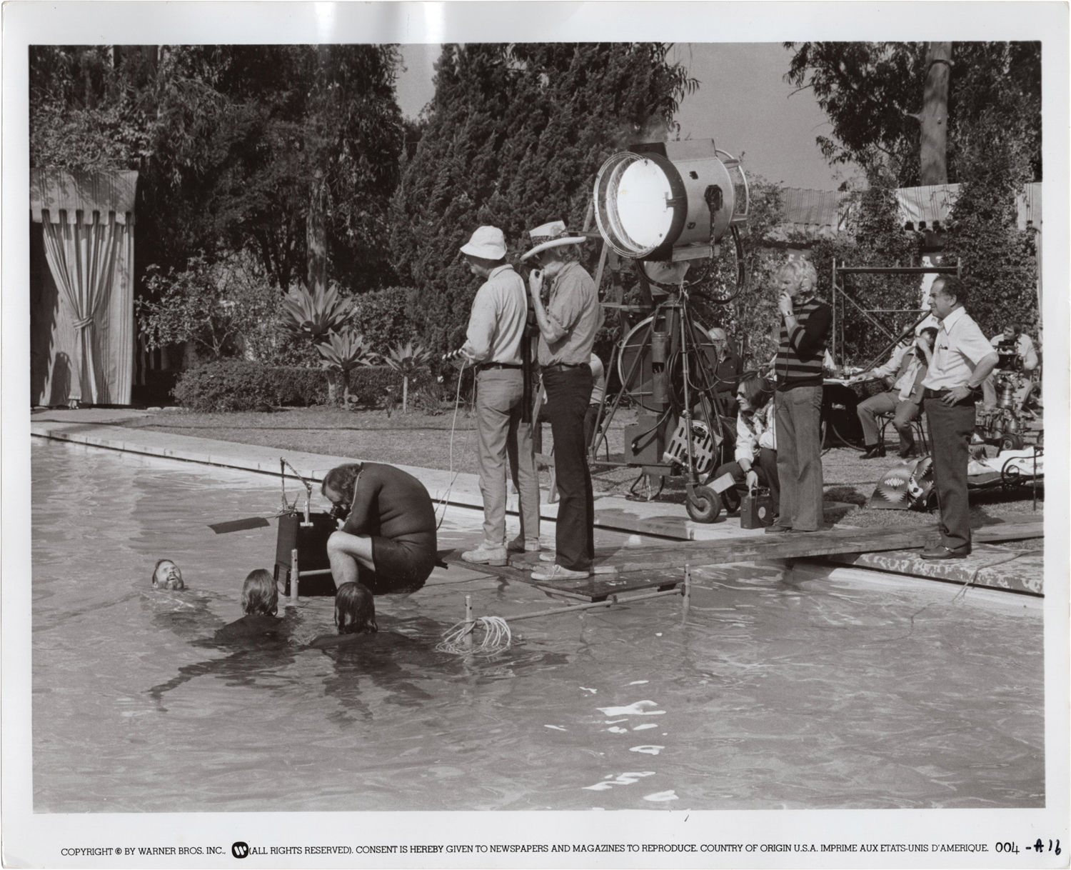 Burbank, CA: Warner Brothers, 1976. Vintage reference photograph from the 1976 film, showing director Frank Pierson and a camera crew capturing a scene. Printed mimeo snipe affixed to the verso.