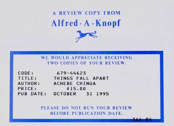 New York: Alfred A. Knopf / Everyman's Library, 1992. Hardcover. 181 pages. Review copy with laid in slip sent to John Leonard. Achebe's best known work. A near fine copy in cloth boards with bound in bookmarker and in a near fine dust jacket with a small tear and light crease to the top of the front panel. A nice copy with an interesting provenance as Leonard was an important literary and cultural critic.