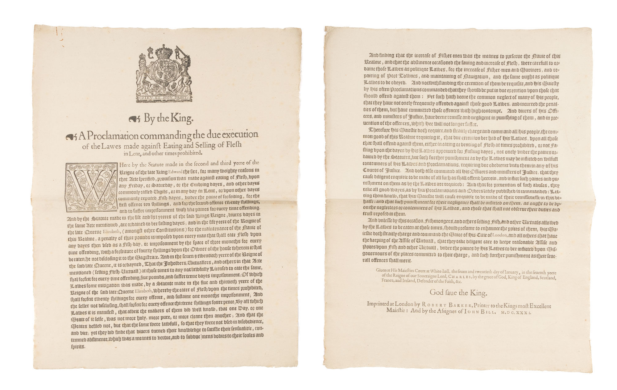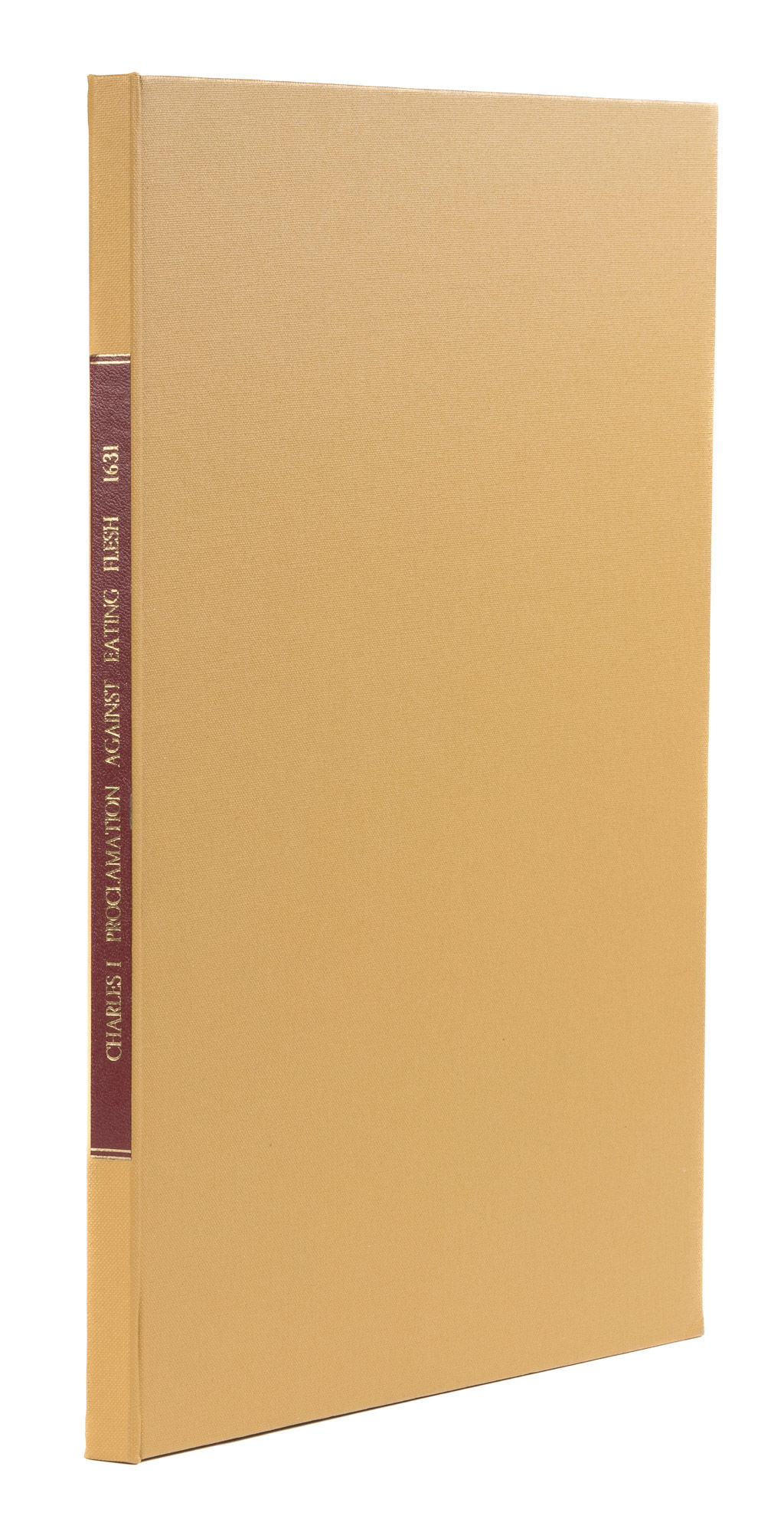 1635. London: Robert Barker 1632. 15-1/4" x 11-3/4" 2 ff. London: Robert Barker 1632. 15-1/4" x 11-3/4" 2 ff. Stricter Enforcement of Lenten Laws [Broadside]. Charles I [1600-1649], King of England. By the King. A Proclamation Commanding the Due Execution of the Lawes Made Against Eating and Selling of Flesh in Lent, And Other Times Prohibited. London: Imprinted...by Robert Barker and by the Assignes of Iohn Bill, 1631 [i.e. 1632]. 15-1/4" x 11-3/4" 2 ff. broadside, text in single column below headline and large woodcut royal arms, 8-line woodcut initial. Moderate toning, very light foxing and soiling, single horizontal fold line to each sheet. Housed in 13-1/4" x 9-1/2" buckram folder with red morocco spine label. $750. * In England, the traditional Lenten fast was not only a matter of private religious observance, but enforced public practice. The prohibition of eating or selling meat on designated fasting days (referred to as "fish-days" in this broadside) was backed up by statutory and royal authority and, beginning in 1632 under Charles I, somewhat strictly enforced. OCLC locates 3 copies of this broadside in North America (Harvard, Yale, Huntington Library). The ESTC adds a North American copy at Folger Shakespeare Library. English Short-Title Catalogue (ESTC) S122791.