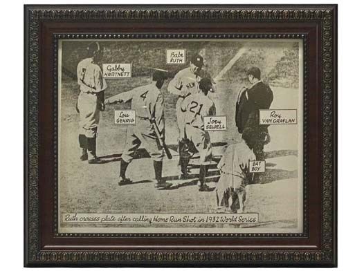 S.N. Unbound. Fine. Fine. Framed black-and-white photocopy of photography of Babe Ruth's home run in 1932 World Series. Labels of players added to photocopy. Features Babe Ruth, Lou Gehrig, Joey Sewell, Gabby Hartnett, Roy Van Graflan and Bat Boy. 10 1/4" x 12 1/4" outside to outside.