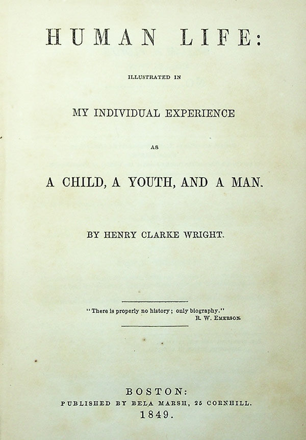 Part autobiography, part personal philosophy by the important American proto-anarchist, feminist and abolitionist Herny Clarke Wright, published by the Boston radical publisher Bela Marsh, known for disseminating works by fellow abolitionists and freethinkers throughout the mid-19th century. [62319].