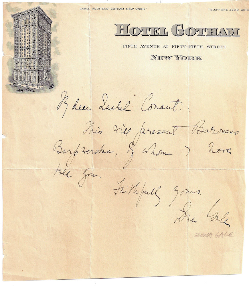 New York, n.d.. Letter. Creasing and toning of paper. Very Good. One-page handwritten note SIGNED on a 7-1/4" x 8" sheet of Hotel Gotham stationery to poet Isabel Conant. In full: "This will present Baroness [?], of whom I have told you." Gale, an American novelist, short story writer, and playwright, was the first woman to win the Pulitzer Prize for Drama in 1921 for the dramatization of her popular novel, MISS LULU BETT.