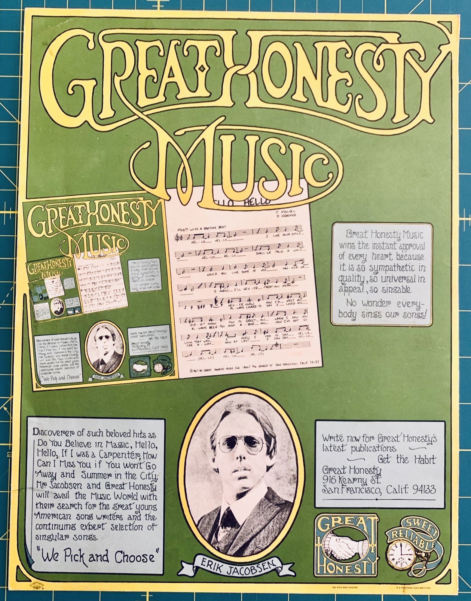 San Francisco, CA: Great Honesty. First Edition. Very Good. First Edition. Poster for the noted music producer. Includes some great text and a photographic repoduction of their founder, Erik Jacobsen. No record of this poster found in any institutional collection. Minimal shelf/edge wear, else bright and clean. Approx. 18x25
