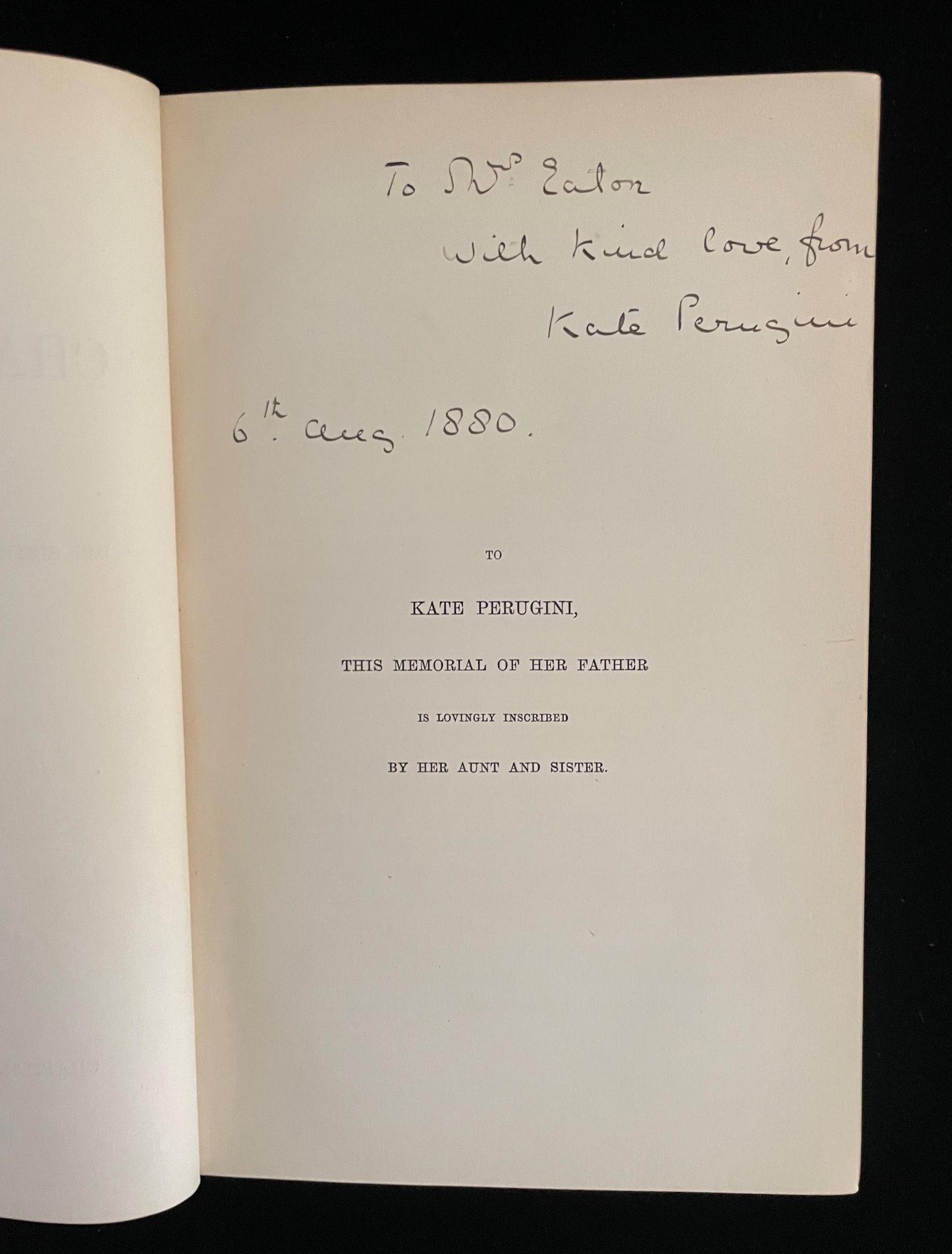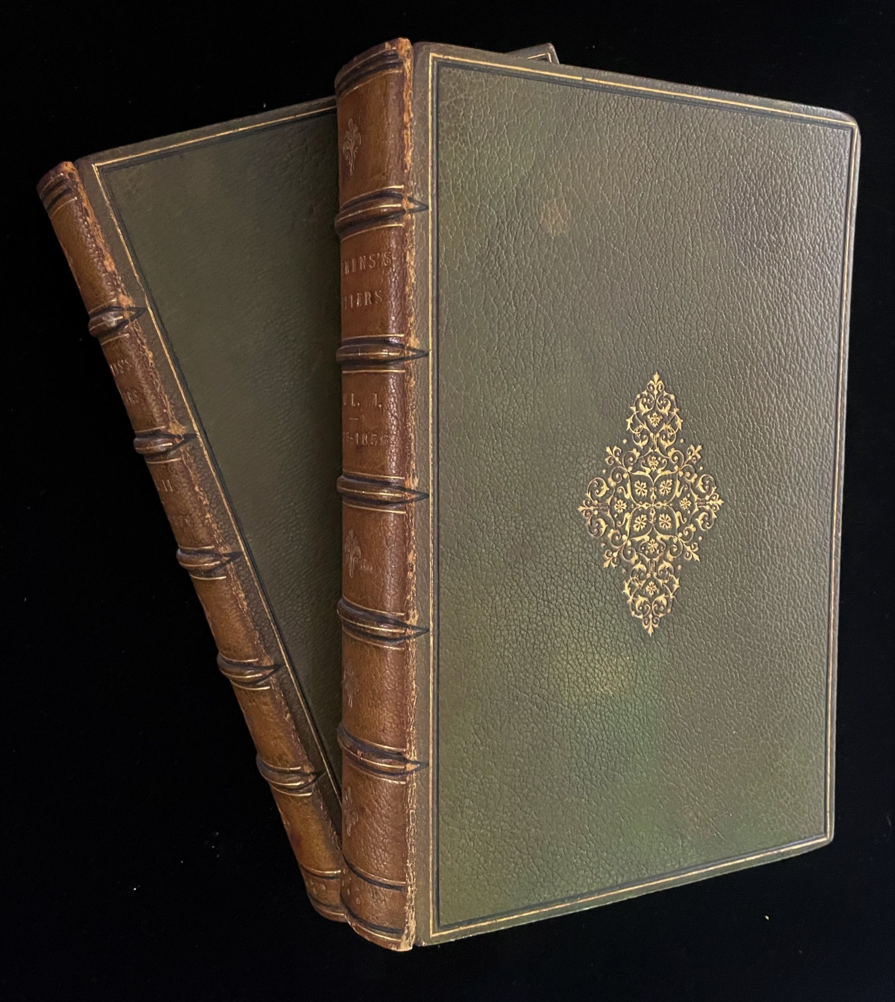 London: Chapman and Hall, 1880. Second Edition - Fifth Thousand. Hardcover. Very Good +. WITH DEDICATEE'S INSCRIPTION. 8vo, olive, crushed full-leather, gilt device and gilt single-ruled front cover , raised bands and gilt on spine, decorated dentelles, aeg. Volume I: 1833 - 1856; Volume II, 1857-1870. Dickens's eldest daughter, Mary Dickens, known as Mamie, and Dickens's sister-in-law Georgina Hogarth, who dedicated the work to Dickens' youngest surviving daughter (and apparently Dickens's favorite), artist Katherine Perugini, known as Kate. On the dedication page, Kate has inscribed the book: "To Mrs. Eaton With kind love, from Kate Perugini 6th Aug. 1880". Spines a wee browned, hinges showing some wear, internals quite nice. A solid copy, uncommonly found with Dicken's younger daughter's signature.