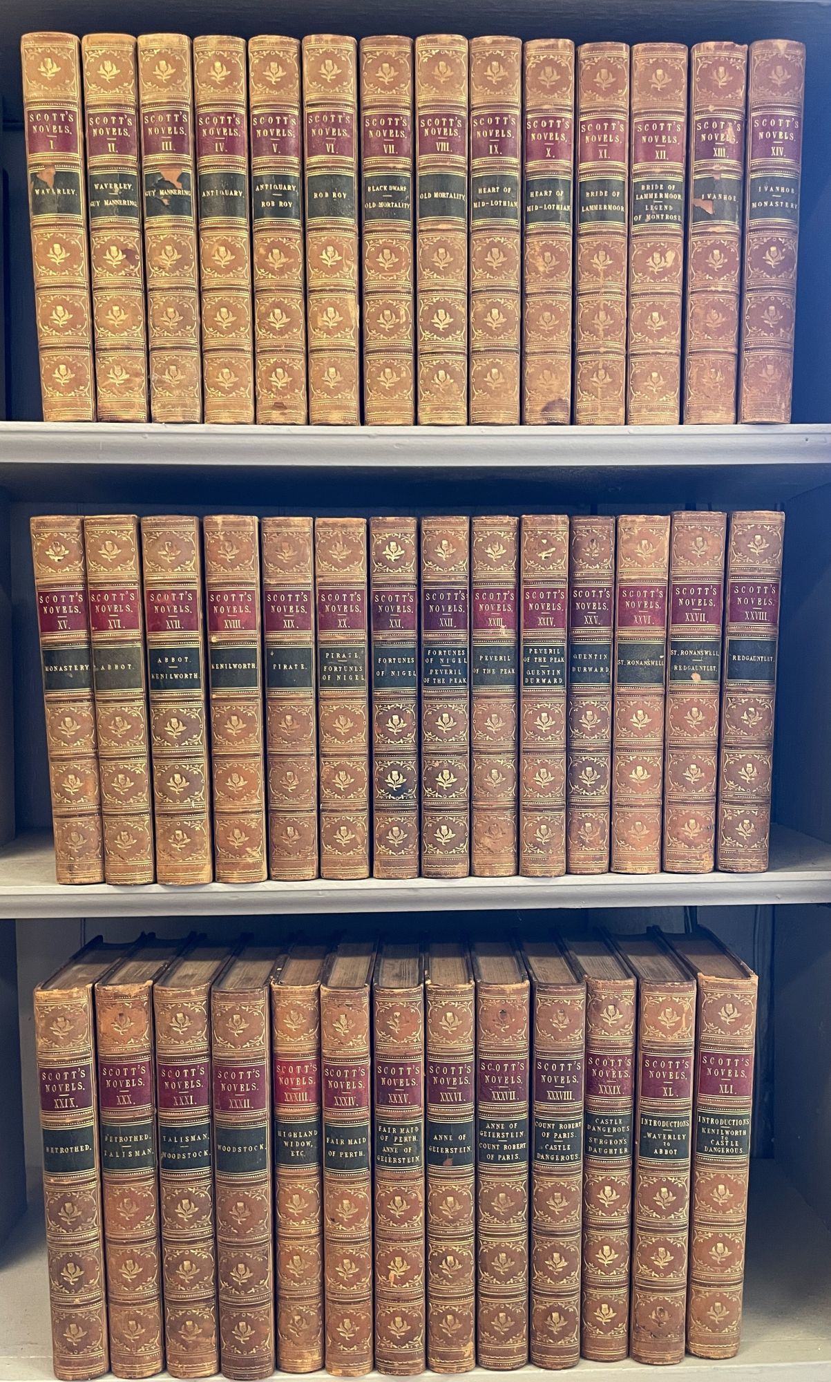 Edinburgh: Archibald, Constable and Co.; Cadell and Co (1819-33), 1819. Early and first editions. Hardcover. Very Good +. 41 volumes, uniformly bound in full calf, mid 19thC. All volumes with the ownership name of Mary Ellen Lowell dated 1854, she being presumably a member of the Boston Brahmin Lowell clan. Volumes numbered I - XXV of this assembled set were published by Archibald Constable (Edinburgh) and various entities of Longman, Hurst Rees, Orme and Brown or Hurst Robinson and Co (London) fronm 1819 to 1824. Volume I is the third edition of Waverly; Volume XXV is Quentin Durand. Volume XXVI through Volume XLI were published by Cadell and Co (Edinburgh) and variously Longman, Reed, Orme, Brown and Green London) and Whittaker (London) from 1827 to 1833. Internally, these last 16 volumes are identified as Volumes I - XVI, and run from St. Ronanwell in Volume XXVI to an appendix with errata of The Surgeon's Daughter in Volume XLI. Tan, polished calf, gilt single-ruled covers, six compartmenst to spine, with gilt and red and black leather labels. Some labels variously chipped and edges moderately worn here and there. Internals quite nice throughout.