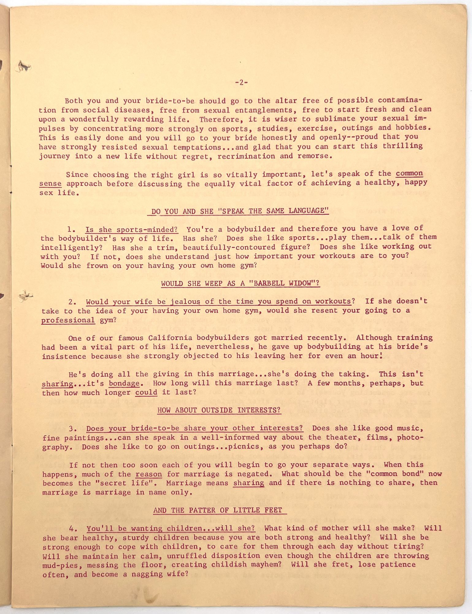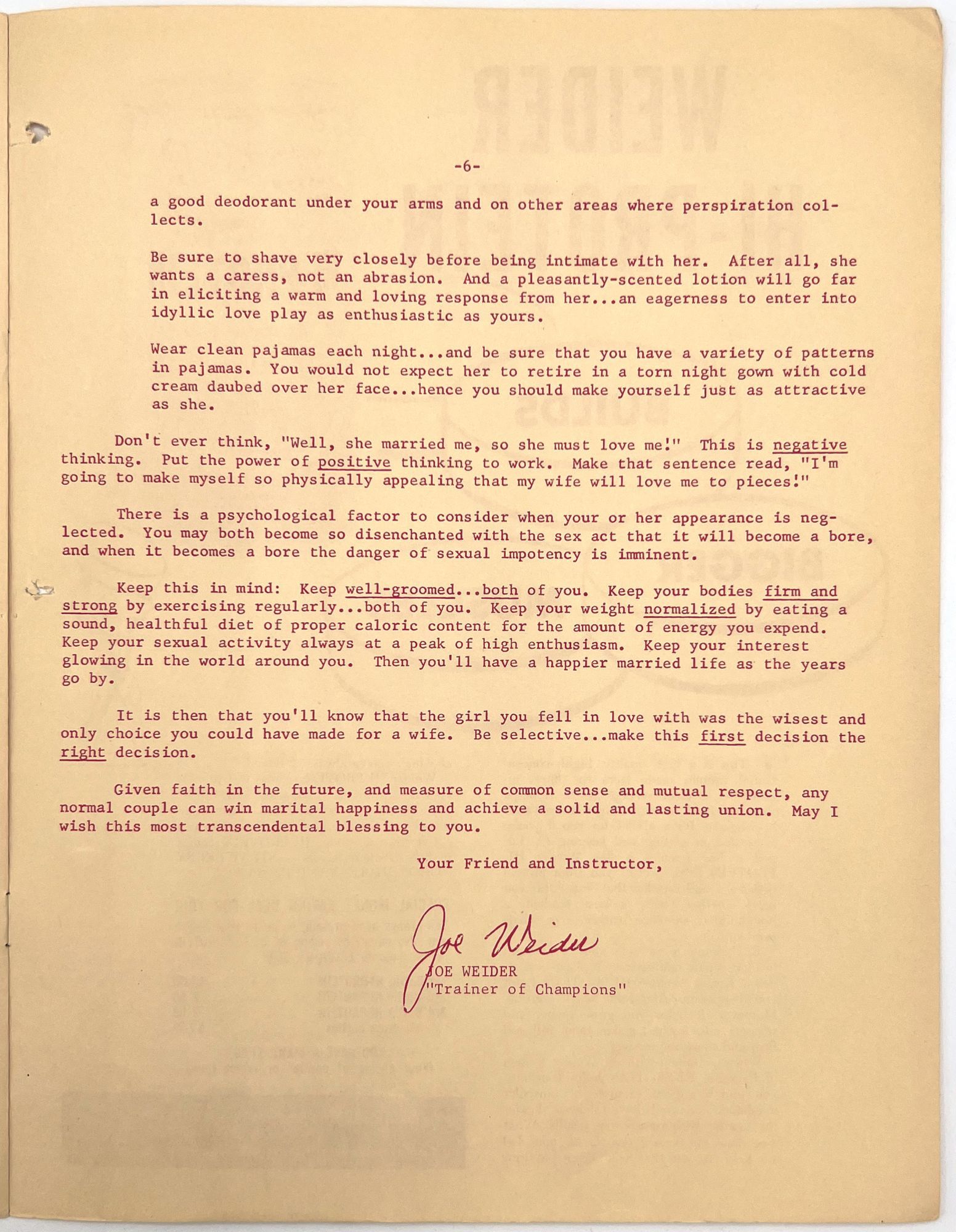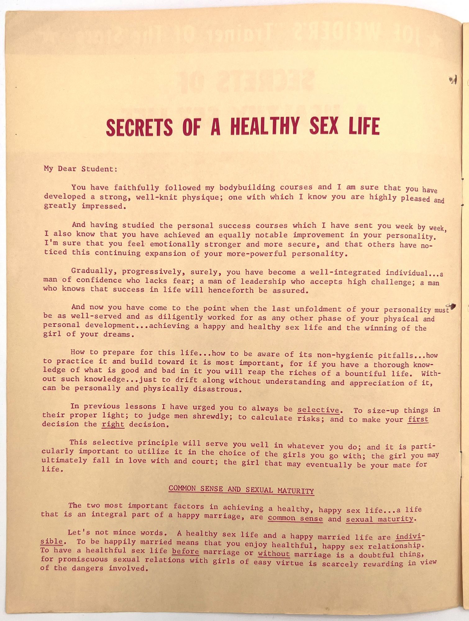 n.pl: Joe Weider, 1959. Very good to near-fine. Two perforations to left-hand margin where previous owner attempted to two-hole punch.. There's nothing more disgusting than a chain-smoking woman" states this sex education manual published by the celebrity bodybuilder Joe Weider. The booklet addresses impressionable boys and young men reading the booklet seeking advice from an older masculine authority on sex and marriage. Advises the reader not to marry a woman likely to become a nagging wife, or who doesn't enjoy sports. Instructs the reader to be a "good provider" and "gallant" and to avoid a "badly-controlled sex life". Advertises Weider's "Hi-Protein" muscle building supplement on the lower wrapper. A sex education booklet for young men very much of its time.