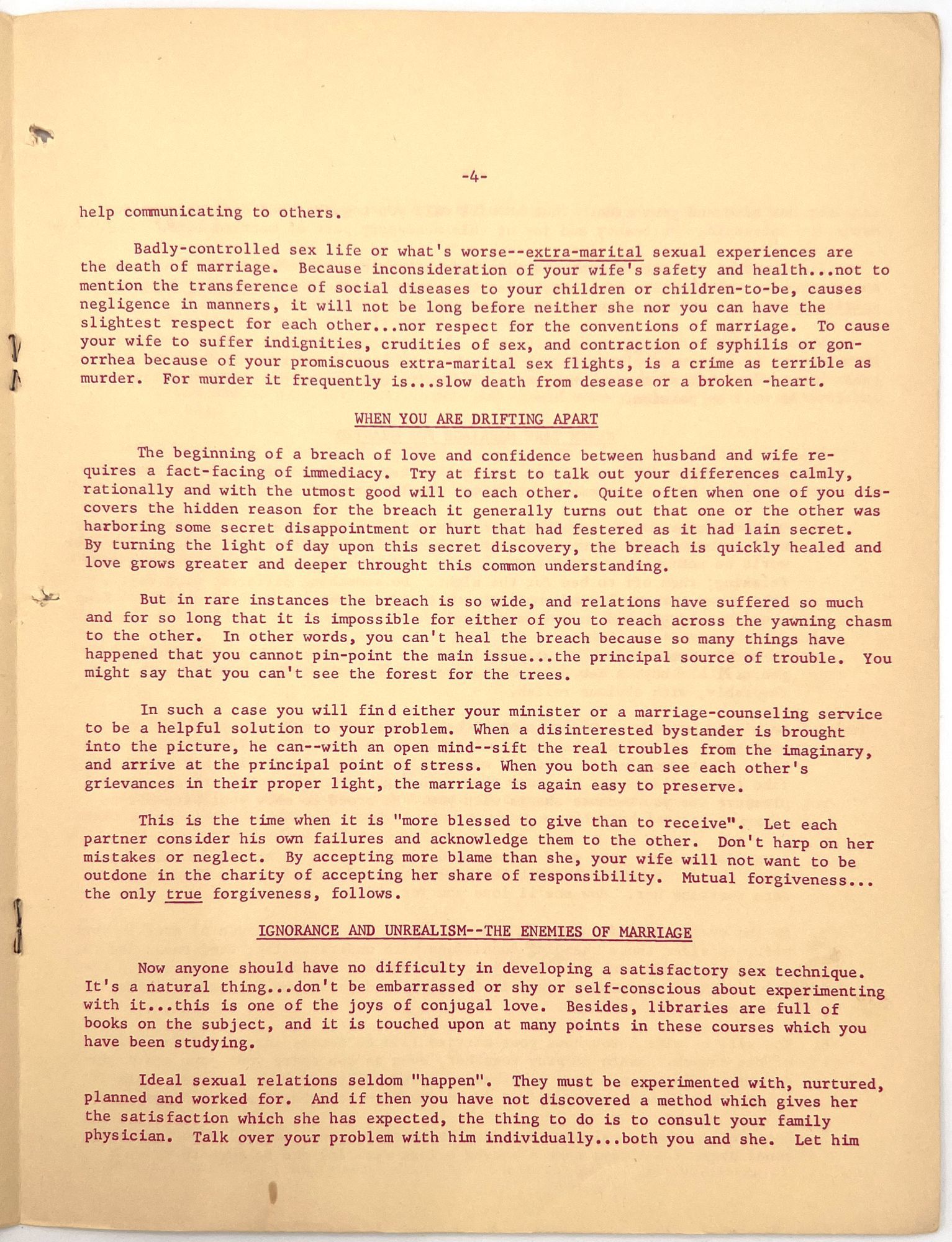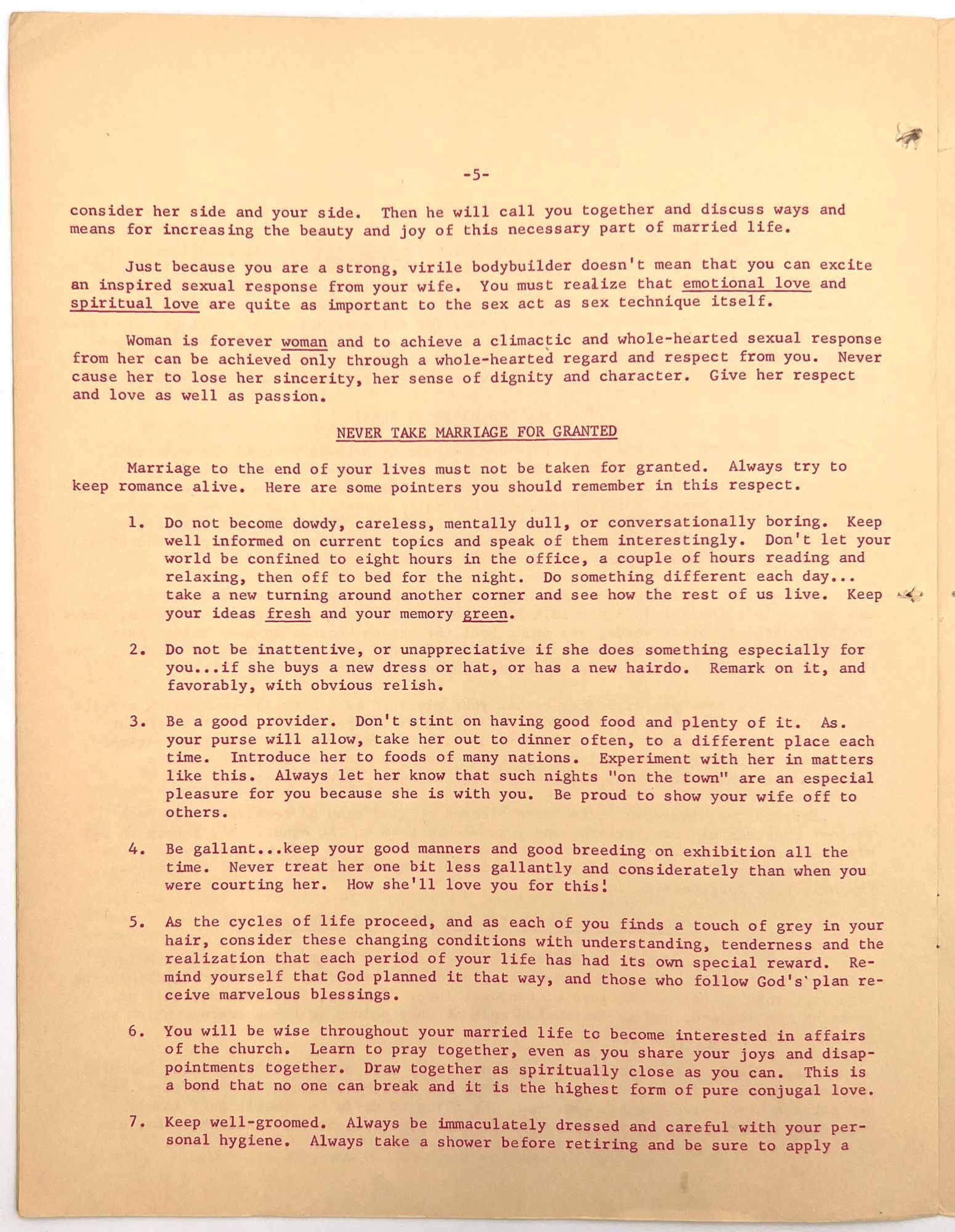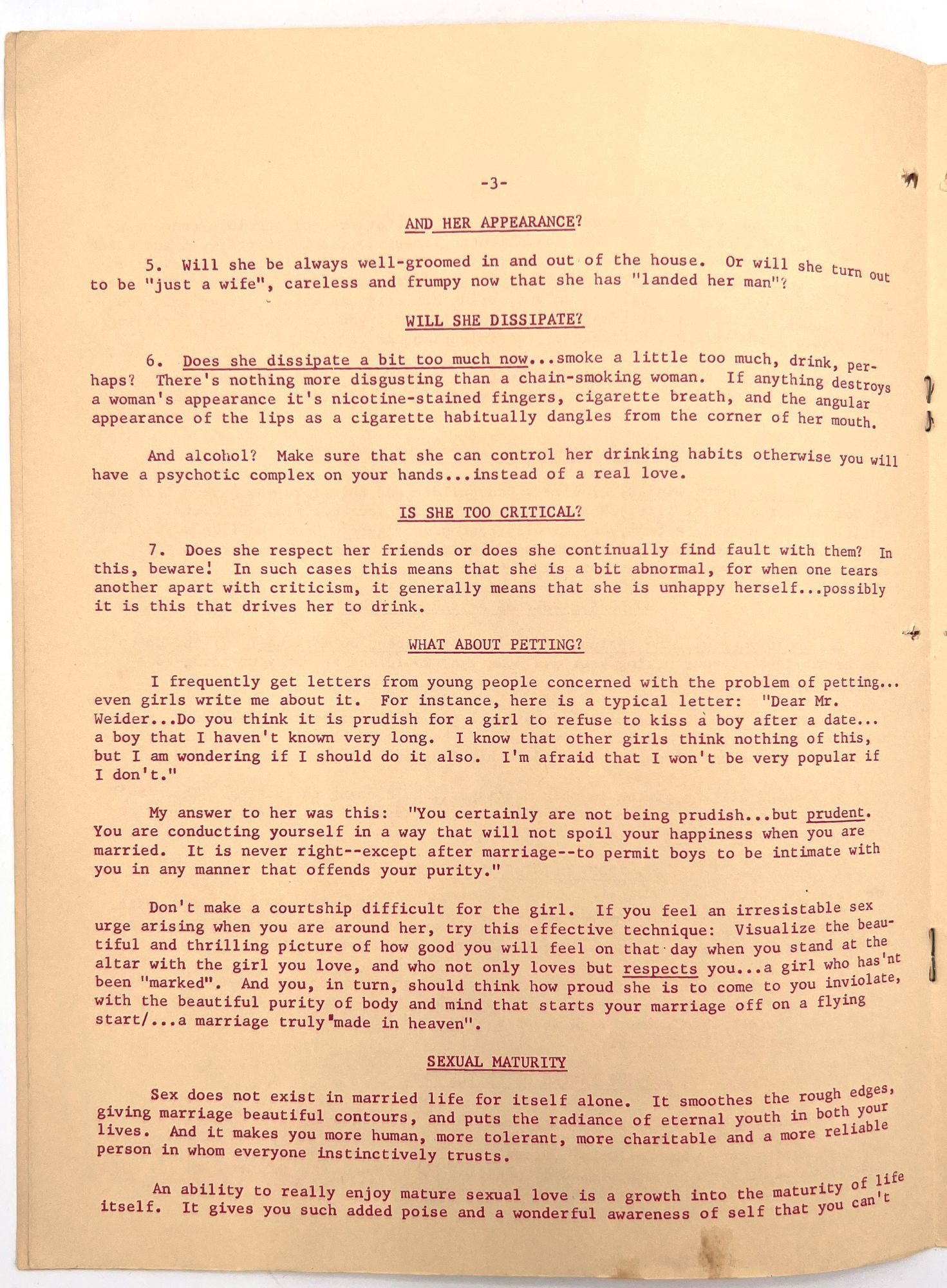 n.pl: Joe Weider, 1959. Very good to near-fine. Two perforations to left-hand margin where previous owner attempted to two-hole punch.. There's nothing more disgusting than a chain-smoking woman" states this sex education manual published by the celebrity bodybuilder Joe Weider. The booklet addresses impressionable boys and young men reading the booklet seeking advice from an older masculine authority on sex and marriage. Advises the reader not to marry a woman likely to become a nagging wife, or who doesn't enjoy sports. Instructs the reader to be a "good provider" and "gallant" and to avoid a "badly-controlled sex life". Advertises Weider's "Hi-Protein" muscle building supplement on the lower wrapper. A sex education booklet for young men very much of its time.