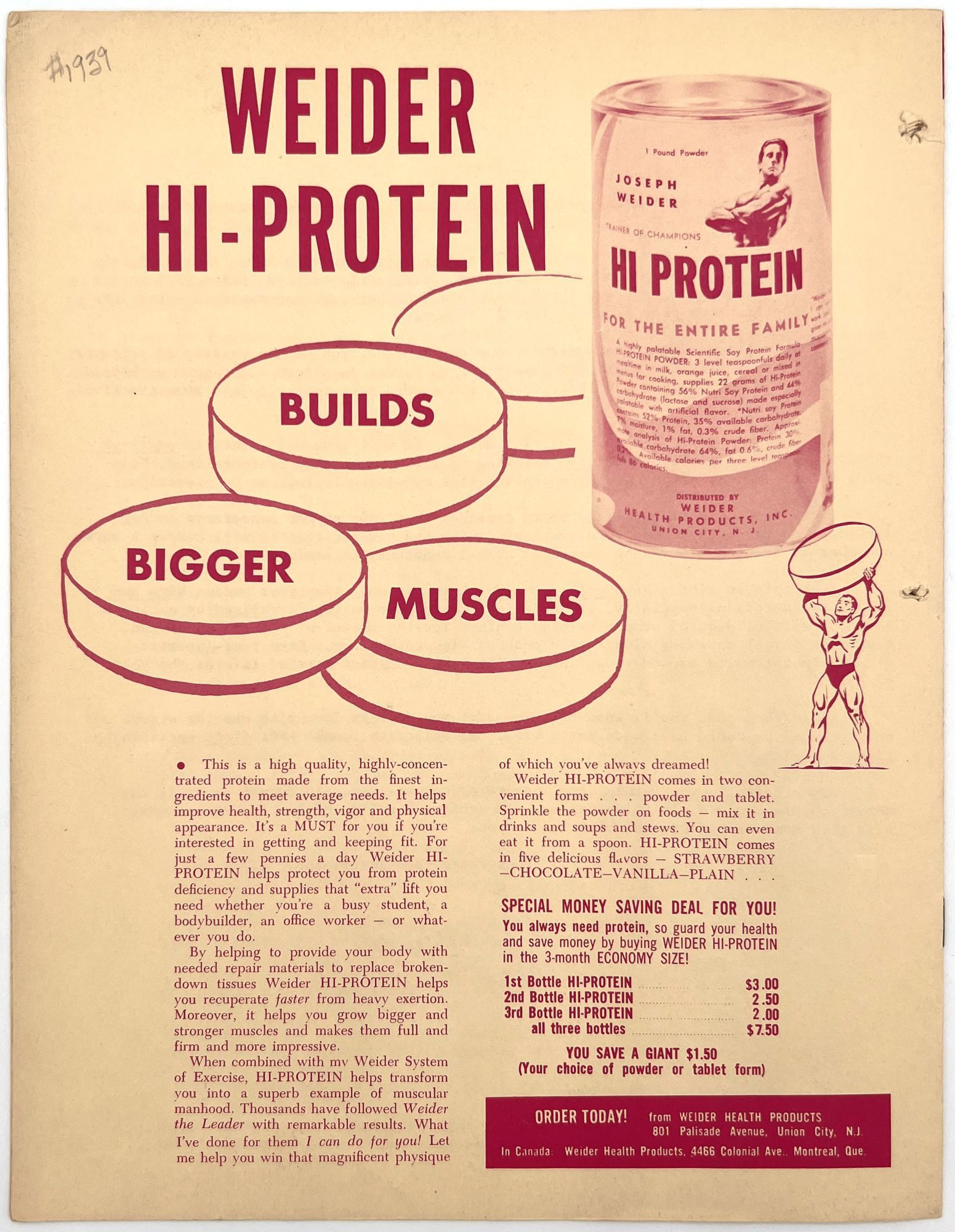Single volume (11" by 8.5"), pp. [2], 2-6, [1], stapled in original illustrated self-wrappers. Joseph Weider (1919-2013) was a Canadian bodybuilder and creator of the "Olympia" bodybuilding contests. He was one of the first celebrity bodybuilding influencers.