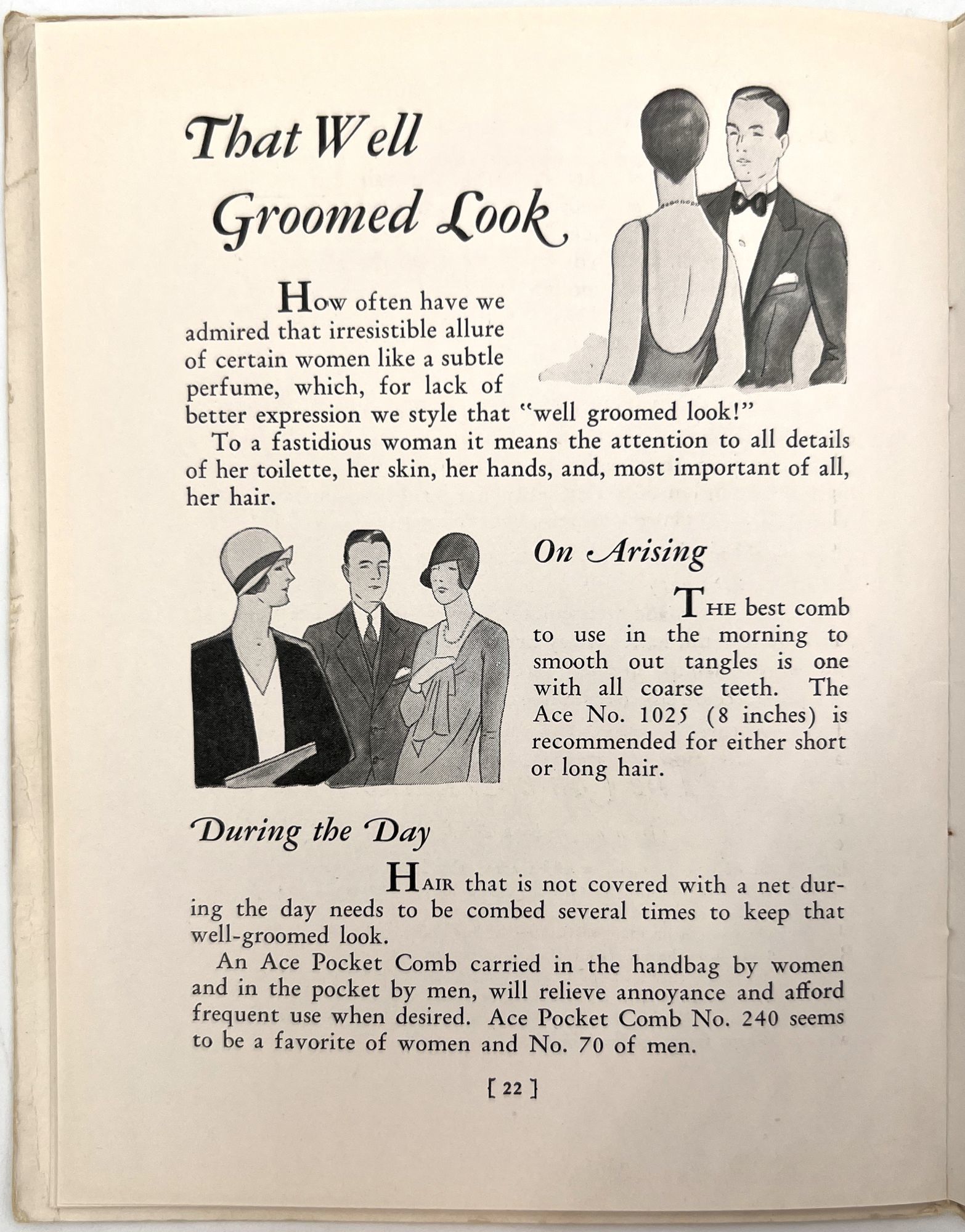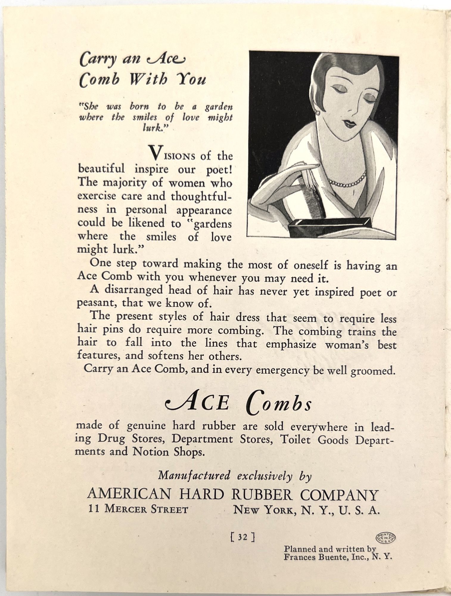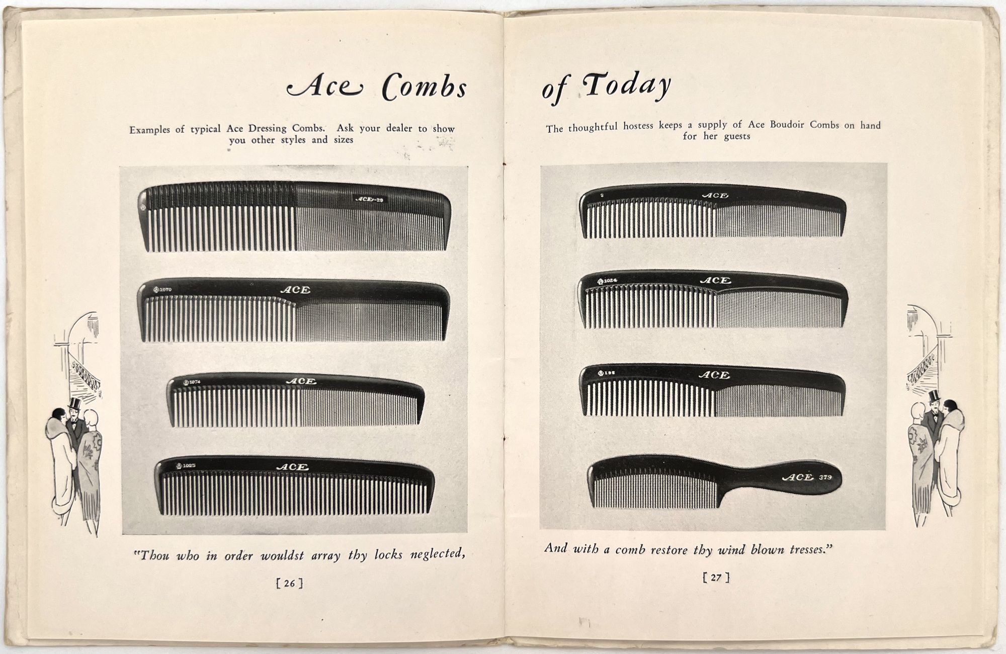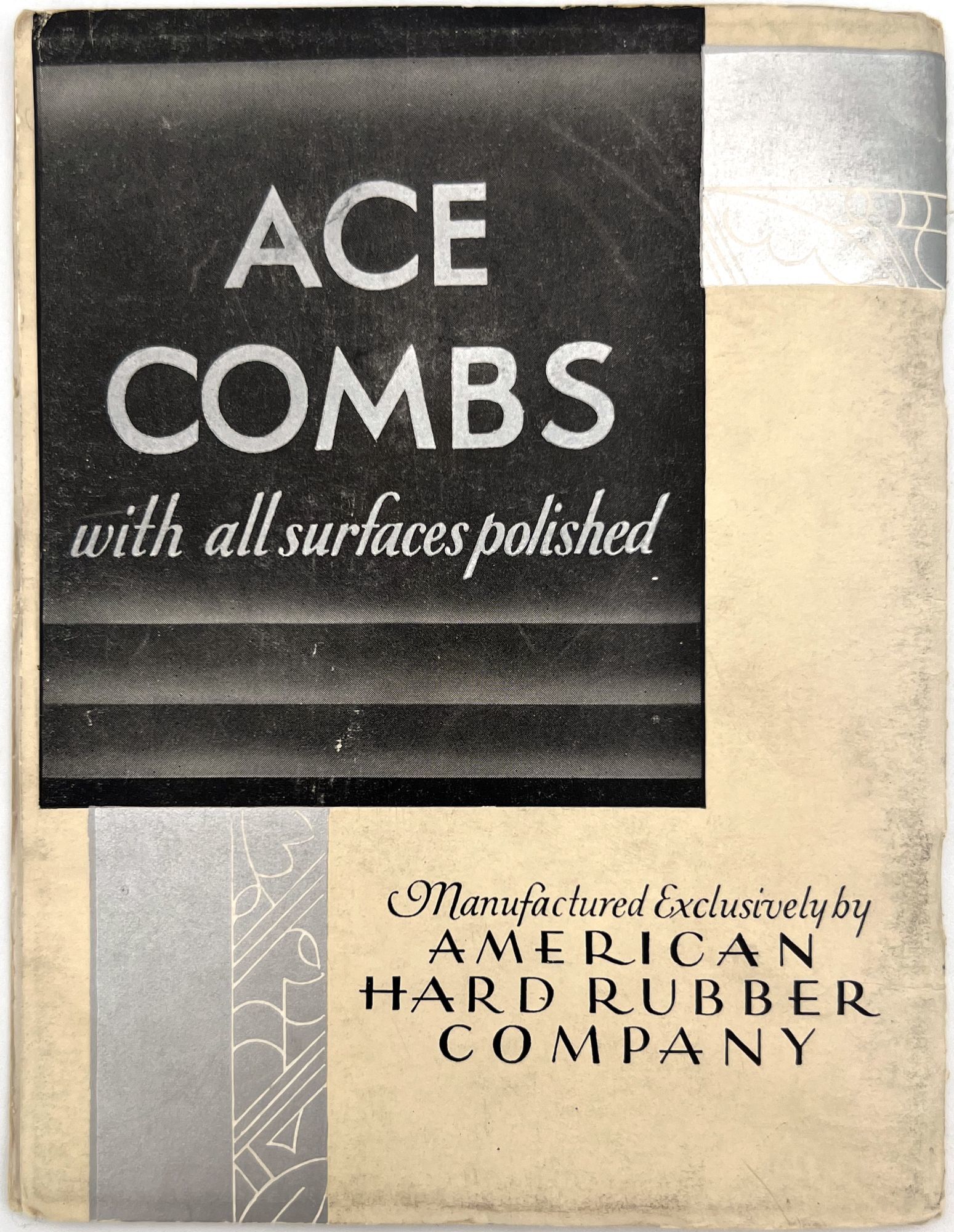 New York, New York: American Hard Rubber Company, 1920. Very good. Some rubbing, minor dust soiling. Corners bumped.. An illustrated advertising booklet for hard rubber "Ace" brand combs, marketed to fashionable women in the 1920s. Offers advice for proper hair care and how to make finger waves, and illustrates "Combs of Former Ages" from the Roman era, Renaissance era, Stone Age, etc. The next pages illustrate Ace combs and their sleek modern designs. Also of note in the booklet is the inclusion of "The Comb Maker", a 1568 poem "from a rare book" (p. 21). Includes some fabulous Art- Deco inspired images of women.