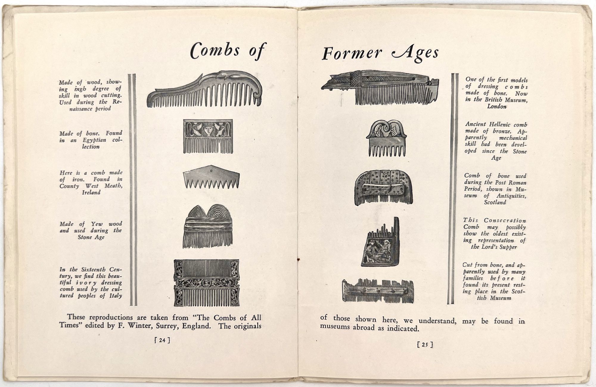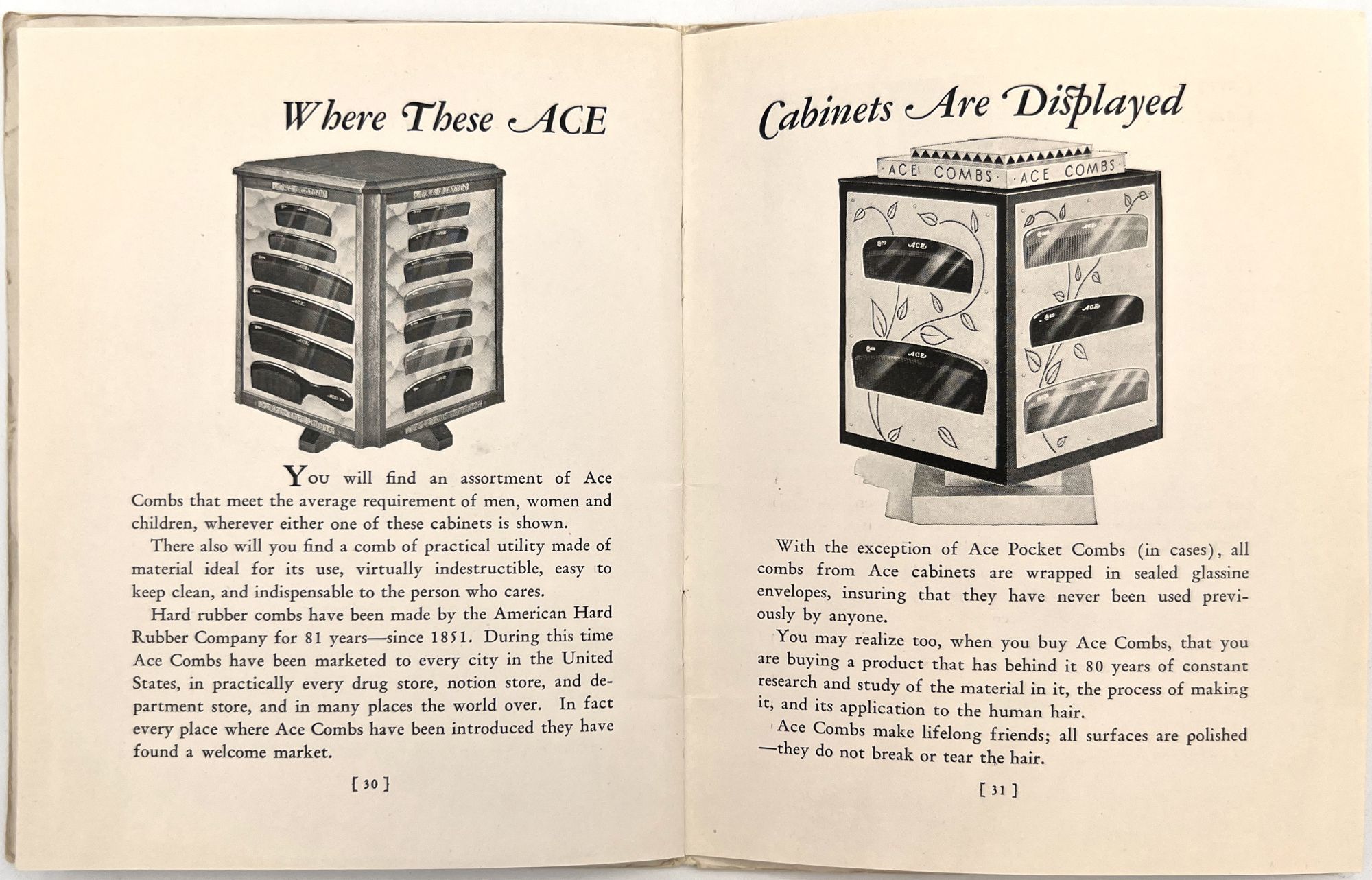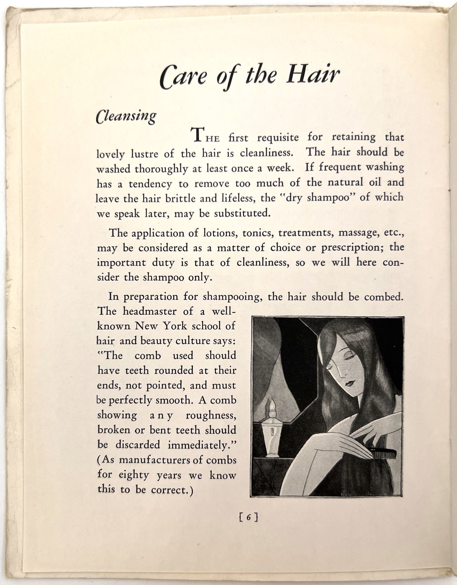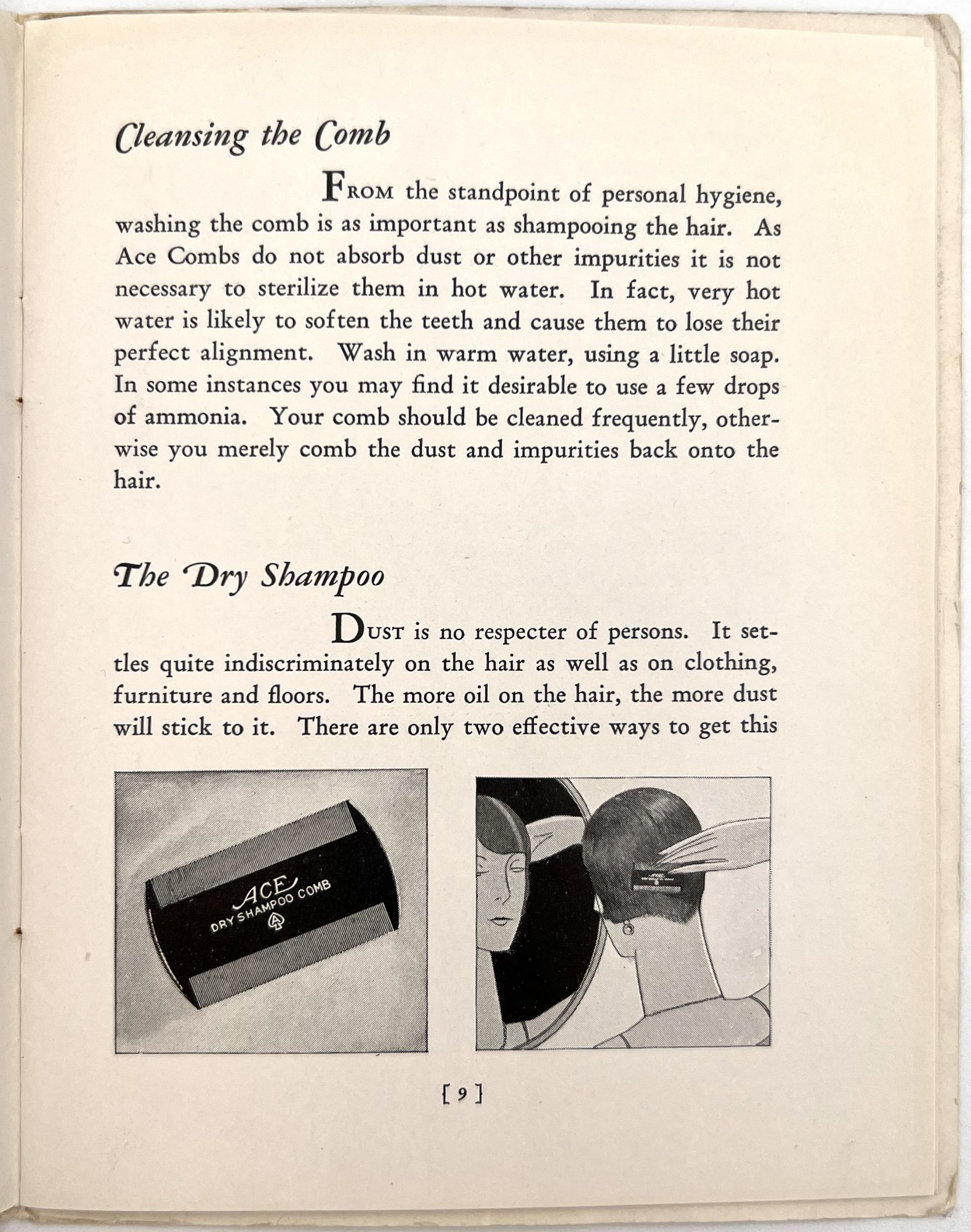 New York, New York: American Hard Rubber Company, 1920. Very good. Some rubbing, minor dust soiling. Corners bumped.. An illustrated advertising booklet for hard rubber "Ace" brand combs, marketed to fashionable women in the 1920s. Offers advice for proper hair care and how to make finger waves, and illustrates "Combs of Former Ages" from the Roman era, Renaissance era, Stone Age, etc. The next pages illustrate Ace combs and their sleek modern designs. Also of note in the booklet is the inclusion of "The Comb Maker", a 1568 poem "from a rare book" (p. 21). Includes some fabulous Art- Deco inspired images of women.