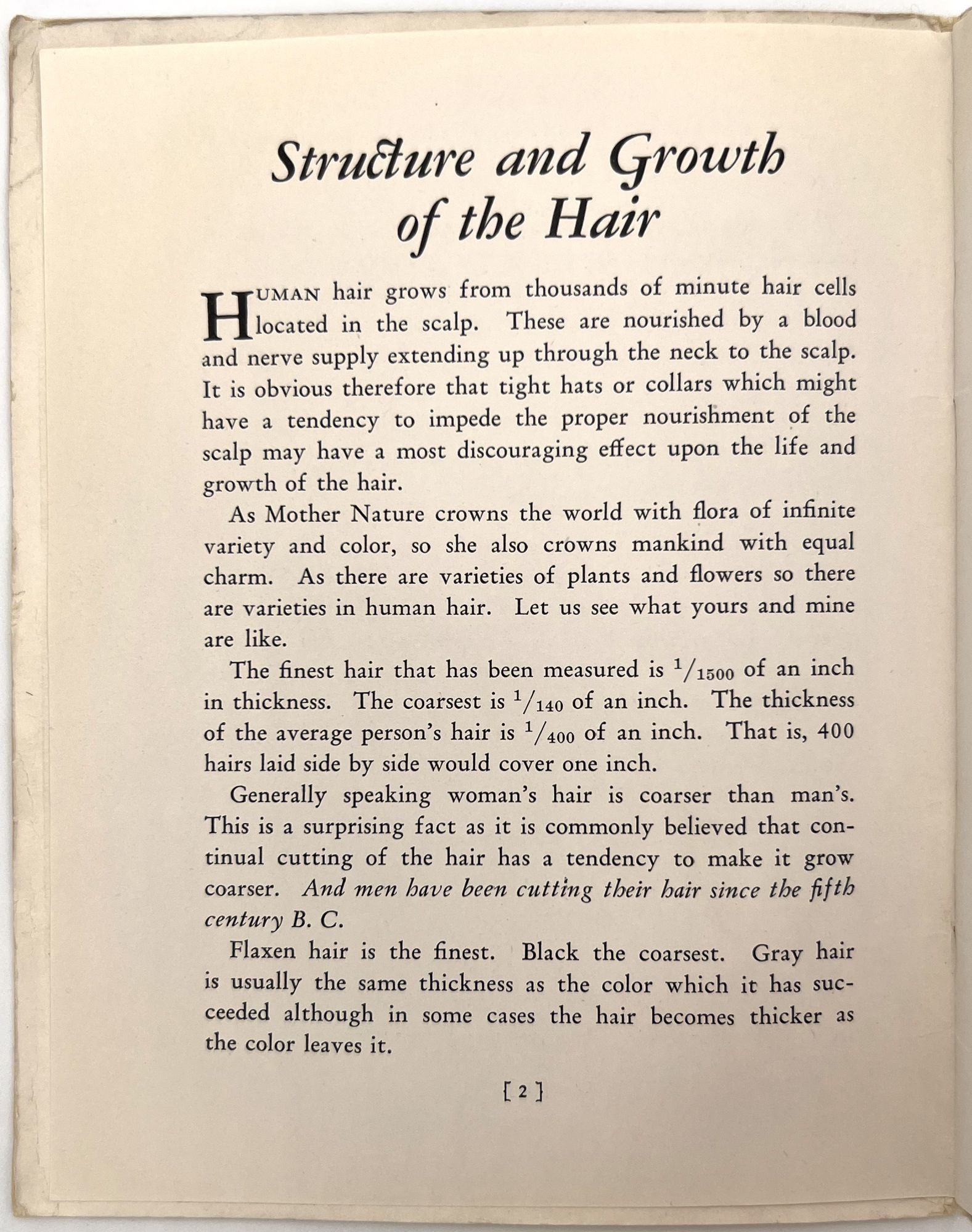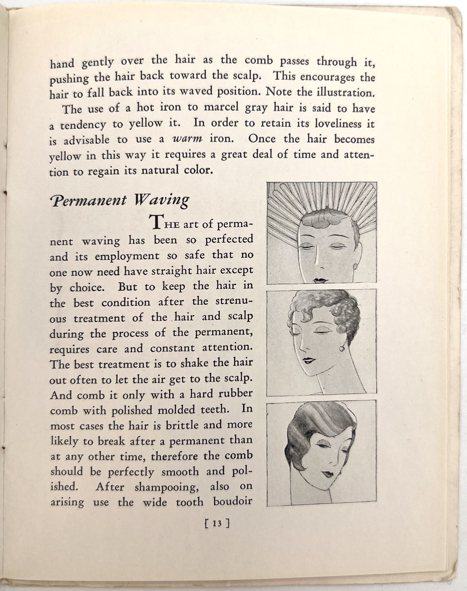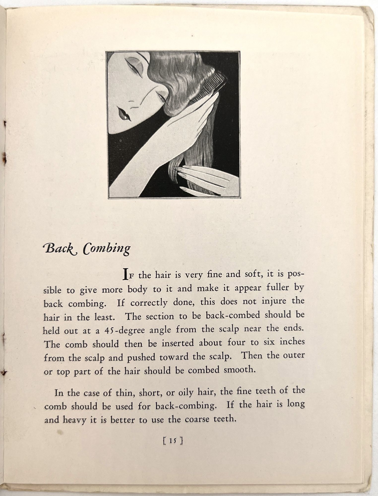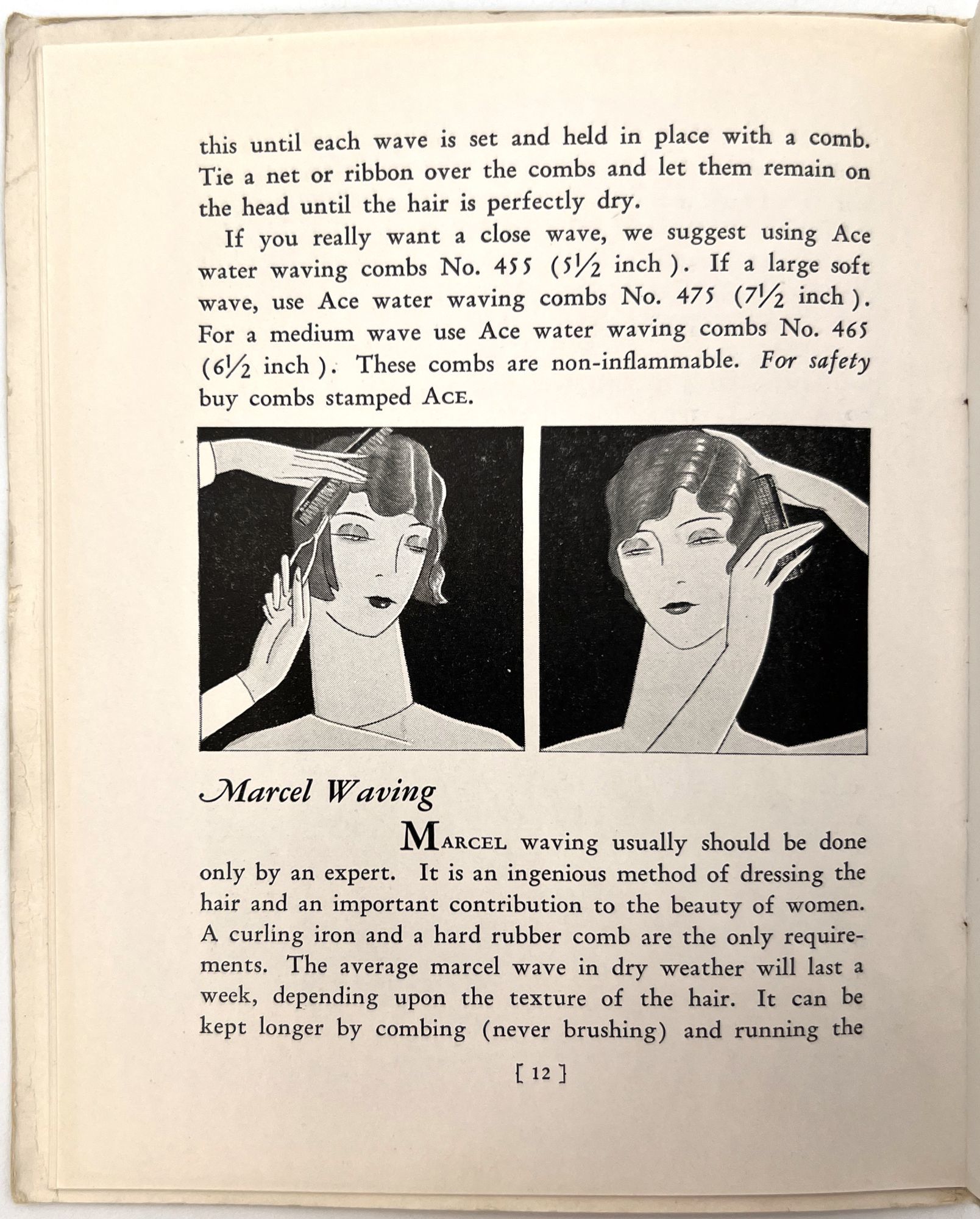 New York, New York: American Hard Rubber Company, 1920. Very good. Some rubbing, minor dust soiling. Corners bumped.. An illustrated advertising booklet for hard rubber "Ace" brand combs, marketed to fashionable women in the 1920s. Offers advice for proper hair care and how to make finger waves, and illustrates "Combs of Former Ages" from the Roman era, Renaissance era, Stone Age, etc. The next pages illustrate Ace combs and their sleek modern designs. Also of note in the booklet is the inclusion of "The Comb Maker", a 1568 poem "from a rare book" (p. 21). Includes some fabulous Art- Deco inspired images of women.