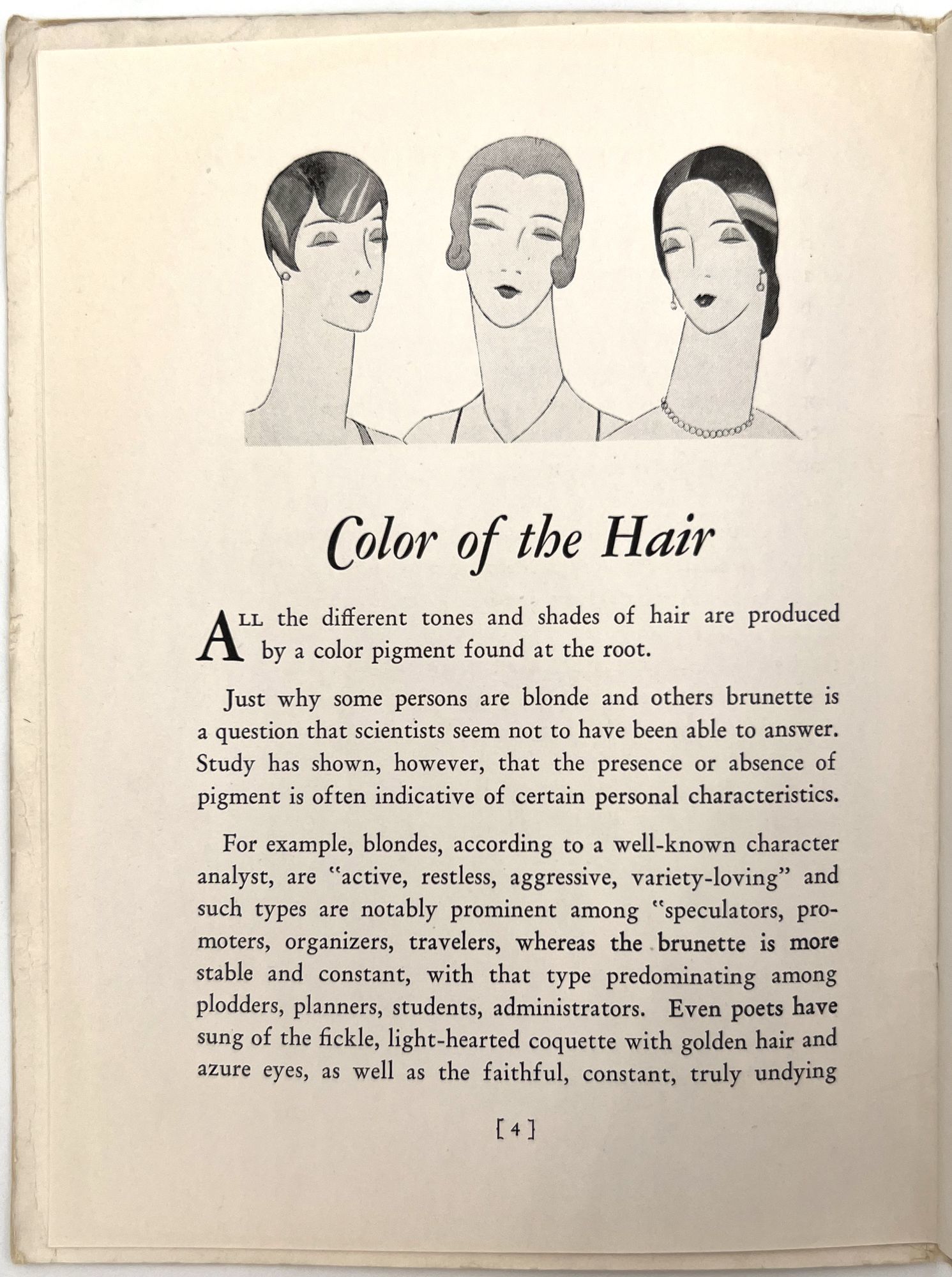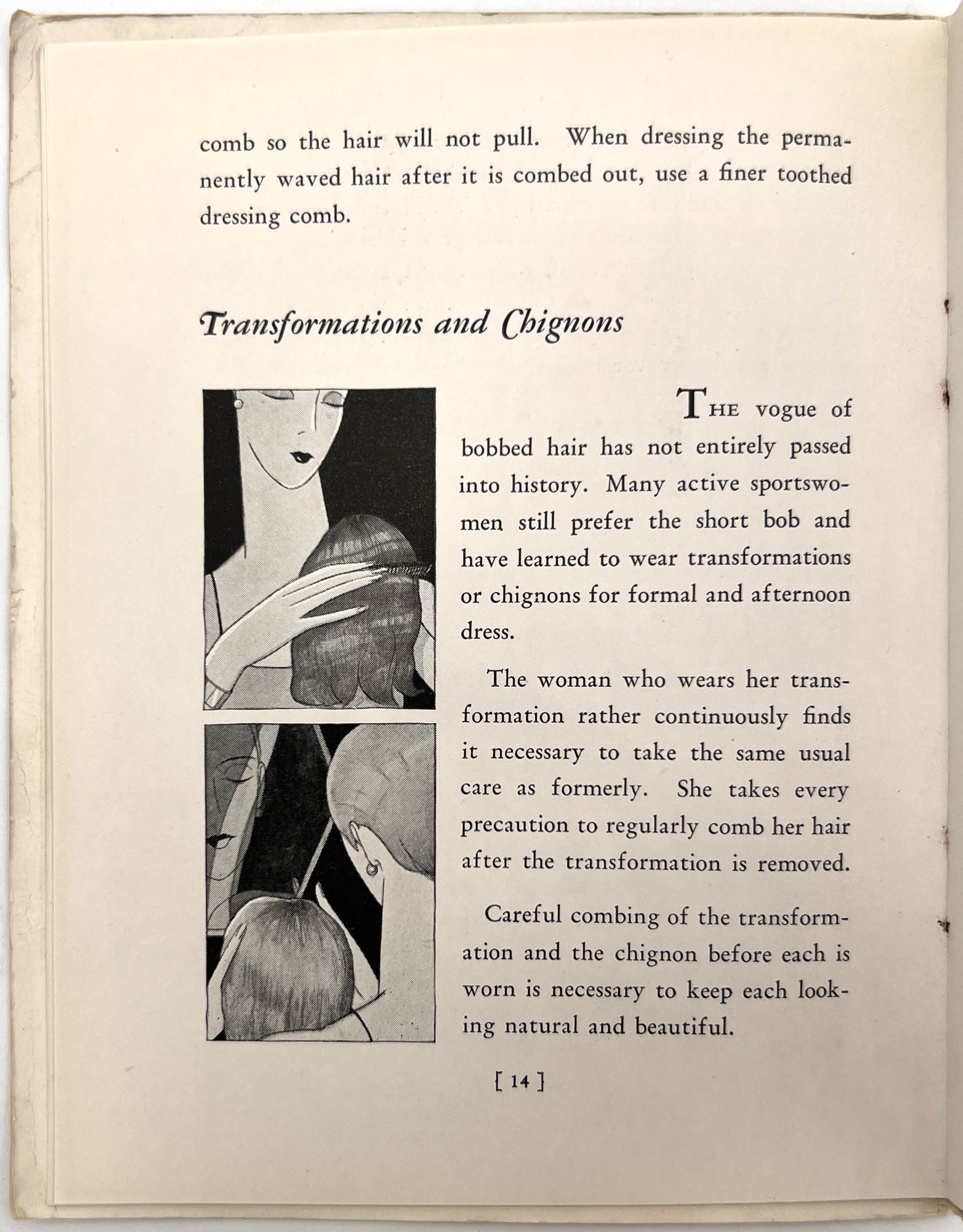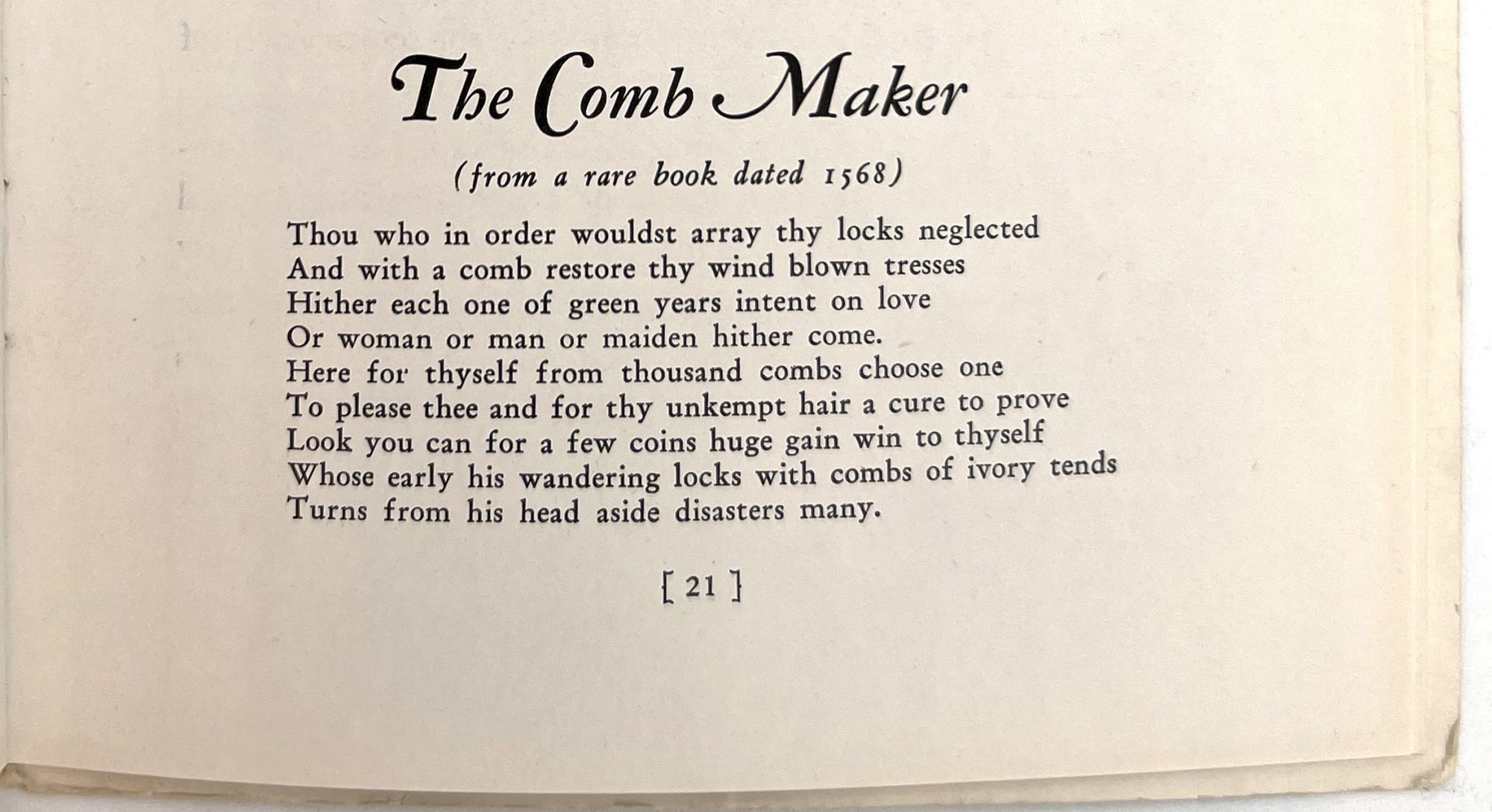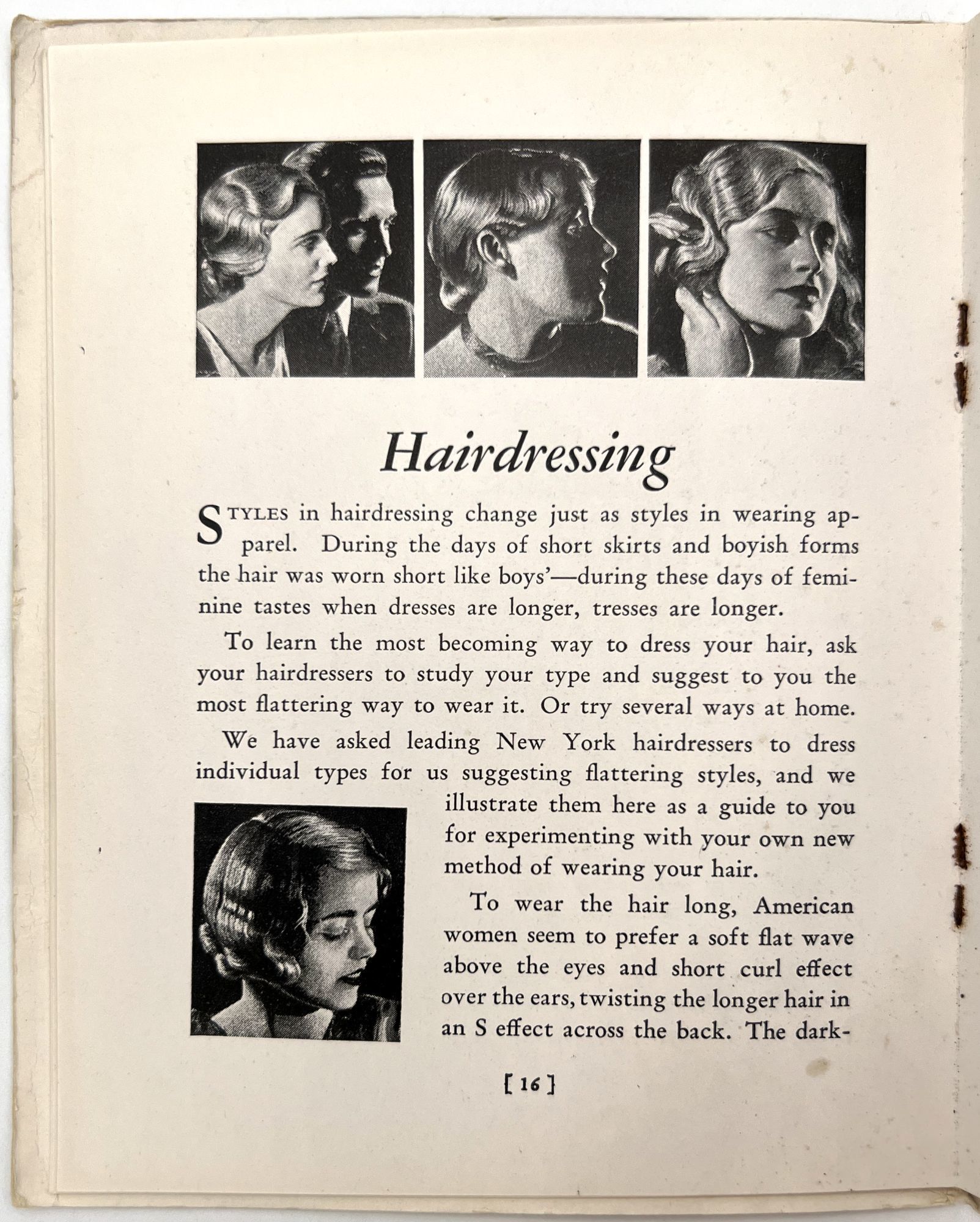 New York, New York: American Hard Rubber Company, 1920. Very good. Some rubbing, minor dust soiling. Corners bumped.. An illustrated advertising booklet for hard rubber "Ace" brand combs, marketed to fashionable women in the 1920s. Offers advice for proper hair care and how to make finger waves, and illustrates "Combs of Former Ages" from the Roman era, Renaissance era, Stone Age, etc. The next pages illustrate Ace combs and their sleek modern designs. Also of note in the booklet is the inclusion of "The Comb Maker", a 1568 poem "from a rare book" (p. 21). Includes some fabulous Art- Deco inspired images of women.