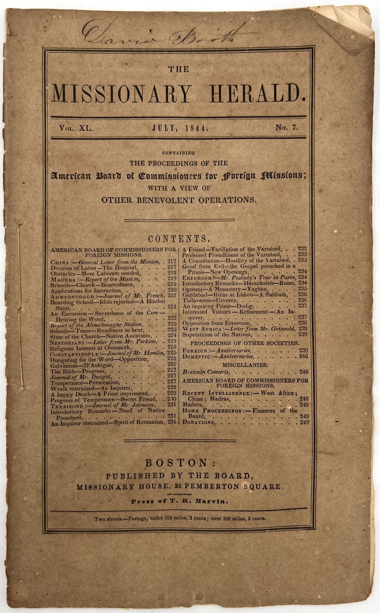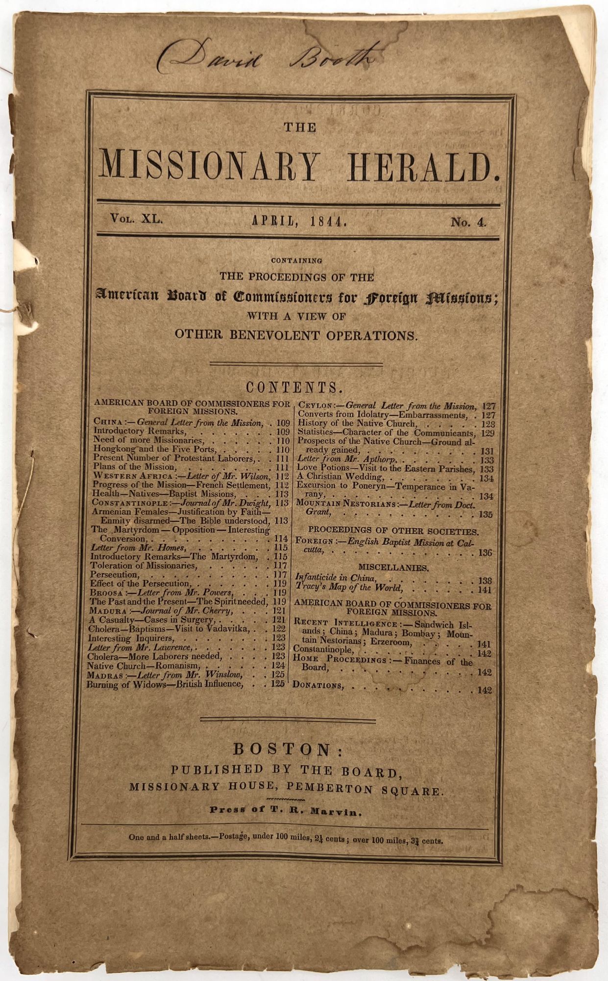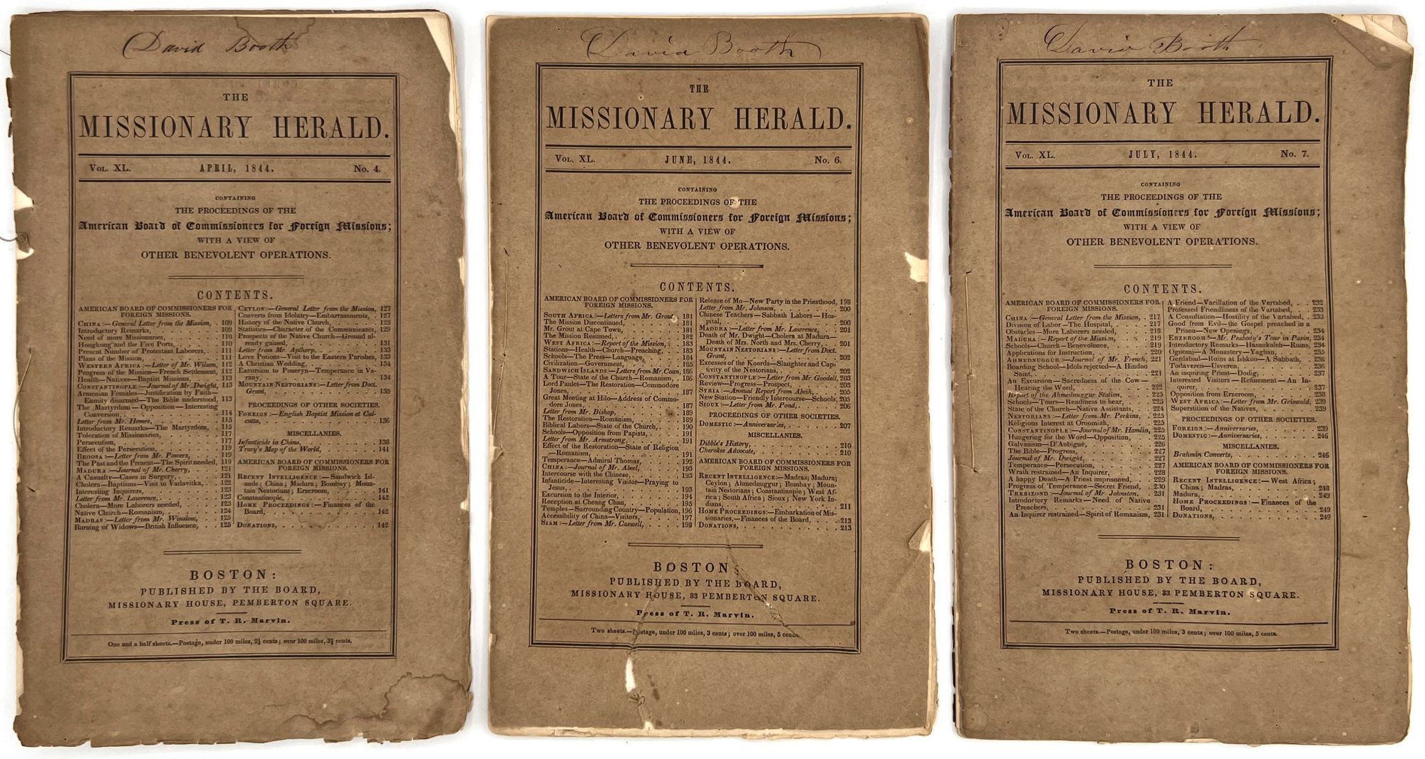 Three issues, each 8vo (9.75" by 6"), approx. thirty pages each, sewn in the original printed brown wrappers with title and contents on upper wrapper. Ink ownership signature of David Booth to upper wrapper. The American Board of Commissioners for Foreign Missions was founded in 1810, and was a Congregationalist organization devoted to supporting missionary work domestically and internationally.