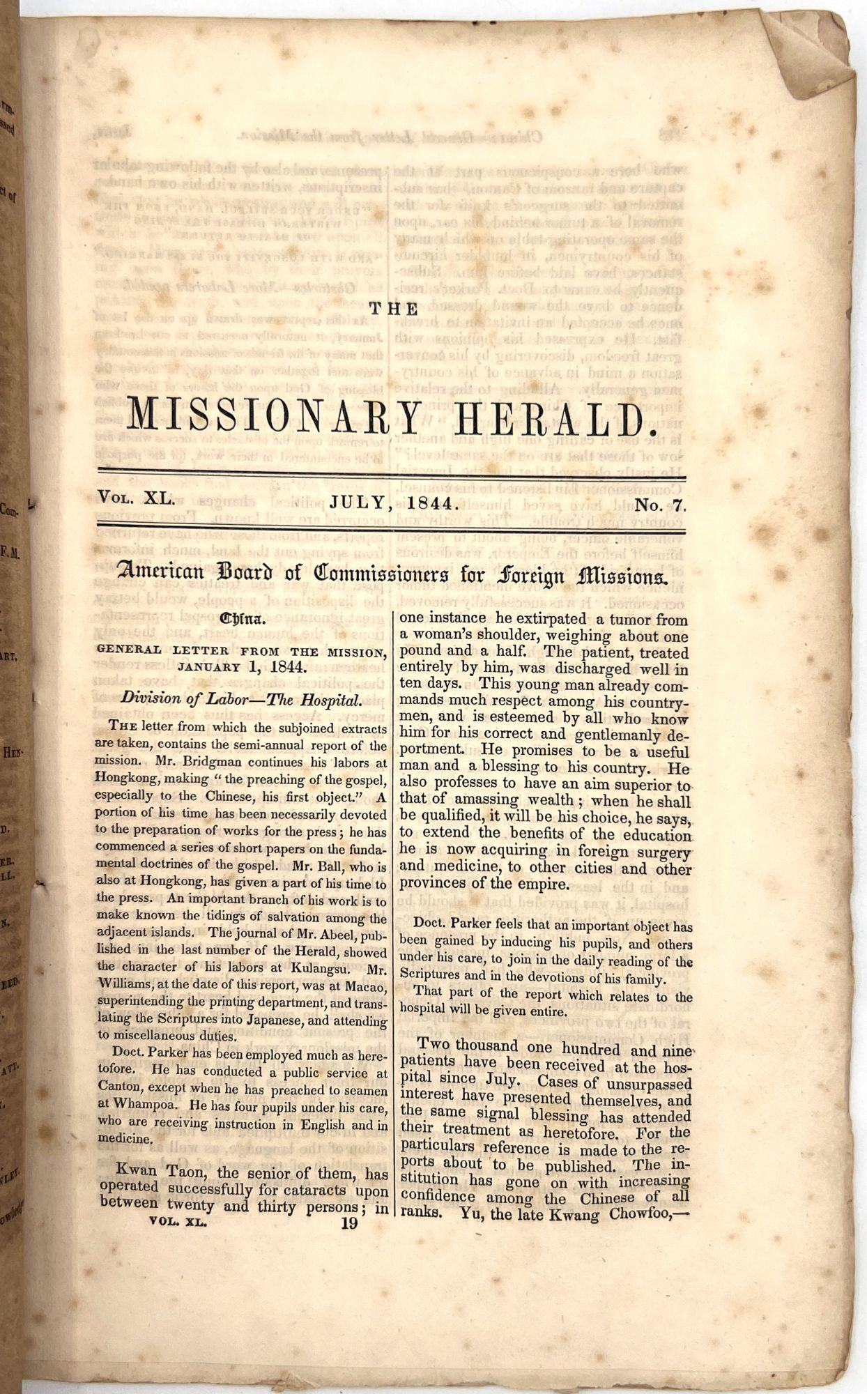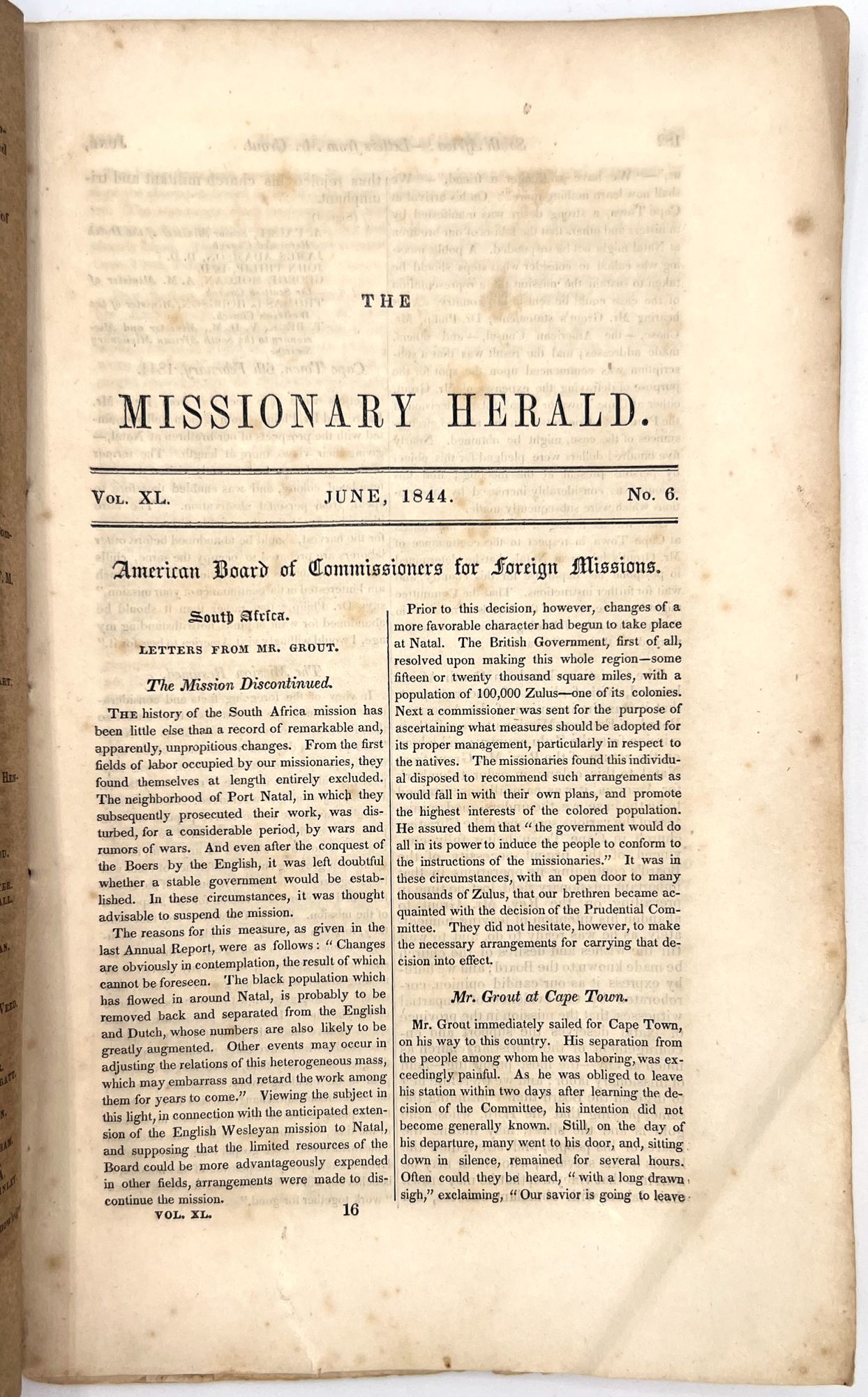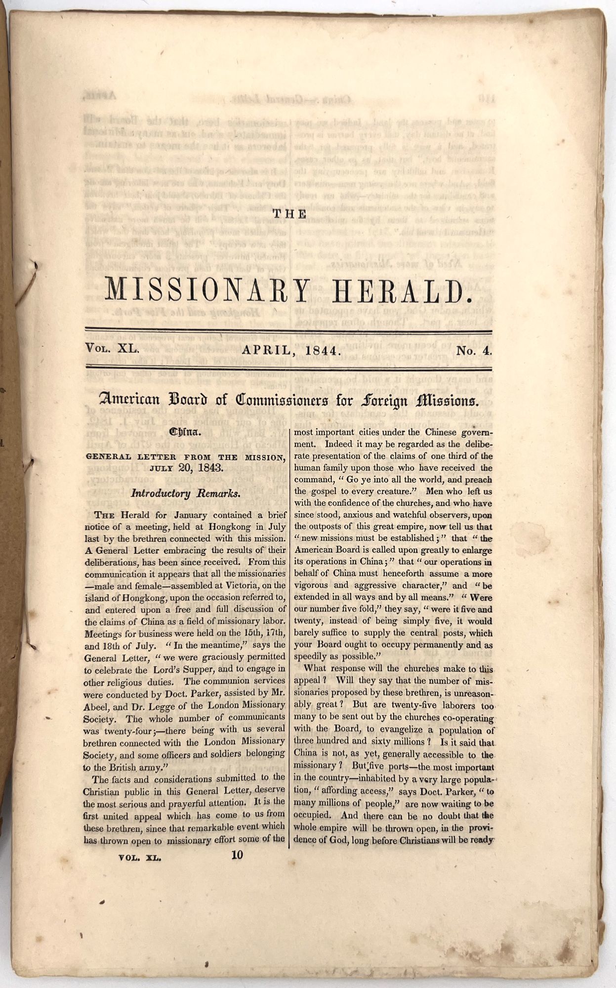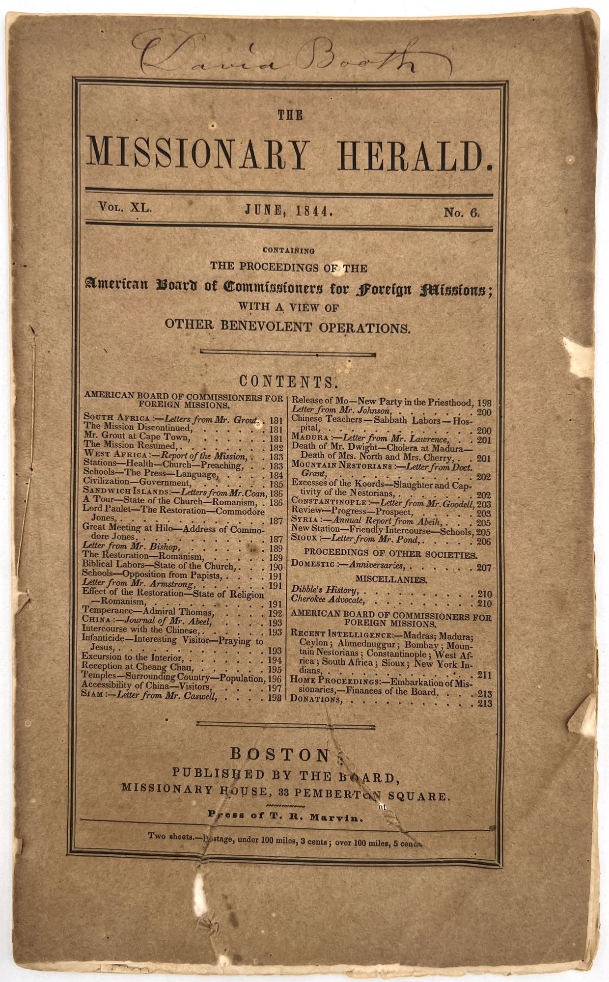 Boston, Massachusetts: American Board of Commissioners for Foreign Missions, 1844. Very good. Chipping and wear to wrappers. Minor toning, dust soiling, small water stains.. Vol. XL, Nos. 4, 6, and 7 of The Missionary Herald, a serial published in Boston by the American Board of Commissioners for Foreign Missions (ABCFM). The present issue publishes news from their members doing missionary work in Africa, the Sandwich Islands, China, Syria, and Constantinople, among other locations. Includes an article about the "Excesses of the Koords--Slaughter and Capitivity of the Nestorians", infanticide in China, and schooling in West Africa, as well as news from missionaries with the Sioux nation. An important record of missionary activity.