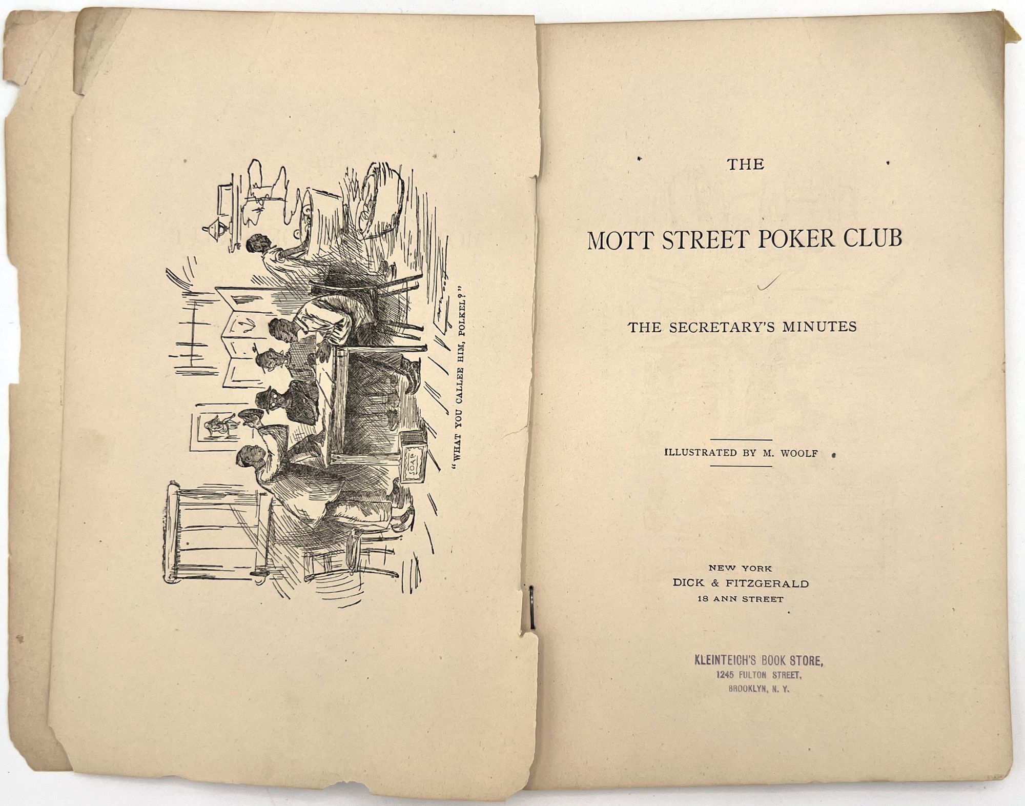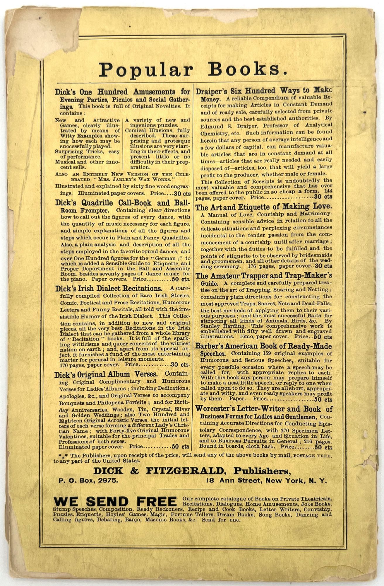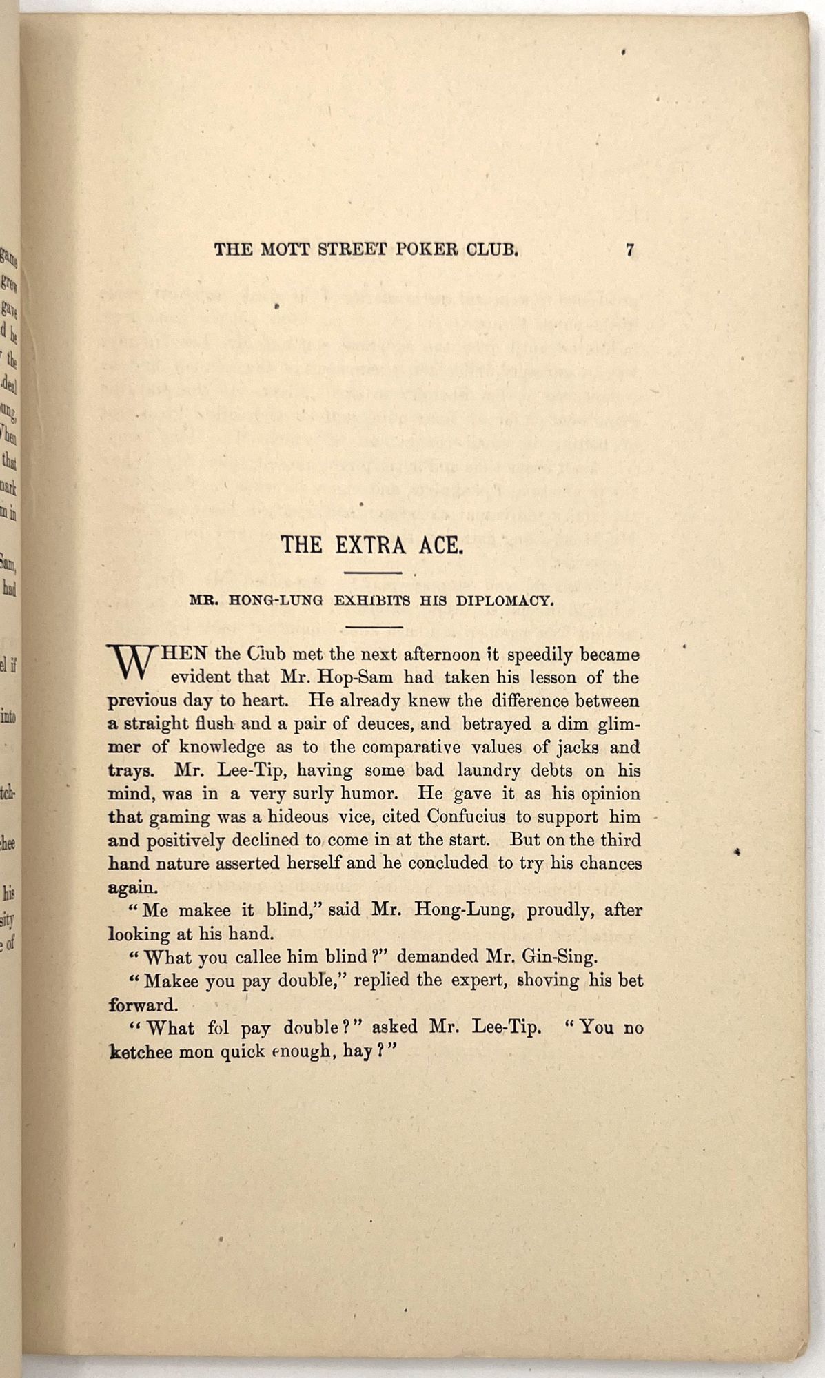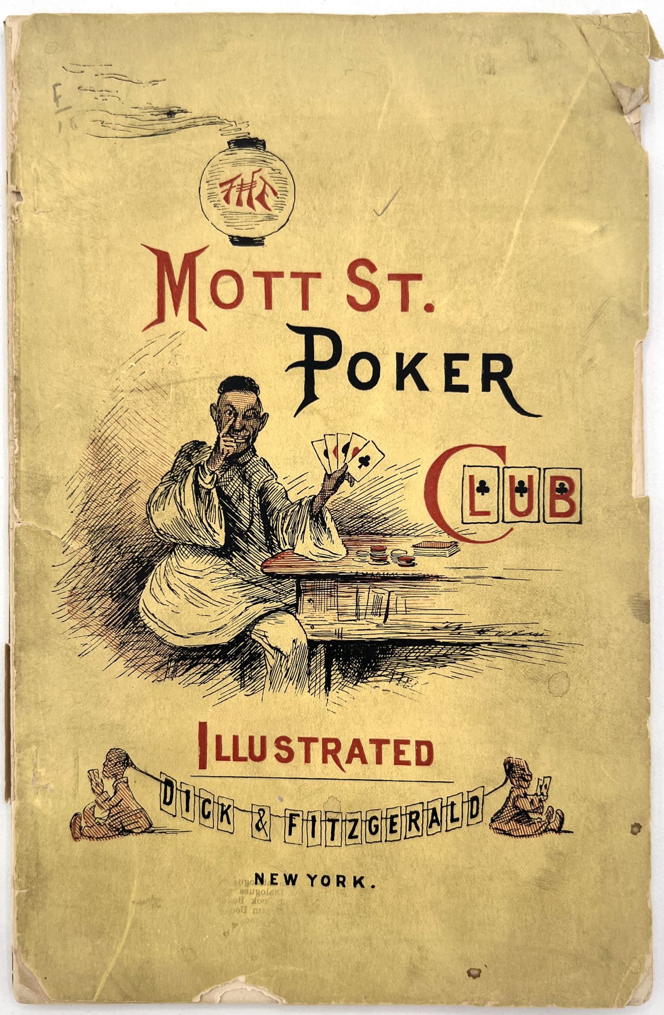 New York, New York: Dick & Fitzgerald, 1888. Good to very good. Upper wrapper detached. Minor toning, dust soiling, chipping to extremities and spine. One or two minor stains. Paper brittle.. First edition, scarce, with only 3 copies listed on OCLC as of March 2023. "The Mott Street Poker Club" is a fictional account revealing the underground card and gambling scene in New York's Chinatown. Utilizes common anti-Asian stereotypes and sentiments from the time, including frequent use of a phoneticized "Chinese accent". The anonymous author, Alfred Trumble (dates unknown, possibly pseudonym?), wrote several books on eclectic subjects ranging from New York's underground card scene to the Crusades (with illustrations by Gustave Doré), Dickens' interest in jails, Parisian night life, and "The Mysteries of Mormonism". He is an odd and shadowy character begging for further research by scholars.