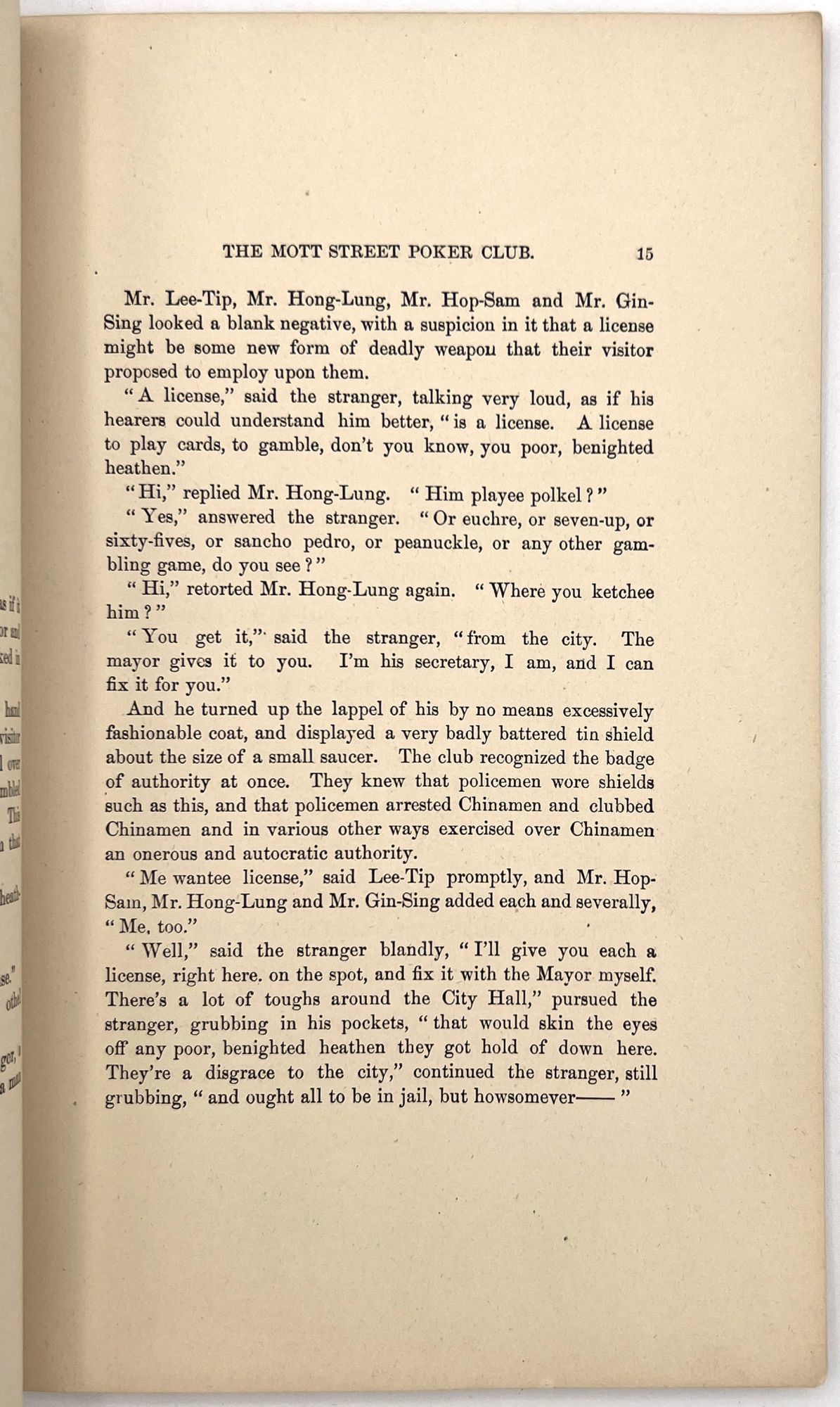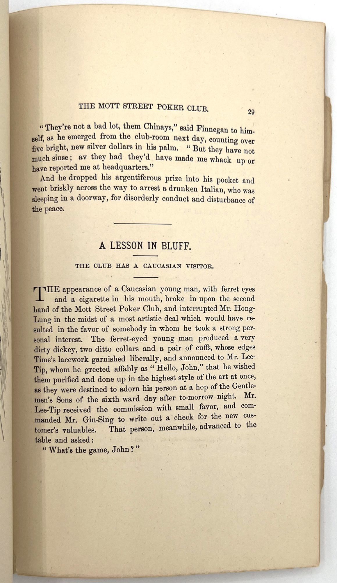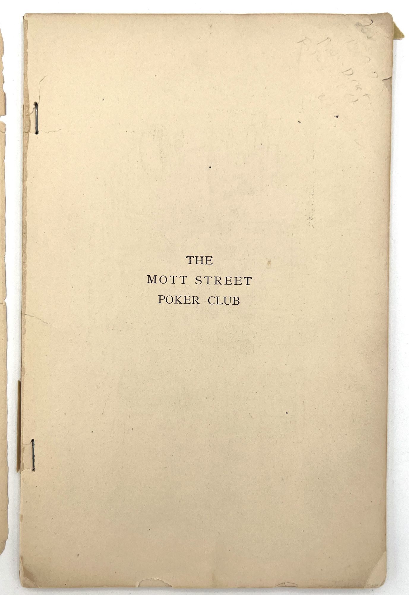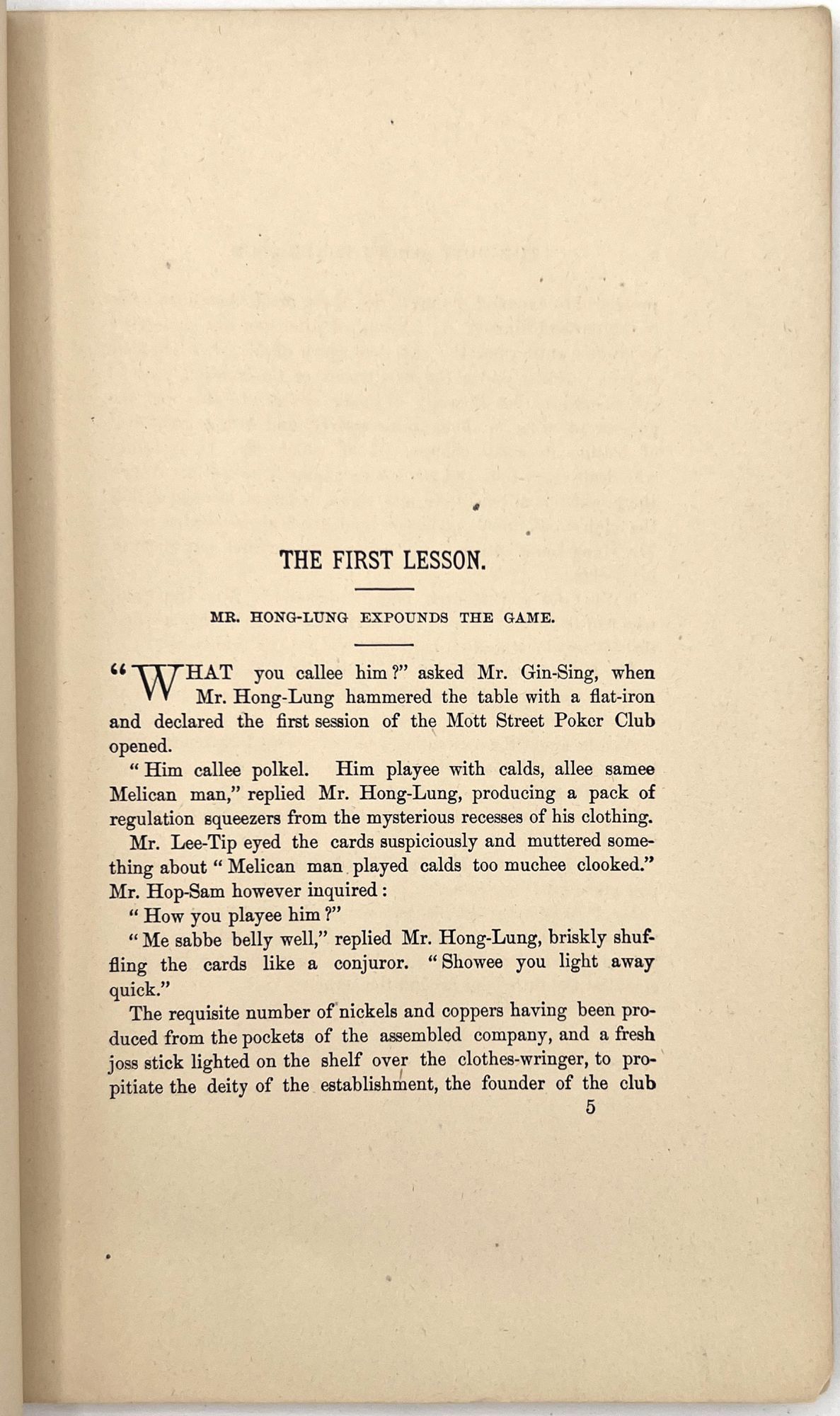New York, New York: Dick & Fitzgerald, 1888. Good to very good. Upper wrapper detached. Minor toning, dust soiling, chipping to extremities and spine. One or two minor stains. Paper brittle.. First edition, scarce, with only 3 copies listed on OCLC as of March 2023. "The Mott Street Poker Club" is a fictional account revealing the underground card and gambling scene in New York's Chinatown. Utilizes common anti-Asian stereotypes and sentiments from the time, including frequent use of a phoneticized "Chinese accent". The anonymous author, Alfred Trumble (dates unknown, possibly pseudonym?), wrote several books on eclectic subjects ranging from New York's underground card scene to the Crusades (with illustrations by Gustave Doré), Dickens' interest in jails, Parisian night life, and "The Mysteries of Mormonism". He is an odd and shadowy character begging for further research by scholars.