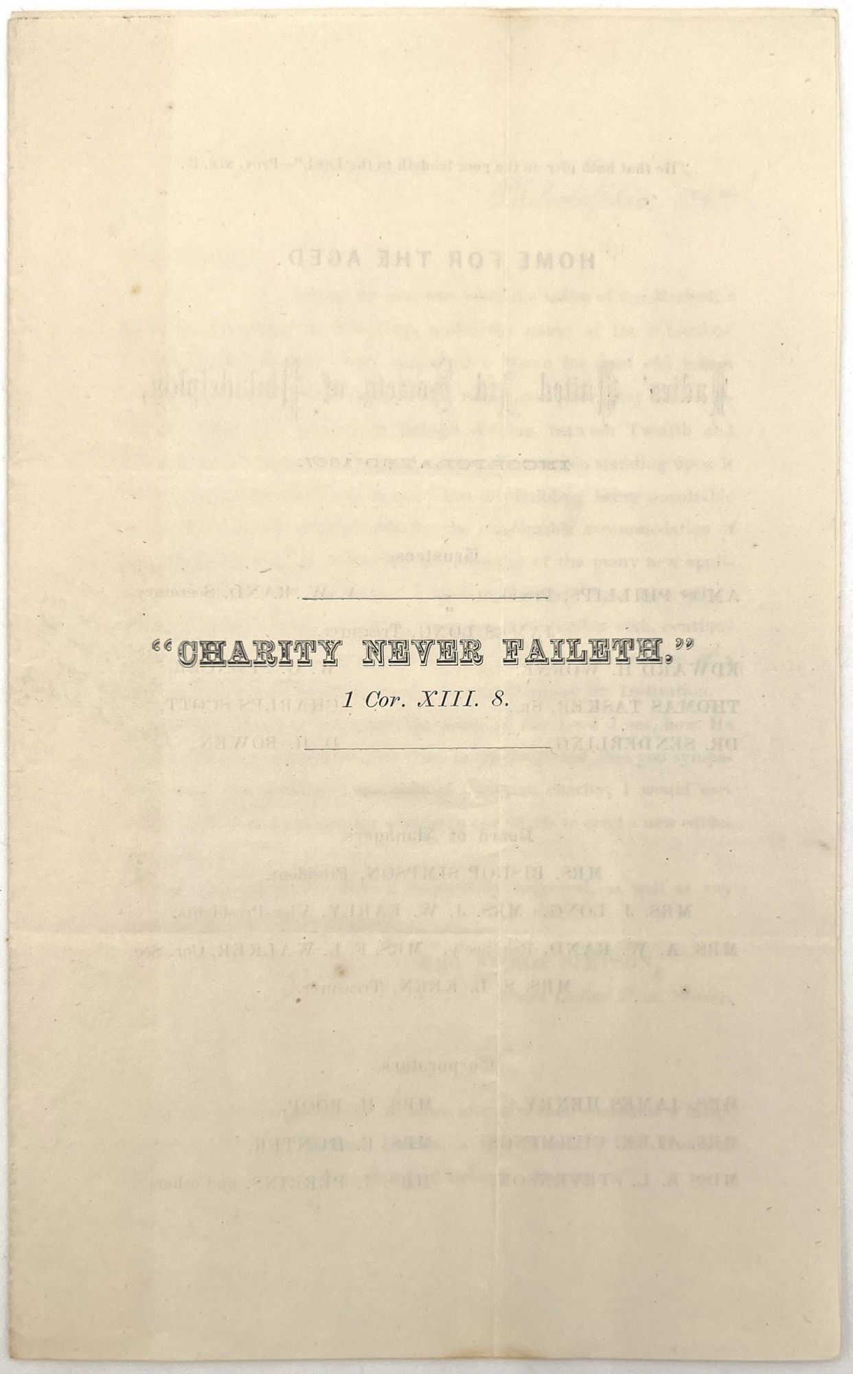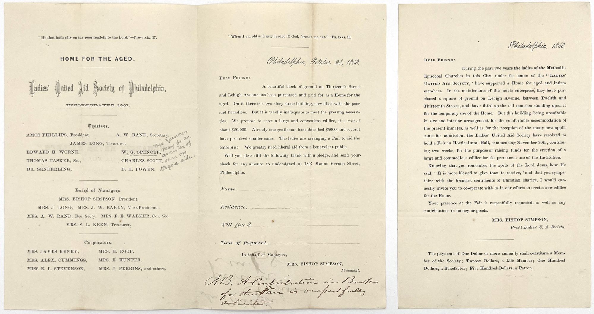 Philadelphia, Pennsylvania: Ladies' United Aid Society of Philadelphia, 1868. Very good to near-fine. Minor toning, vertical crease.. Printed circular soliciting contributions to the Ladies' United Aid Society of Philadelphia to help support their new "Home for the aged and infirm". Includes a list of trustees and managers, and a brief description of the lot purchased for the home on the corner of Thirteenth street and LeHigh Avenue. Also mentions an upcoming fair being organized to further raise funds.